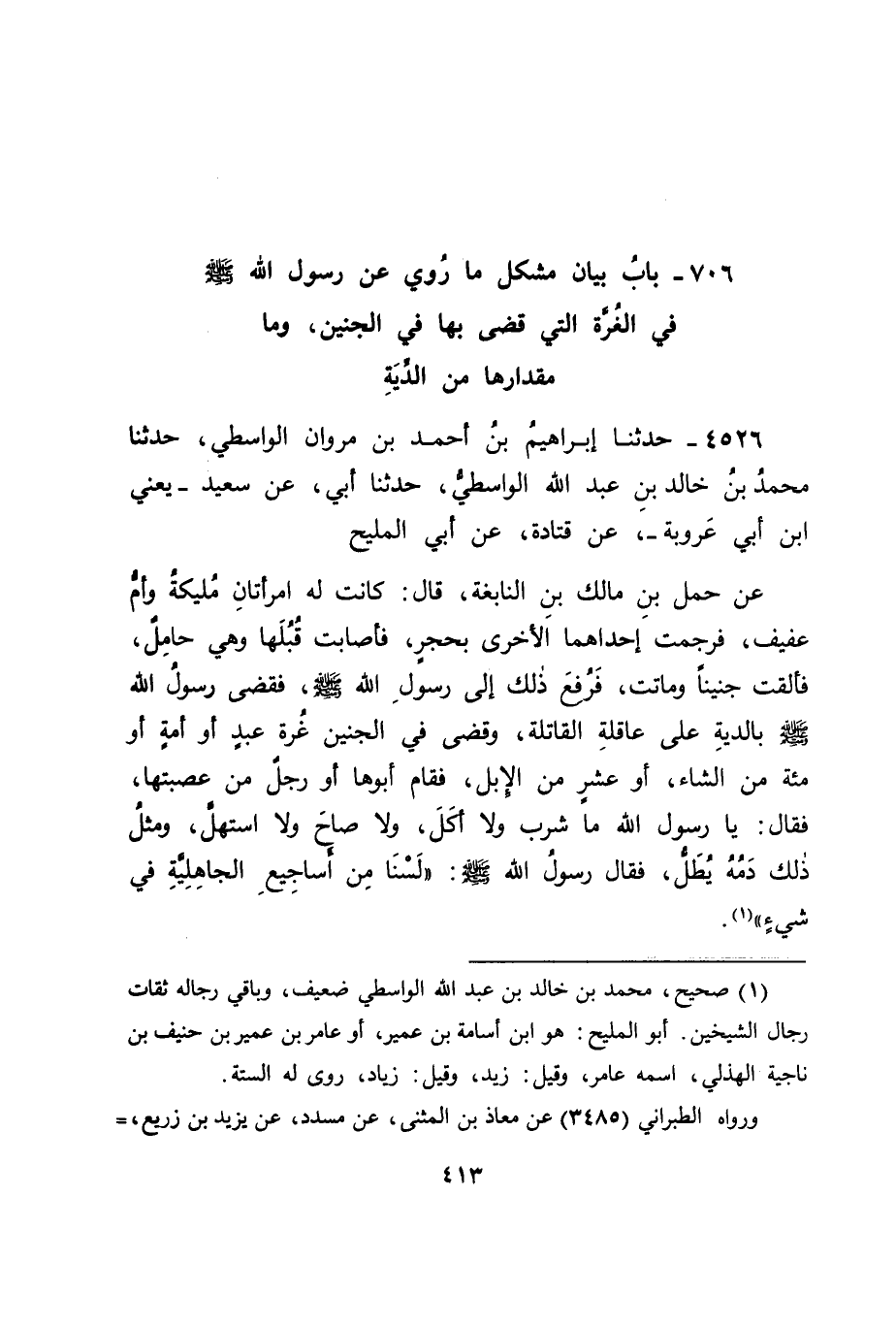 4526 - حَدَّثَنَا إِبْرَاهِيمُ بْنُ أَحْمَدَ بْنِ مَرْوَانَ الْوَاسِطِيُّ، حَدَّثَنَا مُحَمَّدُ بْنُ خَالِدِ بْنِ عَبْدِ اللهِ الْوَاسِطِيُّ، حَدَّثَنَا أَبِي، عَنْ سَعِيدٍ يَعْنِي ابْنَ أَبِي عَرُوبَةَ، عَنْ قَتَادَةَ، عَنْ أَبِي الْمَلِيحِ، عَنْ حَمَلِ بْنِ مَالِكِ بْنِ النَّابِغَةِ، قَالَ: كَانَتْ لَهُ امْرَأَتَانِ مُلَيْكَةُ وَأُمُّ عَفِيفٍ، فَرَجَمَتْ إِحْدَاهُمَا الْأُخْرَى بِحَجَرٍ فَأَصَابَتْ قُبُلَهَا وَهِيَ حَامِلٌ، فَأَلْقَتْ جَنِينًا وَمَاتَتْ، فَرُفِعَ ذَلِكَ إِلَى رَسُولِ اللهِ صَلَّى اللَّهُ عَلَيْهِ وَسَلَّمَ، فَقَضَى رَسُولُ اللهِ صَلَّى اللَّهُ عَلَيْهِ وَسَلَّمَ بِالدِّيَةِ عَلَى عَاقِلَةِ الْقَاتِلَةِ، وَقَضَى فِي الْجَنِينِ غُرَّةً: عَبْدًا أَوْ أَمَةً أَوْ مِائَةً مِنَ الشَّاءِ، أَوْ عْشًرا مِنَ الْإِبِلِ، فَقَامَ أَبُوهَا أَوْ رَجُلٌ مِنْ عَصَبَتِهَا، فَقَالَ: يَا رَسُولَ اللهِ مَا شَرِبَ وَلَا أَكَلَ، وَلَا صَاحَ وَلَا اسْتَهَلَّ، وَمِثْلُ ذَلِكَ دَمُهُ يُطَلُّ، فَقَالَ رَسُولُ اللهِ صَلَّى اللَّهُ عَلَيْهِ وَسَلَّمَ: " لَسْنَا مِنْ أَسَاجِيعِ الْجَاهِلِيَّةِ فِي شَيْءٍ " -[414]- فَتَأَمَّلْنَا هَذَا الْحَدِيثَ بَعْدَ وُقُوفِنَا عَلَى إِجْمَاعِ أَهْلِ الْعِلْمِ فِي مِقْدَارِ الْغُرَّةِ الْوَاجِبَةِ فِي الْجَنِينِ مِنَ الدِّيَةِ أَنَّهُ نِصْفُ عُشْرِهَا، فَوَجَدْنَا فِيهِ ذِكْرَ رَسُولِ اللهِ صَلَّى اللَّهُ عَلَيْهِ وَسَلَّمَ الْغُرَّةَ أَنَّهَا عَبْدٌ أَوْ أَمَةٌ، فَكَانَ فِي ذَلِكَ إِعْلَامُ النَّاسِ بِالْغُرَّةِ مَا هِيَ؟ ثُمَّ أَتْبَعَ ذَلِكَ بِقَوْلِهِ: أَوْ مِائَةً مِنَ الشَّاءِ " فَلَمْ يَكُنْ ذَلِكَ مِنَ الْغُرَّةِ فِي شَيْءٍ، وَلَكِنَّهُ الْجُزْءُ الَّذِي هُوَ مِقْدَارُ الْغُرَّةِ مِنَ الدِّيَةِ مِنَ الشَّاءِ مَا هُوَ؛ لَأَنَّ الدِّيَةَ مِنَ الشَّاءِ فِي قَوْلِ مَنْ يَجْعَلُ الشَّاءَ صِنْفًا مِنْ أَصْنَافِ الدِّيَاتِ أَلْفَا شَاةٍ، فَالْمِائَةُ مِنْهَا نِصْفُ عُشْرِهَا، وَمِمَّنْ كَانَ يَجْعَلُ الدِّيَةَ مِنَ الشَّاءِ هَذَا الْمِقْدَارَ أَبُو يُوسُفَ، وَمُحَمَّدُ بْنُ الْحَسَنِ، فَأَمَّا أَبُو حَنِيفَةَ، فَلَمْ يَكُنْ يَجْعَلُ الدِّيَةَ إِلَّا فِي الْإِبِلِ، وَفِي الدَّرَاهِمِ وَفِي الدَّنَانِيرِ خَاصَّةً. وَأَمَّا مَالِكٌ فَكَانَ يَجْعَلُهَا فِي الْإِبِلِ، وَفِي الدَّنَانِيرِ، وَفِي الدَّرَاهِمِ. وَأَمَّا الشَّافِعِيُّ، فَكَانَ يَجْعَلُهَا فِي الْإِبِلِ خَاصَّةً دُونَ مَا سِوَاهَا، وَكَانَ مَا رُوِيَ عَنْ رَسُولِ اللهِ صَلَّى اللَّهُ عَلَيْهِ وَسَلَّمَ فِي ذَلِكَ أَوْلَى، وَلَمْ يَكُنْ مَا كَانَ مِنْ رَسُولِ اللهِ صَلَّى اللَّهُ عَلَيْهِ وَسَلَّمَ فِي قَصْدِهِ بِالدِّيَةِ لِقَتِيلِ الْأَنْصَارِ إِلَى مِائَةٍ مِنَ -[415]- الْإِبِلِ، وَلَا بِقَوْلِهِ فِي قَتِيلِ خَطَأِ الْعَمْدِ فِيهِ مِائَةٌ مِنَ الْإِبِلِ، فَدَافَعَ أَنْ تَكُونَ الدِّيَةُ أَصْنَافًا غَيْرَ الْإِبِلِ، ثُمَّ قَالَ فِي هَذَا الْحَدِيثِ: " أَوْ عَشْرًا مِنَ الْإِبِلِ " فَكَانَ هَذَا عِنْدَنَا وَهْمًا فِي النَّقْلِ؛ لِخُرُوجِهِ عَنْ أَقْوَالِ الْعُلَمَاءِ جَمِيعًا؛ وَلِتَلَقِّيهِمْ إِيَّاهُ بِالْخِلَافِ لَهُ، وَكَانَ هَذَا الْحَدِيثُ إِنَّمَا دَارَ عَلَى أَبِي الْمَلِيحِ، فَمِمَّنْ رَوَاهُ عَنْهُ قَتَادَةُ كَمَا ذَكَرْنَا، وَقَدْ رَوَاهُ عَنْهُ أَيُّوبُ السَّخْتِيَانِيُّ.