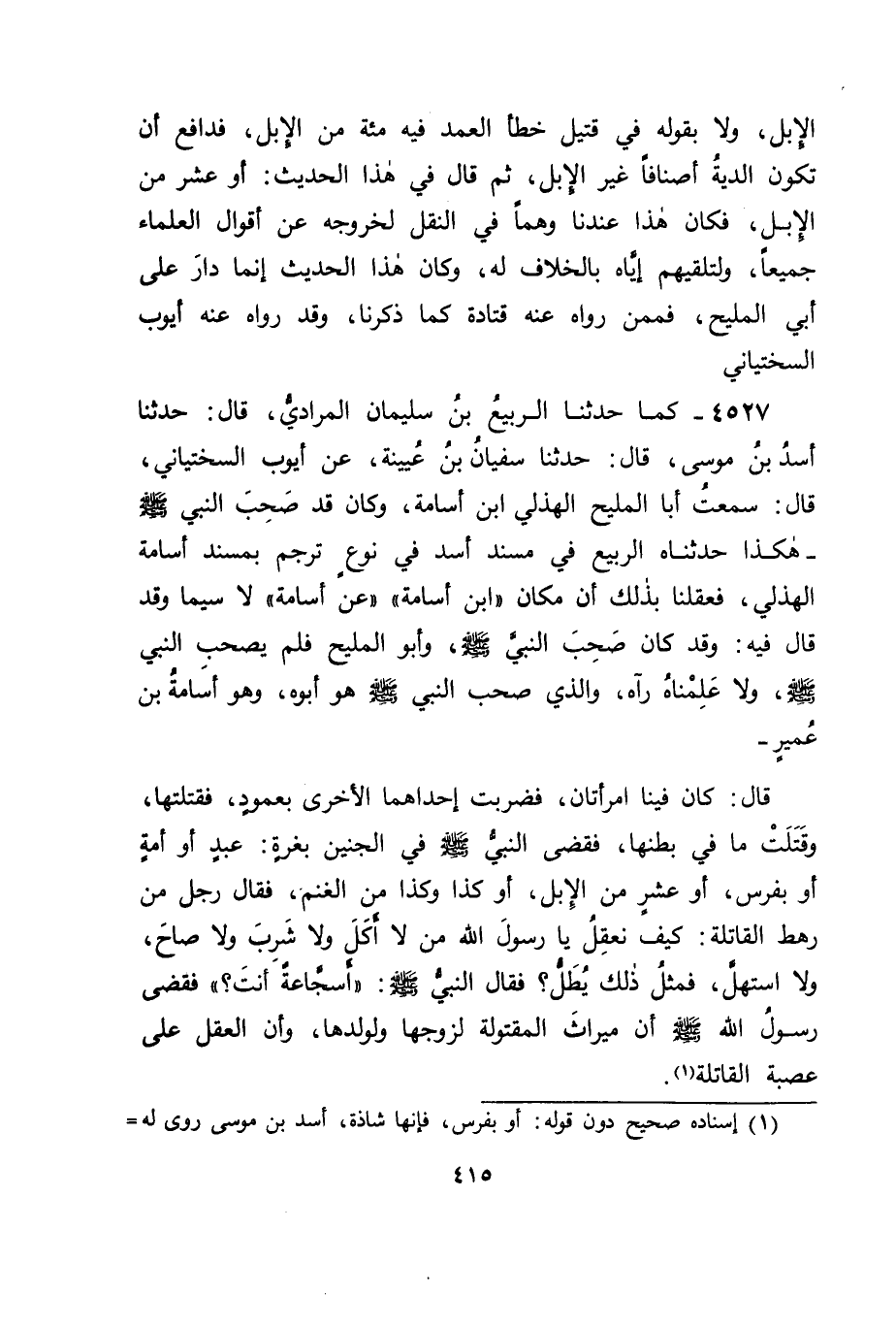 4527 - كَمَا حَدَّثَنَا الرَّبِيعُ بْنُ سُلَيْمَانَ الْمُرَادِيُّ، قَالَ: حَدَّثَنَا أَسَدُ بْنُ مُوسَى، قَالَ: حَدَّثَنَا سُفْيَانُ بْنُ عُيَيْنَةَ، عَنْ أَيُّوبَ السَّخْتِيَانِيِّ، قَالَ: سَمِعْتُ أَبَا الْمَلِيحِ الْهُذَلِيَّ ابْنَ أُسَامَةَ، وَكَانَ قَدْ صَحِبَ النَّبِيَّ صَلَّى اللَّهُ عَلَيْهِ وَسَلَّمَ، هَكَذَا حَدَّثَنَاهُ الرَّبِيعُ فِي مُسْنَدِ أَسَدٍ فِي نَوْعٍ تُرْجِمَ بِمُسْنَدِ أُسَامَةَ الْهُذَلِيِّ، فَعَقَلْنَا بِذَلِكَ أَنَّ مَكَانَ ابْنِ أُسَامَةَ: عَنْ أُسَامَةَ، لَا سِيَّمَا وَقَدْ قَالَ فِيهِ: وَقَدْ كَانَ صَحِبَ النَّبِيَّ صَلَّى اللَّهُ عَلَيْهِ وَسَلَّمَ، وَأَبُو الْمَلِيحِ فَلَمْ يَصْحَبِ النَّبِيَّ صَلَّى اللَّهُ عَلَيْهِ وَسَلَّمَ، وَلَا عَلِمْنَاهُ رَآهُ، وَالَّذِي صَحِبَ النَّبِيَّ صَلَّى اللَّهُ عَلَيْهِ وَسَلَّمَ هُوَ أَبُوهُ وَهُوَ أُسَامَةُ بْنُ عُمَيْرٍ، قَالَ: كَانَ فِينَا امْرَأَتَانِ، فَضَرَبَتْ إِحْدَاهُمَا الْأُخْرَى بِعَمُودٍ، فَقَتَلَتْهَا، وَقَتَلَتْ مَا فِي بَطْنِهَا، فَقَضَى النَّبِيُّ صَلَّى اللَّهُ عَلَيْهِ وَسَلَّمَ فِي الْجَنِينِ بِغُرَّةِ عَبْدٍ أَوِ أَمَةٍ أَوْ بِفَرَسٍ، أَوْ عَشْرٍ مِنَ الْإِبِلِ، أَوْ كَذَا وَكَذَا مِنَ الْغَنَمِ، فَقَالَ رَجُلٌ مِنْ رَهْطِ الْقَاتِلَةِ: كَيْفَ نَعْقِلُ يَا رَسُولَ اللهِ مَنْ لَا أَكَلَ وَلَا شَرِبَ وَلَا صَاحَ، وَلَا اسْتَهَلَّ، فَمِثْلُ ذَلِكَ يُطَلُّ؟ فَقَالَ النَّبِيُّ صَلَّى اللَّهُ عَلَيْهِ وَسَلَّمَ: " أَسَجَّاعَةٌ أَنْتَ؟ " فَقَضَى رَسُولُ اللهِ صَلَّى اللَّهُ عَلَيْهِ وَسَلَّمَ أَنَّ مِيرَاثَ الْمَقْتُولَةِ لِزَوْجِهَا وَلِوَلدِهَا، وَأَنَّ الْعَقْلَ عَلَى عَصَبَةِ الْقَاتِلَةِ -[416]- فَكَانَ فِي هَذَا الْحَدِيثِ زِيَادَةٌ مِنْ أَيُّوبَ عَلَى قَتَادَةَ، ذِكْرُ " الْفَرَسِ " وَكَانَ فِيهِ: " أَوْ عَشْرًا مِنَ الْإِبِلِ "، كَمَا فِي حَدِيثِ قَتَادَةَ، وَكَانَ ذَلِكَ عِنْدَنَا مِنْ حَدِيثِ أَيُّوبَ، كَمَا هُوَ مِنْ حَدِيثِ قَتَادَةَ فِي الْوَهْمِ فِي الْعَدَدِ الَّذِي ذُكِرَ فِيهِمَا مِنَ الْإِبِلِ؛ لِأَنَّهُ لَا اخْتِلَافَ بَيْنَ أَهْلِ الْعِلْمِ فِي مِقْدَارِ الدِّيَةِ مِنَ الْإِبِلِ أَنَّهُ مِائَةُ الْإِبِلِ، وَنِصْفُ الْعُشْرِ مِنْهَا إِنَّمَا هُوَ خَمْسٌ مِنَ الْإِبِلِ لَا عَشْرٌ مِنَ الْإِبِلِ، وَمِمَّنْ رَوَاهُ عَنْهُ أَيْضًا سَلَمَةُ بْنُ تَمَّامٍ، وَهُوَ أَبُو عَبْدِ اللهِ الشَّقَرِيُّ