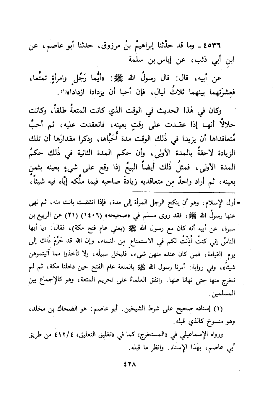 4536 - وَمَا قَدْ حَدَّثَنَا إِبْرَاهِيمُ بْنُ مَرْزُوقٍ، حَدَّثَنَا أَبُو عَاصِمٍ، عَنِ ابْنِ أَبِي ذِئْبٍ، عَنْ إِيَاسِ بْنِ سَلَمَةَ، عَنْ أَبِيهِ، قَالَ: قَالَ رَسُولُ اللهِ صَلَّى اللَّهُ عَلَيْهِ وَسَلَّمَ: " أَيُّمَا رَجُلٍ وَامْرَأَةٍ تَمَتَّعَا فَعِشْرَتُهُمَا بَيْنَهُمَا ثَلَاثُ لَيَالٍ، فَإِنْ أَحَبَّا أَنْ يَزْدَادَا ازْدَادَا " وَكَانَ فِي هَذَا الْحَدِيثِ فِي الْوَقْتِ الَّذِي كَانَتِ الْمُتْعَةُ طَلْقًا، وَكَانَتْ حَلَالًا أَنَّهَا إِذَا عُقِدَتْ عَلَى وَقْتٍ بِعَيْنِهِ، فَانْعَقَدَتْ عَلَيْهِ، ثُمَّ أَحَبَّ مُتَعَاقِدَاهَا أَنْ يَزِيدَا فِي ذَلِكَ الْوَقْتِ مُدَّةً أَحَبَّاهَا، وَذَكَرَا مِقْدَارَهَا أَنَّ تِلْكَ الزِّيَادَةَ لَاحِقَةٌ بِالْمُدَّةِ الْأُولَى، وَأَنَّ حُكْمَ الْمُدَّةِ الثَّانِيَةِ فِي ذَلِكَ حُكْمُ الْمُدَّةِ الْأُولَى، فَمِثْلُ ذَلِكَ أَيْضًا الْبَيْعُ إِذَا وَقَعَ عَلَى شَيْءٍ بِعَيْنِهِ بِثَمَنٍ بِعَيْنِهِ، ثُمَّ أَرَادَ وَاحِدٌ مِنْ مُتَعَاقِدَيْهِ زِيَادَةَ صَاحِبِهِ فِيمَا مَلَّكَهُ إِيَّاهُ فِيهِ شَيْئًا، -[429]- فَزَادَهُ إِيَّاهُ، وَقَبِلَهُ مِنْهُ أَنَّ تِلْكَ الزِّيَادَةَ لَاحِقَةٌ بِهِ، وَدَاخِلَةٌ فِي حُكْمِهِ، وَقَدْ رَوَيْنَا حَدِيثَ جَابِرٍ الَّذِي قَدْ رَوَيْنَاهُ فِي هَذَا الْبَابِ فِي تَثْبِيتِ هَذَا الْمَعْنَى: