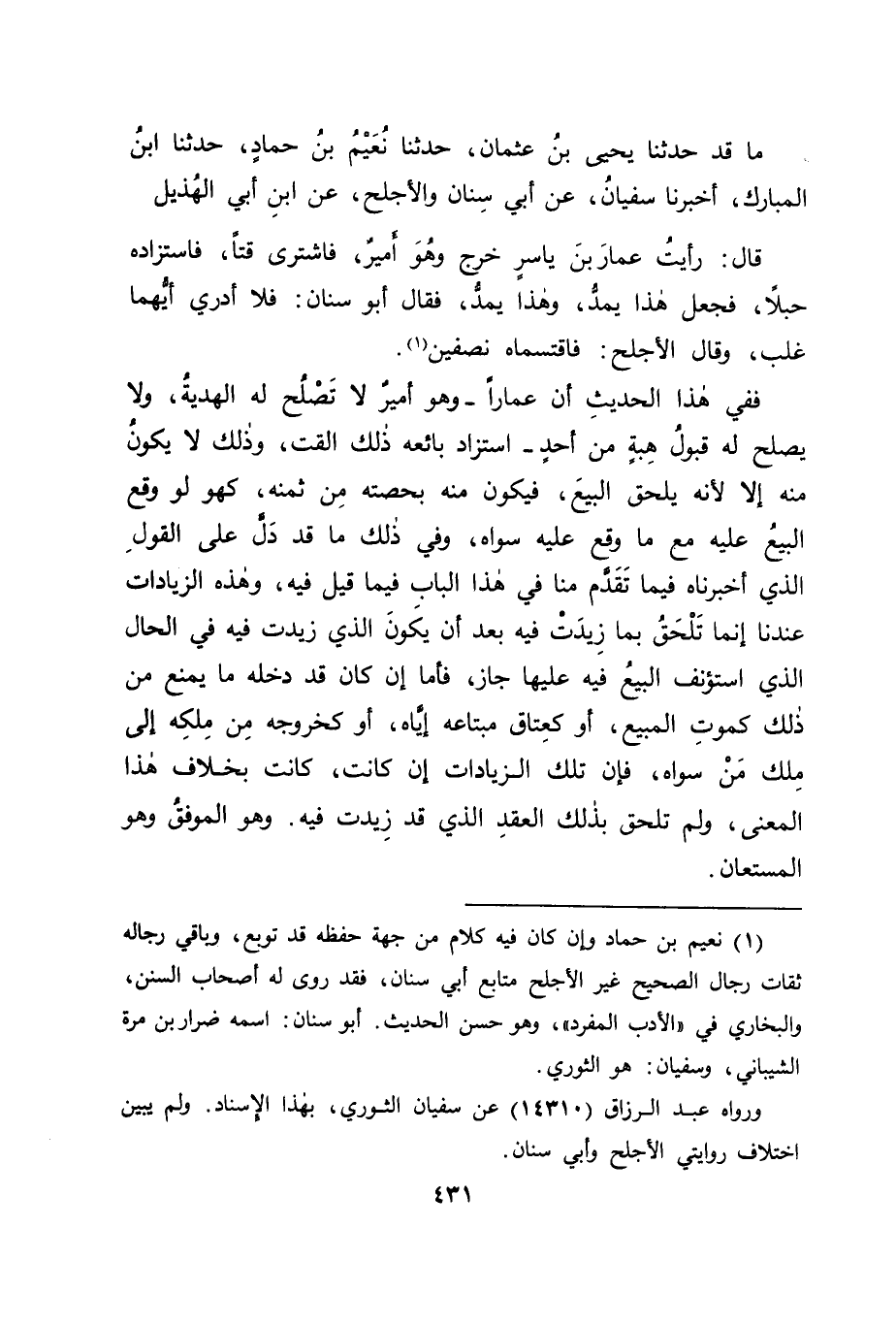 مَا قَدْ حَدَّثَنَا يَحْيَى بْنُ عُثْمَانَ، حَدَّثَنَا نُعَيْمُ بْنُ حَمَّادٍ، حَدَّثَنَا ابْنُ الْمُبَارَكُ، أَخْبَرَنَا سُفْيَانُ، عَنْ أَبِي سِنَانٍ وَالْأَجْلَحِ، عَنِ ابْنِ أَبِي الْهُذَيْلِ، قَالَ: " رَأَيْتُ عَمَّارَ بْنَ يَاسِرٍ خَرَجَ وَهُوَ أَمِيرٌ فَاشْتَرَى قَتًّا، فَاسْتَزَادَهُ حَبْلًا، فَجَعَلَ هَذَا يَمُدُّ، وَهَذَا يَمُدُّ " فَقَالَ أَبُو سِنَانٍ " فَلَا أَدْرِي أَيُّهُمَا غَلَبَ " وَقَالَ الْأَجْلَحُ: " فَاقْتَسَمَاهُ نِصْفَيْنِ " فَفِي هَذَا الْحَدِيثِ أَنَّ عَمَّارًا وَهُوَ أَمِيرٌ لَا تَصْلُحُ لَهُ الْهَدِيَّةُ، وَلَا يَصْلُحُ لَهُ قَبُولُ هِبَةٍ مِنْ أَحَدٍ اسْتَزَادَ بَائِعَهُ ذَلِكَ الْقَتَّ، وَذَلِكَ لَا يَكُونُ مِنْهُ إِلَّا لِأَنَّهُ يَلْحَقُ الْبَيْعَ، فَيَكُونُ مِنْهُ بِحِصَّتِهِ مِنْ ثَمَنِهِ، كَهُوَ لَوْ وَقَعَ الْبَيْعُ عَلَيْهِ مَعَ مَا وَقَعَ عَلَيْهِ سِوَاهُ، وَفِي ذَلِكَ مَا قَدْ دَلَّ عَلَى الْقَوْلِ الَّذِي أَخْبَرَنَاهُ فِيمَا تَقَدَّمَ مِنَّا فِي هَذَا الْبَابِ فِيمَا قِيلَ فِيهِ، وَهَذِهِ الزِّيَادَاتِ عِنْدَنَا إِنَّمَا تَلْحَقُ بِمَا زِيدَتْ فِيهِ بَعْدَ أَنْ يَكُونَ الَّذِي زِيدَتْ فِيهِ فِي الْحَالِ الَّذِي اسْتُؤْنِفَ الْبَيْعُ عَلَيْهَا جَازَ، فَأَمَّا إِنْ كَانَ قَدْ دَخَلَهُ مَا يَمْنَعُ مِنْ ذَلِكَ كَمَوْتِ الْمَبِيعِ، أَوْ كَعَتَاقِ مُبْتَاعِهِ إِيَّاهُ، أَوْ كَخُرُوجِهِ مِنْ مِلْكِهِ إِلَى مِلْكِ مَنْ سِوَاهُ، فَإِنَّ تِلْكَ الزِّيَادَاتِ إِنْ كَانَتْ، كَانَتْ بِخِلَافِ هَذَا الْمَعْنَى، وَلَمْ تَلْحَقْ بِذَلِكَ الْعِقْدِ الَّذِي قَدْ زِيدَتْ فِيهِ، وَهُوَ الْمُوَفِّقُ وَهُوَ الْمُسْتَعَانُ.