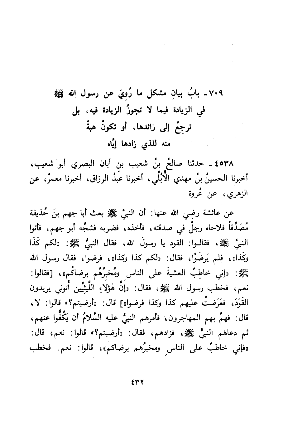 4538 - حَدَّثَنَا صَالِحُ بْنُ شُعَيْبِ بْنِ أَبَانَ الْبَصْرِيُّ أَبُو شُعَيْبٍ، أَخْبَرَنَا الْحُسَيْنُ بْنُ مَهْدِيٍّ الْأُبُلِّيُّ، أَخْبَرَنَا عَبْدُ الرَّزَّاقِ، أَخْبَرَنَا مَعْمَرٌ، عَنِ الزُّهْرِيِّ، عَنْ عُرْوَةَ، عَنْ عَائِشَةَ، رَضِيَ اللهُ عَنْهَا: أَنَّ النَّبِيَّ صَلَّى اللَّهُ عَلَيْهِ وَسَلَّمَ بَعَثَ أَبَا جَهْمِ بْنَ حُذَيْفَةَ مُصَدِّقًا، فَلَاحَاهُ رَجُلٌ فِي صَدَقَتِهِ، فَأَخَذَهُ فَضَرَبَهُ فَشَجَّهُ أَبُو جَهْمٍ، فَأَتَوَا النَّبِيَّ صَلَّى اللَّهُ عَلَيْهِ وَسَلَّمَ، فَقَالُوا: الْقَوَدُ يَا رَسُولَ اللهِ، فَقَالَ النَّبِيُّ صَلَّى اللَّهُ عَلَيْهِ وَسَلَّمَ: " لَكُمْ كَذَا وَكَذَا " فَلَمْ يَرْضَوْا، فَقَالَ: " لَكُمْ كَذَا وَكَذَا " فَرَضُوا، فَقَالَ رَسُولُ اللهِ صَلَّى اللَّهُ عَلَيْهِ وَسَلَّمَ: " إِنِّي خَاطِبٌ الْعَشِيَّةَ عَلَى النَّاسِ وَمُخْبِرُهُمْ بِرِضَاكُمْ " فَقَالُوا: نَعَمْ، فَخَطَبَ رَسُولُ اللهِ صَلَّى اللَّهُ عَلَيْهِ وَسَلَّمَ، فَقَالَ: " إِنَّ هَؤُلَاءِ اللَّيْثِيِّينَ أَتَوْنِي يُرِيدُونَ الْقَوَدَ، فَعَرَضْتُ عَلَيْهِمْ كَذَا وَكَذَا فَرَضُوا " قَالَ: " أَرَضِيتُمْ؟ " قَالُوا: لَا، قَالَ: فَهَمَّ بِهِمُ الْمُهَاجِرُونُ، فَأَمَرَهُمُ النَّبِيُّ عَلَيْهِ السَّلَامُ أَنْ يَكُفُّوا عَنْهُمْ، ثُمَّ دَعَاهُمُ النَّبِيُّ صَلَّى اللَّهُ عَلَيْهِ وَسَلَّمَ، فَزَادَهُمْ، فَقَالَ: " أَرَضِيتُمْ؟ " قَالُوا: نَعَمْ، قَالَ: " فَإِنِّي خَاطِبٌ عَلَى النَّاسِ وَمُخْبِرُهُمْ بِرِضَاكُمْ " قَالُوا: نَعَمْ، فَخَطَبَ -[433]- النَّاسَ، فَقَالَ: " أَرَضِيتُمْ؟ " قَالُوا: نَعَمْ فَفِي هَذَا الْحَدِيثِ مَعْنًى لَطِيفٌ مِنَ الْفِقْهِ يَجِبُ أَنْ يُوقَفَ عَلَيْهِ، وَيُوقَفَ بِهِ عَلَى أَنَّ الزِّيَادَةَ فِي هَذَا الْمَعْنَى بِخِلَافِ الزِّيَادَةِ فِي الْمَعْنَيَيْنِ اللَّذَيْنِ ذَكَرْنَاهُمَا فِي الْبَابِ الَّذِي قَبْلَ هَذَا الْبَابِ، وَذَلِكَ أَنَّ الزِّيَادَةَ فِي الْمَعْنَيَيْنِ اللَّذَيْنِ ذَكَرْنَاهُمَا فِي الْبَابِ الَّذِي قَبْلَ هَذَا الْبَابِ زِيَادَةٌ فِي بَيْعٍ قَدْ يَجُوزُ أَنْ يَتَنَاقَضَهُ مُتَعَاقِدَاهُ، ثُمَّ يَتَعَاقَدَانِهِ مِنْ ذِي قَبْلِ، وَتَزْوِيجٌ قَدْ يَجُوزُ أَنْ يَتَنَاقَضَاهُ، أَوْ يَتَعَاقَدَانِهِ مِنْ ذِي قَبْلٍ بِمَا يَتَعَاقَدَانِهِ، فَجَازَتْ فِي ذَلِكَ الزِّيَادَةُ، وَكَانَ الصُّلْحُ عَنْ أَبِي جَهْمِ بْنِ حُذَيْفَةَ مِمَّا لَا يَجُوزُ أَنْ يَتَنَاقَضَهُ رَسُولُ اللهِ صَلَّى اللَّهُ عَلَيْهِ وَسَلَّمَ وَالَّذِينَ صَالَحَهُمْ بِهِ عَنْهُ؛ لِأَنَّ رَجُلًا لَوْ شَجَّ رَجُلًا شَجَّةً، أَوْ جَنَى عَلَيْهِ جِنَايَةً، فَصَالَحَهُ مِنْهَا عَلَى شَيْءٍ أَوْ صُولِحَ عَنْهُ مِنْهَا عَلَى شَيْءٍ، ثُمَّ أَرَادَ مُتَعَاقِدَا ذَلِكَ الصُّلْحِ أَنْ يَتَنَاقَضَاهُ بَيْنَهُمَا أَنَّهُمَا لَا يَقْدِرَانِ عَلَى ذَلِكَ، وَأَنَّهُمَا إِنْ نَقَضَاهُ، لَمْ يَنْتَقِضْ، وَمَا هَذِهِ -[434]- سَبِيلُهُ، فَالزِّيَادَةُ فِيهِ غَيْرُ لَاحِقَةٍ بِأَصْلِهِ وَمُخْتَلَفٌ فِيهَا، فَطَائِفَةٌ مِنْ أَهْلِ الْعِلْمِ تَقُولُ: إِنَّهَا بَاطِلَةٌ، وَإِنَّهَا رَاجِعَةٌ إِلَى الَّذِي زَادَهَا، وَمِمَّنْ كَانَ يَقُولُ ذَلِكَ مِنْهُمْ أَبُو حَنِيفَةَ، وَأَبُو يُوسُفَ، وَطَائِفَةٌ مِنْهُمْ تَقُولُ: إِنَّهَا هِبَةٌ مِنَ الَّذِي زَادَهَا لِلَّذِي زَادَهَا إِيَّاهُ، فَإِنْ سَلَّمَهَا إِلَيْهِ جَازَتْ لَهُ، وَإِنْ مَنَعَهُ مِنْهَا لَمْ يُجْبَرْ عَلَى تَسْلِيمِهَا إِلَيْهِ، وَهَذَا مَعْنًى قَدْ ذَكَرَ عَبْدُ الرَّحْمَنِ بْنُ قَاسِمٍ مَا يَدُلُّ فِي جَوَابَاتِهِ اشْتِهَارُهُ عَنْ مَذْهَبِ مَالِكٍ فِيهِ، وَهُوَ قَوْلُ زُفَرَ فِيهِ، وَقَدْ مَالَ إِلَيْهِ مُحَم