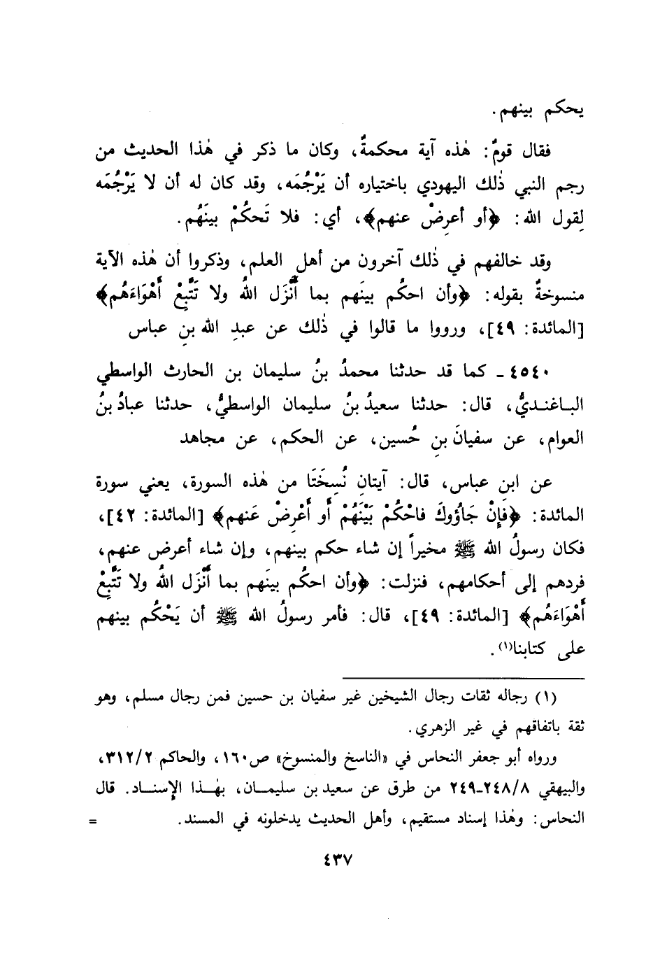 4540 - كَمَا قَدْ حَدَّثَنَا مُحَمَّدُ بْنُ سُلَيْمَانَ بْنِ الْحَارِثِ الْوَاسِطِيُّ الْبَاغَنْدِيُّ، قَالَ: حَدَّثَنَا سَعِيدُ بْنُ سُلَيْمَانَ الْوَاسِطِيُّ، حَدَّثَنَا عَبَّادُ بْنُ الْعَوَّامِ، عَنْ سُفْيَانَ بْنِ حُسَيْنٍ، عَنِ الْحَكَمِ، عَنْ مُجَاهِدٍ، عَنِ ابْنِ عَبَّاسٍ، قَالَ: " آيَتَانِ نُسِخَتَا مِنْ هَذِهِ السُّورَةِ، يَعْنِي سُورَةَ الْمَائِدَةِ: {فَإِنْ جَاءُوكَ فَاحْكُمْ بَيْنَهُمْ أَوْ أَعْرِضْ عَنْهُمْ} ، فَكَانَ رَسُولُ اللهِ صَلَّى اللَّهُ عَلَيْهِ وَسَلَّمَ مُخَيَّرًا إِنْ شَاءَ حَكَمَ بَيْنَهُمْ، وَإِنْ شَاءَ أَعْرَضَ عَنْهُمْ، فَرَدَّهُمْ إِلَى أَحْكَامِهِمْ، فَنَزَلَتْ: {وَأَنِ احْكُمْ بَيْنَهُمْ بِمَا أَنْزَلَ اللهُ وَلَا تَتَّبِعْ أَهْوَاءَهُمْ} [المائدة: 49] ، قَالَ: فَأُمِرَ رَسُولُ اللهِ صَلَّى اللَّهُ عَلَيْهِ وَسَلَّمَ أَنْ يَحْكُمَ بَيْنَهُمْ عَلَى -[438]- كِتَابِنَا " -[439]- قَالَ أَبُو جَعْفَرٍ: وَكَانَ حَدِيثُ ابْنِ عَبَّاسٍ هَذَا قَدْ حَقَّقَ نَسْخَ هَذِهِ الْآيَةِ بِالْآيَةِ الْمَتْلُوَّةِ فِي حَدِيثِهِ، وَكَانَ حُكْمُ مَنْ بَعْدَ النَّبِيِّ صَلَّى اللَّهُ عَلَيْهِ وَسَلَّمَ فِي ذَلِكَ مِنْ وُلَاةِ الْأُمُورِ عَلَى مِثْلِ الَّذِي كَانَ عَلَيْهِ النَّبِيُّ صَلَّى اللَّهُ عَلَيْهِ وَسَلَّمَ مِنْهَا فِي كُلِّ وَاحِدٍ مِنْ هَذَيْنِ الْقَوْلَيْنِ اللَّذَيْنِ ذَكَرْنَاهُمَا، وَكَانَ الْأَوْلَى بِالْأَحْكَامِ فِي ذَلِكَ عِنْدَنَا وَاللهُ أَعْلَمُ هُوَ الْحُكْمُ بَيْنَهُمْ لَوْ لَمْ تَكُنِ الْآيَةُ مَنْسُوخَةً، لَا الْإِعْرَاضُ عَنْهُمْ؛ لِأَنَّهُمْ إِذَا حَكَمُوا بَيْنَهُمْ، شَهِدَ لَهُمُ الْفَرِيقَانِ اللَّذَانِ ذَكَرْنَا بِالنَّجَاةِ وَتَرْكِ مَفْرُوضٍ عَلَيْهِمْ فِي ذَلِكَ؛ لِأَنَّ مَنْ يَقُولُ: إِنَّهُمْ حَكَمُوا: وَعَلَيْهِمْ أَنْ يَحْكُمُوا بِهِ، يَقُولُ: قَدْ أَدُّوا الْمُفْتَرَضَ عَلَيْهِمْ فِي ذَلِكَ، وَيَقُولُ الْآخَرُونَ: قَدْ حَكَمُوا بِمَا لَهُمْ أَنْ يَحْكُمُوا بِهِ، وَخَرَجَ الْحُكَّامُ بِذَلِكَ عِنْدَهُمْ مِنْ تَرْكِ مُفْتَرَضٍ إِنْ كَانَ عَلَيْهِمْ فِيهِ، وَإِذَا أَعْرَضُوا عَنْهُمْ، وَتَرَكُوا الْحُكْمَ بَيْنَهُمْ، فَأَحَدُ الْفَرِيقَيْنِ يَقُولُ: قَدْ تَرَكُوا مُفْتَرَضًا عَلَيْهِمْ، وَالْفَرِيقُ الْآخَرُ يَقُولُ: قَدْ تَرَكُوا مَا لَهُمْ تَرْكُهُ، وَكَانَ مَا يُوجِبُ النَّجَاةَ لَهُمْ عِنْدَ الْفَرِيقَيْنِ جَمِيعًا أَوْلَى بِهِمْ مِمَّا يُوجِبُ لَهُمُ النَّجَاةَ عِنْدَ أَحَدِ الْفَرِيقَيْنِ، وَلَا يُوجِبُهُ لَهُمْ عِنْدَ الْفَرِيقِ الْآخَرِ، هَذَا لَوْ لَمْ تَكُنِ الْآيَةُ -[440]- مَنْسُوخَةً، فَإِذًا وَجَبَ بِحَدِيثِ ابْنِ عَبَّاسٍ الَّذِي ذَكَرْنَا مَعَ اتِّصَالِ إِسْنَادِهِ، وَحُسْنِ سِيَاقَتِهِ أَنْ تَكُونَ مَنْسُوخَةً بِالْآيَةِ الَّتِي تَلَوْنَا بَعْدَهَا، كَانَ الْحُكْمُ بَيْنَهُمْ أَوْلَى، وَكَانَ التَّمَسُّكُ بِهَا أَحْرَى، وَوَجَدْنَا قَوْلَهُ تَعَالَى: {وَأَنِ احْكُمْ بَيْنَهُمْ بِمَا أَنْزَلَ اللهُ} [المائدة: 49] يَحْتَمِلُ أَنْ يَكُونَ الْمُرَادُ: وَأَنِ احْكُمْ بَيْنَهُمْ بِمَا أَنْزَلَ اللهُ إِذَا تَحَاكَمُوا إِلَيْكَ، وَأَنْ يَكُونَ عَلَى مَعْنَى: وَأَنِ احْكُمْ بَيْنَهُمْ بِمَا أَنْزَلَ اللهُ بِوُقُوفِكَ عَلَى مَا كَانَ بَيْنَهُمْ مِمَّا يُوجِبُ ذَلِكَ الْحُكْمَ عَلَيْهِمْ وَإِنْ لَمْ يَتَحَاكَمُوا إِلَيْكَ. فَنَظَرْنَا: هَلْ رُوِيَ فِي ذَلِكَ مَا يَدُلُّ عَلَى أَحَدِ هَذَيْنِ الِاحْتِمَالَيْنِ؟