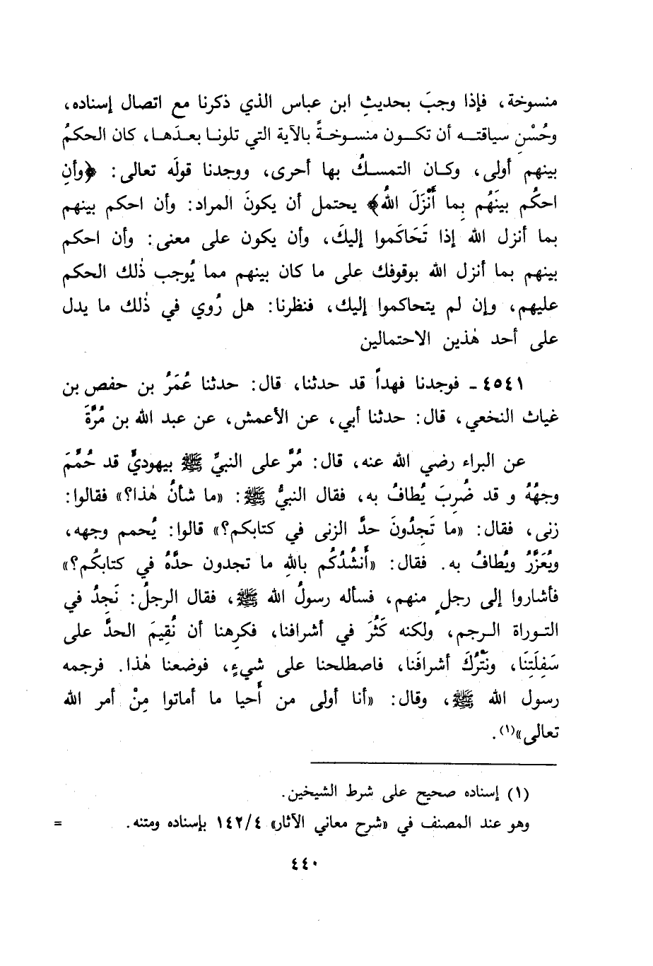 4541 - فَوَجَدْنَا فَهْدًا قَدْ حَدَّثَنَا، قَالَ: حَدَّثَنَا عُمَرُ بْنُ حَفْصِ بْنِ غِيَاثٍ النَّخَعِيُّ، قَالَ: حَدَّثَنَا أَبِي، عَنِ الْأَعْمَشِ، عَنْ عَبْدِ اللهِ بْنِ مُرَّةَ، عَنِ الْبَرَاءِ، رَضِيَ اللهُ عَنْهُ، قَالَ: مُرَّ عَلَى النَّبِيِّ صَلَّى اللَّهُ عَلَيْهِ وَسَلَّمَ بِيَهُودِيٍّ قَدْ حُمِّمَ وَجْهُهُ، وَقَدْ ضُرِبَ يُطَافُ بِهِ، فَقَالَ النَّبِيُّ صَلَّى اللَّهُ عَلَيْهِ وَسَلَّمَ: " مَا شَأْنُ هَذَا؟ " فَقَالُوا: زَنَى، فَقَالَ: " مَا تَجِدُونَ حَدَّ الزِّنَى فِي كِتَابِكُمْ؟ " قَالُوا: يُحَمَّمُ وَجْهُهُ، وَيُعَزَّرُ وَيُطَافُ بِهِ، فَقَالَ: " أَنْشُدُكُمْ بِاللهِ، مَا تَجِدُونَ حَدَّهُ فِي كِتَابِكُمْ؟ " فَأَشَارُوا إِلَى رَجُلٍ مِنْهُمْ، فَسَأَلَهُ رَسُولُ اللهِ صَلَّى اللَّهُ عَلَيْهِ وَسَلَّمَ، فَقَالَ الرَّجُلُ: نَجِدُ فِي التَّوْرَاةِ الرَّجْمَ، وَلَكِنَّهُ كَثُرَ فِي أَشْرَافِنَا، فَكَرِهْنَا أَنْ نُقِيمَ الْحَدَّ عَلَى سِفْلَتِنَا وَنَتْرُكَ أَشْرَافَنَا، فَاصْطَلَحْنَا عَلَى شَيْءٍ، فَوَضَعْنَا هَذَا، فَرَجَمَهُ رَسُولُ اللهِ صَلَّى اللَّهُ عَلَيْهِ وَسَلَّمَ، وَقَالَ: " أَنَا أَوْلَى مَنْ أَحْيَا مَا أَمَاتُوا مِنْ أَمْرِ اللهِ تَعَالَى " -[441]- وَكَانَ فِي هَذَا الْحَدِيثِ أَنَّ رَسُولَ اللهِ صَلَّى اللَّهُ عَلَيْهِ وَسَلَّمَ رَجَمَ ذَلِكَ الْيَهُودِيَّ بِلَا تَحَاكُمٍ مِنَ الْيَهُودِ إِلَيْهِ فِيهِ، فَدَلَّ ذَلِكَ عَلَى أَنَّ أَوْلَى الِاحْتِمَالَيْنِ بِالْآيَةِ الَّتِي تَلَوْنَاهَا الْمُوَافِقُ لِهَذَا الْحَدِيثِ مِنْهُمَا، وَأَنَّ الْمُرَادَ بِقَوْلِهِ: {وَأَنِ احْكُمْ بَيْنَهُمْ بِمَا أَنْزَلَ اللهُ وَلَا تَتَّبِعْ أَهْوَاءَهُمْ} [المائدة: 49] ، أَيْ: وَأَنِ احْكُمْ عَلَيْهِمْ بِمَا أُنْزِلَ عَلَيْكَ فِي الْكِتَابِ الَّذِي أُنْزِلَ عَلَيْكَ بَعْدَ عِلْمِكَ بِوُجُوبِ ذَلِكَ عَلَى مَنْ يُحْكَمُ بِهِ عَلَيْهِ تَحَاكَمُوا فِي ذَلِكَ قَبْلَ أَنْ تَحْكُمَ بَيْنَهُمْ فِيهِ أَوْ لَمْ يَتَحَاكَمُوا إِلَيْكَ فِيهِ، وَاللهَ نَسْأَلُهُ التَّوْفِيقَ.