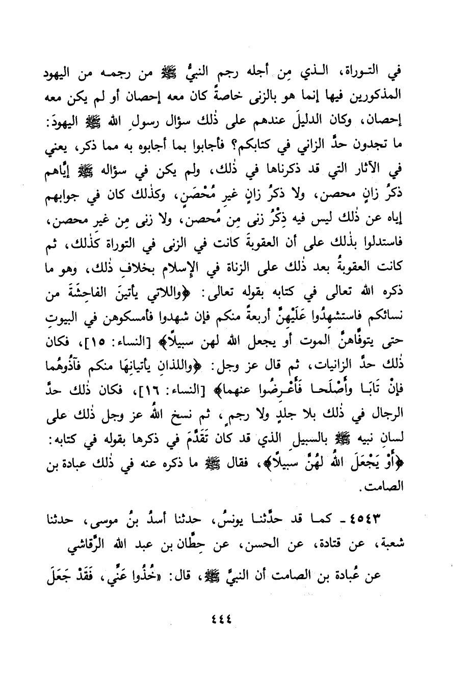 4543 - كَمَا قَدْ حَدَّثَنَا يُونُسُ، حَدَّثَنَا أَسَدُ بْنُ مُوسَى، حَدَّثَنَا شُعْبَةُ، عَنْ قَتَادَةَ، عَنِ الْحَسَنِ، عَنْ حِطَّانَ بْنِ عَبْدِ اللهِ الرَّقَاشِيِّ، عَنْ عُبَادَةَ بْنِ الصَّامِتِ: أَنَّ النَّبِيَّ صَلَّى اللَّهُ عَلَيْهِ وَسَلَّمَ، قَالَ: " خُذُوا عَنِّي، فَقَدْ جَعَلَ -[445]- اللهُ لَهُنَّ سَبِيلًا، الْبِكْرُ يُجْلَدُ وَيُنْفَى، وَالثَّيِّبُ يُجْلَدُ وَيُرْجَمُ "