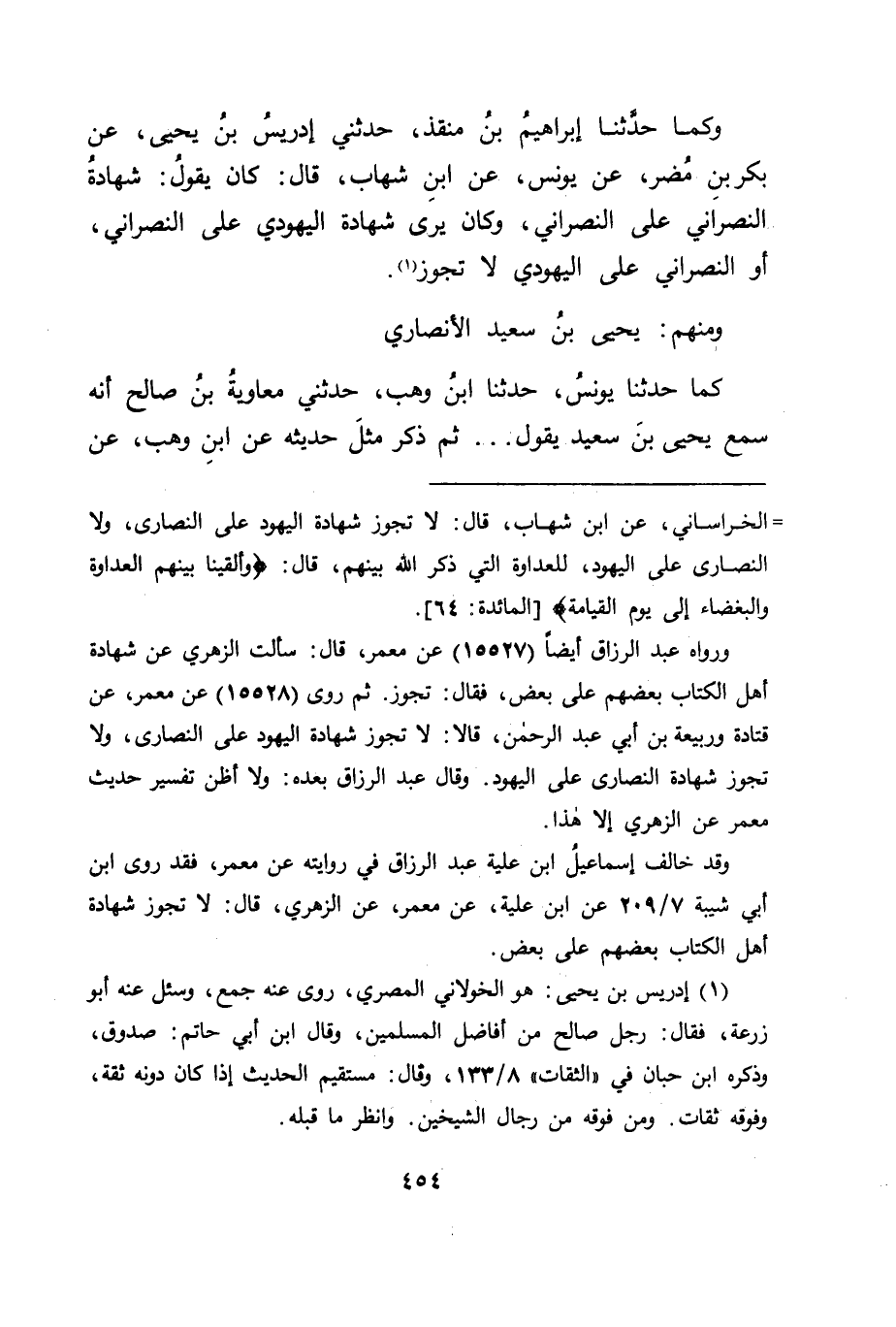 وَكَمَا حَدَّثَنَا إِبْرَاهِيمُ بْنُ مُنْقِذٍ، حَدَّثَنِي إِدْرِيسُ بْنُ يَحْيَى، عَنْ بَكْرِ بْنِ مُضَرَ، عَنْ يُونُسَ، عَنِ ابْنِ شِهَابٍ، قَالَ: كَانَ يَقُولُ: " شَهَادَةُ النَّصْرَانِيِّ عَلَى النَّصْرَانِيِّ، وَكَانَ يَرَى شَهَادَةَ الْيَهُودِيِّ عَلَى النَّصْرَانِيِّ، أَوِ النَّصْرَانِيِّ عَلَى الْيَهُودِيِّ لَا تَجُوزُ " وَمِنْهُمْ: يَحْيَى بْنُ سَعِيدٍ الْأَنْصَارِيُّ. كَمَا حَدَّثَنَا يُونُسُ، حَدَّثَنَا ابْنُ وَهْبٍ، حَدَّثَنِي مُعَاوِيَةُ بْنُ صَالِحٍ أَنَّهُ سَمِعَ يَحْيَى بْنَ سَعِيدٍ يَقُولُ، ثُمَّ ذَكَرَ مِثْلَ حَدِيثِهِ عَنِ ابْنِ وَهْبٍ، عَنْ -[455]- يُونُسَ، عَنِ ابْنِ شِهَابٍ سَوَاءً. قَالَ أَبُو جَعْفَرٍ: وَقَدْ تَمَسَّكَ بِذَلِكَ مِنْ قَوْلِهُمُ اللَّيْثُ بْنُ سَعْدٍ. كَمَا قَدْ حَدَّثَنَا يُونُسُ، حَدَّثَنَا ابْنُ وَهْبٍ، قَالَ: سَمِعْتُ اللَّيْثَ يَقُولُ ذَلِكَ، يَعْنِي مِثْلَ الَّذِي ذَكَرَهُ، عَنِ ابْنِ شِهَابٍ وَيَحْيَى بْنِ سَعِيدٍ. قَالَ أَبُو جَعْفَرٍ: وَهَؤُلَاءِ أَئِمَّةُ الْأَمْصَارِ وَفُقَهَاؤُهُمْ. وَقَدْ سَمِعْتُ يُونُسَ يَقُولُ: سَمِعْتُ ابْنَ وَهْبٍ يَقُولُ: خَالَفَ مَالِكُ بْنُ أَنَسٍ مُعَلِّمِيهِ فِي رَدِّ شَهَادَةِ النَّصَارَى بَعْضِهِمْ عَلَى بَعْضٍ، كَانَ ابْنُ شِهَابٍ، وَيَحْيَى بْنُ سَعِيدٍ وَرَبِيعَةُ يُجِيزُونَهَا قَالَ أَبُو جَعْفَرٍ: وَلَقَدْ سَمِعْتُ أَحْمَدَ بْنَ أَبِي عِمْرَانَ يَقُولُ: سَمِعْتُ يَحْيَى بْنَ أَكْثَمَ يَقُولُ وَذَكَرَ هَذَا الْبَابَ، فَقَالَ: جَمَعْتُ فِيهِ قَوْلَ مِائَةِ فَقِيهٍ مِنَ الْمُتَقَدِّمِينَ فِي قَبُولِ شَهَادَاتِ أَهْلِ الْكِتَابِ بَعْضِهِمْ عَلَى بَعْضٍ، وَمَا وَجَدْتُ فِيهِ اخْتِلَافًا مِنْ أَمْثَالِهِمْ لَهُمْ فِي ذَلِكَ إِلَّا عَنْ رَبِيعَةَ، فَإِنِّي وَجَدْتُ عَنْهُ قَبُولَهَا، وَوَجَدْتُ عَنْهُ رَدَّهَا. وَقَالَ قَائِلٌ: كَيْفَ يَجُوزُ قَبُولُ شَهَادَتِهِمْ مَعَ الْكُفْرِ الَّذِي هُمْ عَلَيْهِ بِاللهِ عَزَّ وَجَلَّ؟ قَالَ: وَإِذَا كَانَ فُسَّاقُنَا بِمَا هُوَ دُونَ الْكُفْرِ لَا تُقْبَلُ شَهَادَتُهُمْ، كَانَ الْكُفَّارُ مِنْ غَيْرِنَا أَحْرَى أَنْ لَا تُقْبَلَ شَهَادَتُهُمْ. فَكَانَ جَوَابَنَا لَهُ فِي ذَلِكَ: أَنَّ الْكُفْرَ الَّذِي أَهْلُ الْكِتَابِ عَلَيْهِ، لَمْ -[456]- يُخْرِجْهُمْ مِنْ حَالِ وِلَايَةِ بَعْضِهِمْ بَعْضًا فِي تَزْوِيجِ بَنَاتِهِمْ، وَفِي الْوَلَايَةِ عَلَى صِغَارِهِمْ مِمَّنْ هُمْ آبَاؤُهُمْ فِي الْبَيْعِ لَهُمْ، وَفِي الِابْتِيَاعِ لَهُمْ، وَكَانَ مِثْلُ ذَلِكَ لَا يَجُوزُ مِنْ فُسَّاقِنَا فِي أَمْثَالِ مَنْ ذَكَرْنَا مِنْ أَبْنَائِهِمْ، وَكَانَ مَنْ كَانَ مِنْ فُسَّاقِنَا وَاجِبٌ عَلَيْنَا مُنَابَذَتُهُ، وَتَرْكُ إِقْرَارِهِ عَلَى مَا هُوَ عَلَيْهِ مِنْ فِسْقِهِ حَتَّى نُزِيلَهُ عَنْهُ إِلَى الْوَاجِبِ عَلَيْهِ بِالشَّرِيعَةِ الَّتِي هُوَ مِنْ أَهْلِهَا، وَكَانَ أَهْلُ الْكِتَابِ بِخِلَافِ ذَلِكَ، إِذْ كَانُوا مُخَلِّينَ عَلَى حُكْمِ شَرِيعَتِهِمْ غَيْرَ مَأْخُوذِينَ بِتَرْكِ ذَلِكَ، وَلَا بِالزَّوَالِ عَنْهُ إِلَى غَيْرِهِ، وَإِذَا كَانُوا فِيمَا ذَكَرْنَا كَذَلِكَ، كَانُوا بِخِلَافِ الْفُسَّاقِ مِنَّا، وَكَانُوا فِي سَائِرِ مَا فِي شَرِيعَتِهِمْ كَنَحْنُ فِي مَا تُوجِبُهُ شَرِيعَتُنَا، وَمِمَّنْ كَانَ يَذْهَبُ إِلَى هَذَا الْقَوْلِ: أَبُو حَنِيفَةَ، وَابْنُ أَبِي لَيْلَى، وَالثَّوْرِيُّ، وَسَائِرُ الْكُوفِيِّينَ سِوَاهُمْ، إِلَّا مَا يَخْتَلِفُونَ فِيهِ مِنْ مِلَلِهِمْ إِذَا اخْتَلَفَتْ، فَإِنَّ أَبَا حَنِيفَةَ كَانَ لَا يُرَاعِي ذَلِكَ، وَتَابَعَهُ عَلَيْهِ أَصْحَابُهُ، وَكَانَ ابْنُ أَبِي لَيْلَى وَكَثِيرٌ مِنْهُمْ يُخَالِفُونَهُمْ فِي ذَلِكَ، 