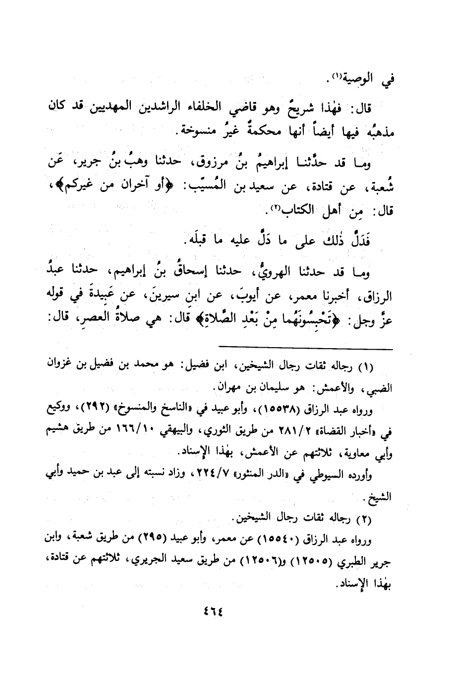 وَمَا قَدْ حَدَّثَنَا الْهَرَوِيُّ، حَدَّثَنَا إِسْحَاقُ بْنُ إِبْرَاهِيمَ، حَدَّثَنَا عَبْدُ الرَّزَّاقِ، أَخْبَرَنَا مَعْمَرٌ، عَنْ أَيُّوبَ، عَنِ ابْنِ سِيرِينَ، عَنْ عَبِيدَةَ فِي قَوْلِهِ عَزَّ وَجَلَّ: {تَحْبِسُونَهُمَا مِنْ بَعْدِ الصَّلَاةِ} [المائدة: 106] قَالَ: " هِيَ صَلَاةُ الْعَصْرِ " قَالَ: -[465]- وَقَالَ مَعْمَرٌ: قَالَ قَتَادَةُ مِثْلَهُ