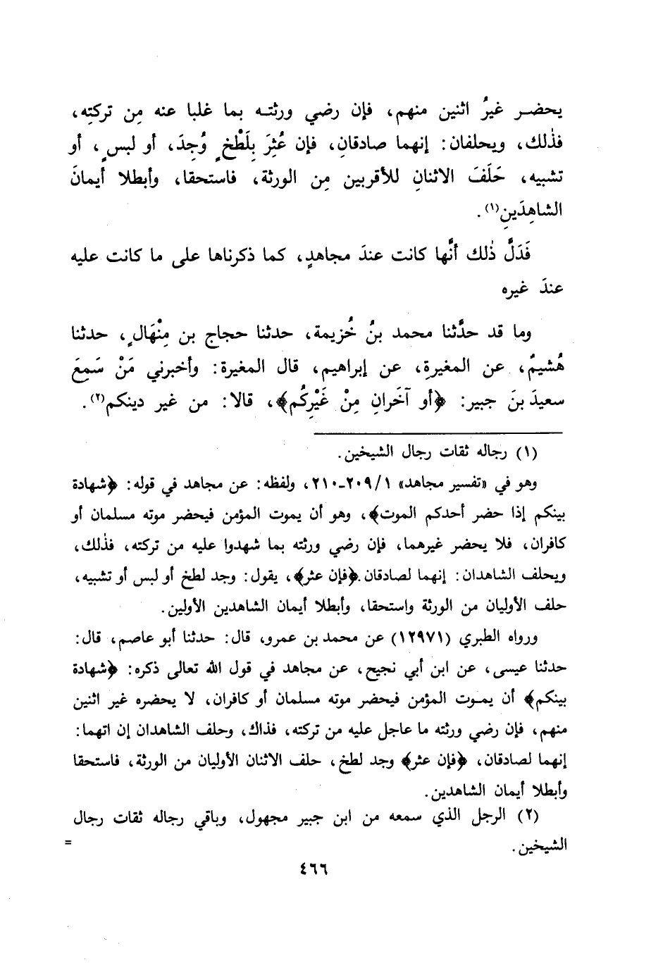 وَمَا قَدْ حَدَّثَنَا مُحَمَّدُ بْنُ خُزَيْمَةَ، حَدَّثَنَا حَجَّاجُ بْنُ مِنْهَالٍ، حَدَّثَنَا هُشَيْمٌ، عَنِ الْمُغِيرَةِ، عَنْ إِبْرَاهِيمَ، قَالَ الْمُغِيرَةُ: وَأَخْبَرَنِي مَنْ، سَمِعَ سَعِيدَ بْنَ جُبَيْرٍ: {أَوْ آخَرَانِ مِنْ غَيْرِكُمْ} [المائدة: 106] ، قَالَا: " مِنْ غَيْرِ دِينِكُمْ " -[467]- وَمَا قَدْ حَدَّثَنَا مُحَمَّدٌ، حَدَّثَنَا حَجَّاجٌ، حَدَّثَنَا أَبُو هِلَالٍ الرَّاسِبِيُّ، عَنْ مُحَمَّدِ بْنِ سِيرِينَ مِثْلَهُ. فَدَلَّ ذَلِكَ أَنَّهَا كَانَتْ عِنْدَ إِبْرَاهِيمَ، وَسَعِيدِ بْنِ جُبَيْرٍ، وَابْنِ سِيرِينَ كَذَلِكَ أَيْضًا. فَكَانَ جَوَابَنَا لَهُ فِي ذَلِكَ: أَنَّ الَّذِيَ ذَكَرَهُ كَمَا ذَكَرَهُ أَنَّ الْقَوْلَ فِيهِ هُوَ الْقَوْلُ فِي هَذِهِ الْآثَارِ، وَقَدْ قَالَ بِهِ مِنْ فُقَهَاءِ الْأَمْصَارِ ابْنُ أَبِي لَيْلَى. كَمَا حَدَّثَنَا جَعْفَرُ بْنُ أَحْمَدَ بْنِ الْوَلِيدِ، حَدَّثَنَا بِشْرُ بْنُ الْوَلِيدِ، قَالَ: سَمِعْتُ أَبَا يُوسُفَ يَقُولُ: وَكَانَ ابْنُ أَبِي لَيْلَى يَقُولُ فِي ذَلِكَ، فَذَكَرَ مِثْلَ الْقَوْلِ الَّذِي ذَكَرْنَاهُ عَنْ مَنْ تَقَدَّمَ فِي هَذَا الْبَابِ. وَقَالَ بِهِ الْأَوْزَاعِيُّ.