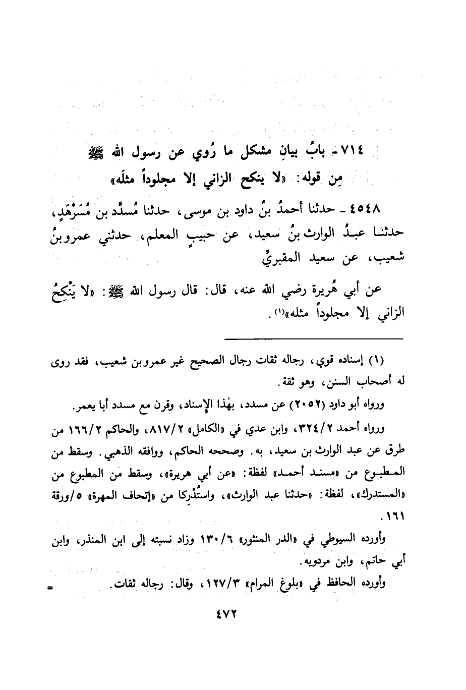 4548 - حَدَّثَنَا أَحْمَدُ بْنُ دَاوُدَ بْنِ مُوسَى، حَدَّثَنَا مُسَدَّدُ بْنُ مُسَرْهَدٍ، حَدَّثَنَا عَبْدُ الْوَارِثِ بْنُ سَعِيدٍ، عَنْ حَبِيبٍ الْمُعَلِّمِ، حَدَّثَنِي عَمْرُو بْنُ شُعَيْبٍ، عَنْ سَعِيدٍ الْمَقْبُرِيِّ، عَنْ أَبِي هُرَيْرَةَ، رَضِيَ اللهُ عَنْهُ، قَالَ: قَالَ رَسُولُ اللهِ صَلَّى اللَّهُ عَلَيْهِ وَسَلَّمَ: " لَا يَنْكِحُ الزَّانِي إِلَّا مَجْلُودًا مِثْلَهُ " -[473]- هَكَذَا حَدَّثَنَا أَحْمَدُ بْنُ دَاوُدَ هَذَا الْحَدِيثَ، وَكَانَ ذَلِكَ عِنْدَنَا، وَاللهُ أَعْلَمُ، عَلَى الْمَجْلُودِ فِي الزَّانِي الْمُقِيمِ بَعْدَ الْجَلْدِ عَلَى الزِّنَى الَّذِي كَانَ جُلِدَ فِيهِ، لَا عَلَى تَرْكٍ مِنْهُ لِذَلِكَ، وَلَا نُزُوعٍ مِنْهُ عَنْهُ؛ لِأَنَّ وَصْفَهُ صَلَّى اللَّهُ عَلَيْهِ وَسَلَّمَ -[474]- إِيَّاهُ بِالْجَلْدِ ذُكِرَ لَهُ بِحَالٍ هُوَ عِنْدَهُ فِيهَا مَذْمُومٌ؛ لِأَنَّ الْجَلْدَ فِي الزِّنَى فِيهِ كَفَّارَةٌ لِلْمَجْلُودِ، وَذَمَّهُ بِذَلِكَ مِمَّا يَدْفَعُ أَنْ يَكُونَ ذَلِكَ الْجَلْدُ كَانَ لَهُ كَفَّارَةً إِذَا كَانَ مُقِيمًا عَلَى مَا يُوجِبُ عَلَيْهِ مِثْلَهُ، ثُمَّ نَظَرْنَا: هَلْ رُوِيَ هَذَا الْحَدِيثُ بِغَيْرِ هَذِهِ الْأَلْفَاظِ؟