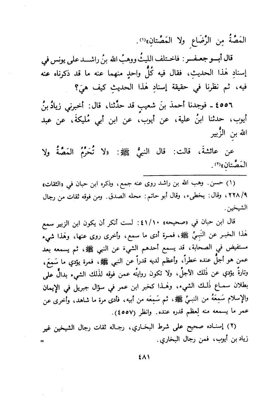 4556 - فَوَجَدْنَا أَحْمَدَ بْنَ شُعَيْبٍ قَدْ حَدَّثَنَا، قَالَ: أَخْبَرَنِي زِيَادُ بْنُ أَيُّوبَ، حَدَّثَنَا ابْنُ عُلَيَّةَ، عَنْ أَيُّوبَ، عَنِ ابْنِ أَبِي مُلَيْكَةَ، عَنْ عَبْدِ اللهِ بْنِ الزُّبَيْرِ، عَنْ عَائِشَةَ، قَالَتْ: قَالَ النَّبِيُّ صَلَّى اللَّهُ عَلَيْهِ وَسَلَّمَ: " لَا تُحَرِّمُ الْمَصَّةُ وَلَا الْمَصَّتَانِ " -[482]- فَوَقَفْنَا بِذَلِكَ عَلَى أَنَّ هَذَا الْحَدِيثَ قَدْ رَجَعَ إِلَى عَائِشَةَ، إِمَّا عَنْ عُرْوَةَ عَنْهَا، وَإِمَّا عَنِ ابْنِ الزُّبَيْرِ عَنْهَا، ثُمَّ نَظَرْنَا: هَلْ رَوَى هَذَا الْحَدِيثَ عَنْ عُرْوَةَ بْنِ الزُّبَيْرِ غَيْرُ الزُّهْرِيِّ أَمْ لَا؟
