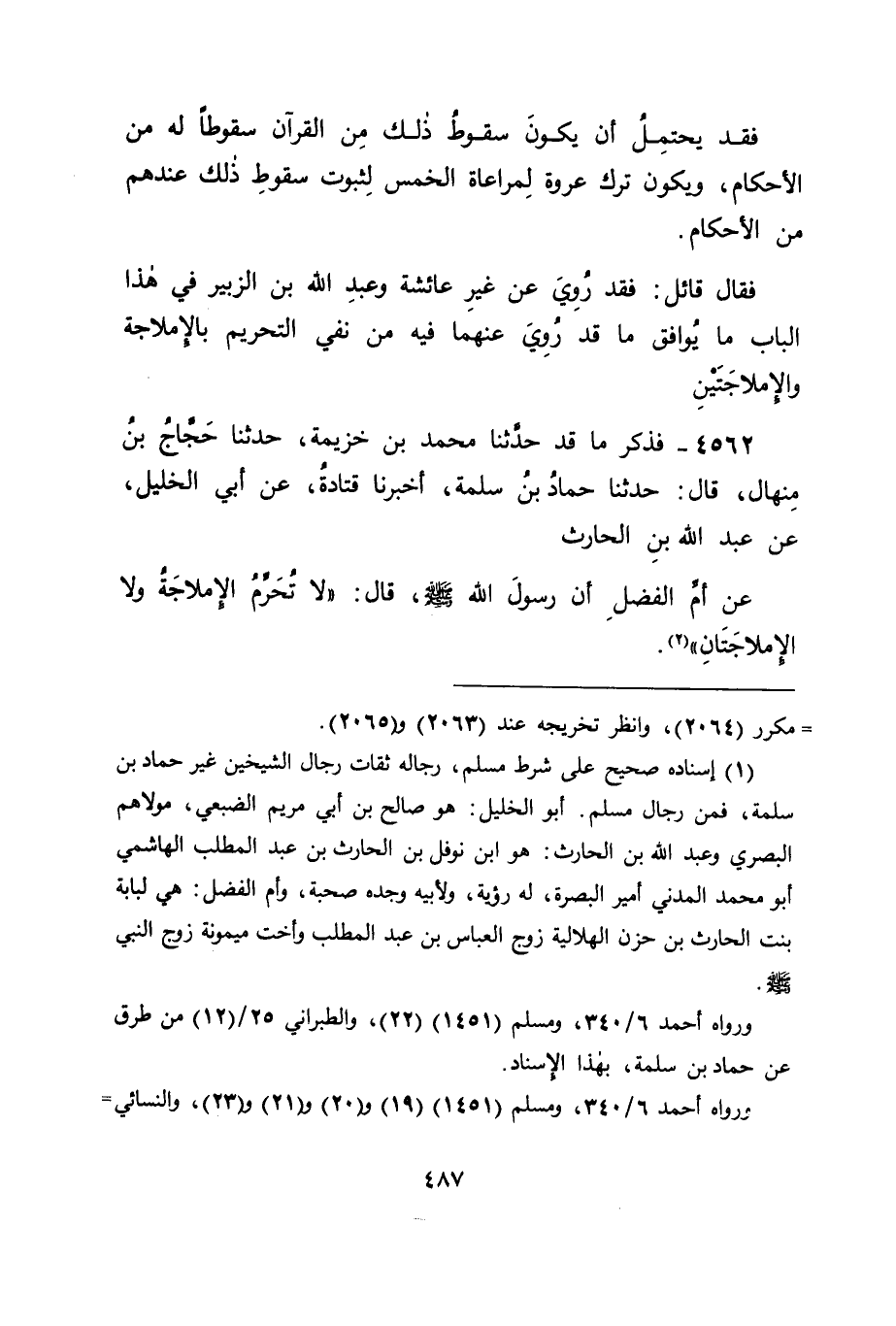 4562 - فَذَكَرَ مَا قَدْ حَدَّثَنَا مُحَمَّدُ بْنُ خُزَيْمَةَ، حَدَّثَنَا حَجَّاجُ بْنُ مِنْهَالٍ، قَالَ: حَدَّثَنَا حَمَّادُ بْنُ سَلَمَةَ، أَخْبَرَنَا قَتَادَةُ، عَنْ أَبِي الْخَلِيلِ، عَنْ عَبْدِ اللهِ بْنِ الْحَارِثِ، عَنْ أُمِّ الْفَضْلِ، أَنَّ رَسُولَ اللهِ صَلَّى اللَّهُ عَلَيْهِ وَسَلَّمَ، قَالَ: " لَا تُحَرِّمُ الْإِمْلَاجَةُ وَلَا الْإِمْلَاجَتَانِ "