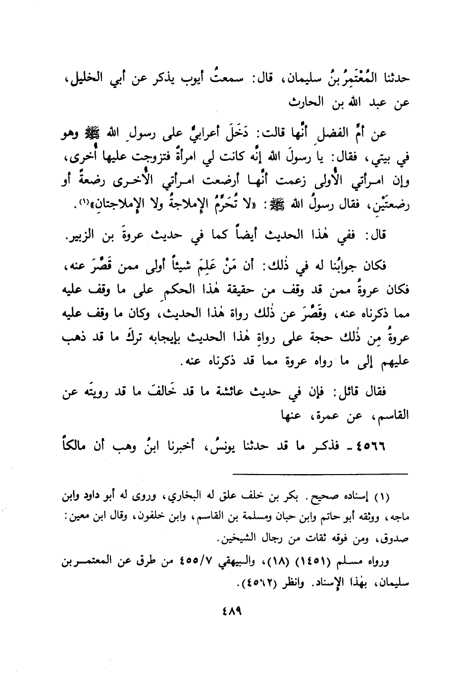 4566 - فَذَكَرَ مَا قَدْ حَدَّثَنَا يُونُسُ، أَخْبَرَنَا ابْنُ وَهْبٍ، أَنَّ مَالِكًا، -[490]- حَدَّثَهُ، عَنْ عَبْدِ اللهِ بْنِ أَبِي بَكْرٍ، عَنْ عَمْرَةَ ابْنَةِ عَبْدِ الرَّحْمَنِ، عَنْ عَائِشَةَ، أَنَّهَا قَالَتْ: " كَانَ فِيمَا أُنْزِلَ مِنَ الْقُرْآنِ: عَشْرُ رَضَعَاتٍ مَعْلُومَاتٍ يُحَرِّمْنَ، ثُمَّ نُسِخْنَ بِخَمْسِ رَضَعَاتٍ مَعْلُومَاتٍ، فَتُوُفِّيَ رَسُولُ اللهِ صَلَّى اللَّهُ عَلَيْهِ وَسَلَّمَ وَهُوَ مِمَّا يُقْرَأُ مِنَ الْقُرْآنِ " قَالَ: فَفِي هَذَا الْحَدِيثِ مَا قَدْ دَلَّ عَلَى بَقَاءِ حُكْمِ الْخَمْسِ. فَكَانَ جَوَابَنَا لَهُ فِي ذَلِكَ: أَنَّ الْقَاسِمَ بْنَ مُحَمَّدٍ فِي الْحِفْظِ وَالْإِتْقَانِ فَوْقَ عَبْدِ اللهِ بْنِ أَبِي بَكْرٍ، لَا سِيَّمَا وَقَدْ وَافَقَهُ عَلَى مَا رَوَى مِنْ ذَلِكَ يَحْيَى بْنُ سَعِيدٍ وَهُوَ فَوْقَ عَبْدِ اللهِ بْنِ أَبِي بَكْرٍ أَيْضًا.