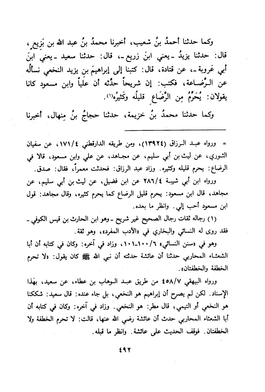 وَكَمَا حَدَّثَنَا أَحْمَدُ بْنُ شُعَيْبٍ، أَخْبَرَنَا مُحَمَّدُ بْنُ عَبْدِ اللهِ بْنِ بَزِيعٍ، قَالَ: حَدَّثَنَا يَزِيدُ يَعْنِي ابْنَ زُرَيْعٍ، قَالَ: حَدَّثَنَا سَعِيدٌ يَعْنِي ابْنَ أَبِي عَرُوبَةَ، عَنْ قَتَادَةَ، قَالَ: كَتَبْنَا إِلَى إِبْرَاهِيمَ بْنِ يَزِيدَ النَّخَعِيِّ نَسْأَلُهُ عَنِ الرَّضَاعَةِ، فَكَتَبَ: إِنَّ شُرَيْحًا حَدَّثَهُ أَنَّ عَلِيًّا وَابْنَ مَسْعُودٍ كَانَا يَقُولَانِ: " يُحَرِّمُ مِنَ الرَّضَاعِ قَلِيلُهُ وَكَثِيرُهُ "