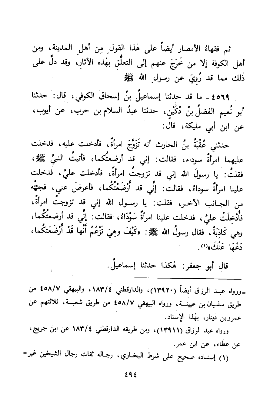 4569 - مَا قَدْ حَدَّثَنَا إِسْمَاعِيلُ بْنُ إِسْحَاقَ الْكُوفِيُّ، قَالَ: حَدَّثَنَا أَبُو نُعَيْمٍ الْفَضْلُ بْنُ دُكَيْنٍ، حَدَّثَنَا عَبْدُ السَّلَامِ بْنُ حَرْبٍ، عَنْ أَيُّوبَ، عَنِ ابْنِ أَبِي مُلَيْكَةَ، قَالَ: حَدَّثَنِي عُقْبَةُ بْنُ الْحَارِثِ: أَنَّهُ تَزَوَّجَ امْرَأَةً، فَأُدْخِلَتْ عَلَيْهِ فَدَخَلَتْ عَلَيْهِمَا امْرَأَةٌ سَوْدَاءُ، فَقَالَتْ: إِنِّي قَدْ أَرْضَعْتُكُمَا، فَأَتَيْتُ النَّبِيَّ صَلَّى اللَّهُ عَلَيْهِ وَسَلَّمَ، فَقُلْتُ: يَا رَسُولَ اللهِ، إِنِّي قَدْ تَزَوَّجْتُ امْرَأَةً فَأُدْخِلَتْ عَلَيَّ، فَدَخَلَتْ عَلَيْنَا امْرَأَةٌ سَوْدَاءُ، فَقَالَتْ: إِنِّي قَدْ أَرْضَعْتُكُمَا، فَأَعْرَضَ عَنِّي، فَجِئْتُهُ مِنَ الْجَانِبِ الْآخَرِ، فَقُلْتُ: يَا رَسُولَ اللهِ إِنِّي قَدْ تَزَوَّجْتُ امْرَأَةً، فَأُدْخِلَتْ عَلَيَّ، فَدَخَلَتْ عَلَيْنَا امْرَأَةٌ سَوْدَاءُ، فَقَالَتْ: إِنِّي قَدْ أَرْضَعْتُكُمَا، وَهِيَ كَاذِبَةٌ، فَقَالَ رَسُولُ اللهِ صَلَّى اللَّهُ عَلَيْهِ وَسَلَّمَ: " كَيْفَ وَهِيَ تَزْعُمُ أَنَّهَا قَدْ أَرْضَعْتُكُمَا؟ دَعْهَا عَنْكَ " قَالَ أَبُو جَعْفَرٍ: هَكَذَا حَدَّثَنَا إِسْمَاعِيلُ.