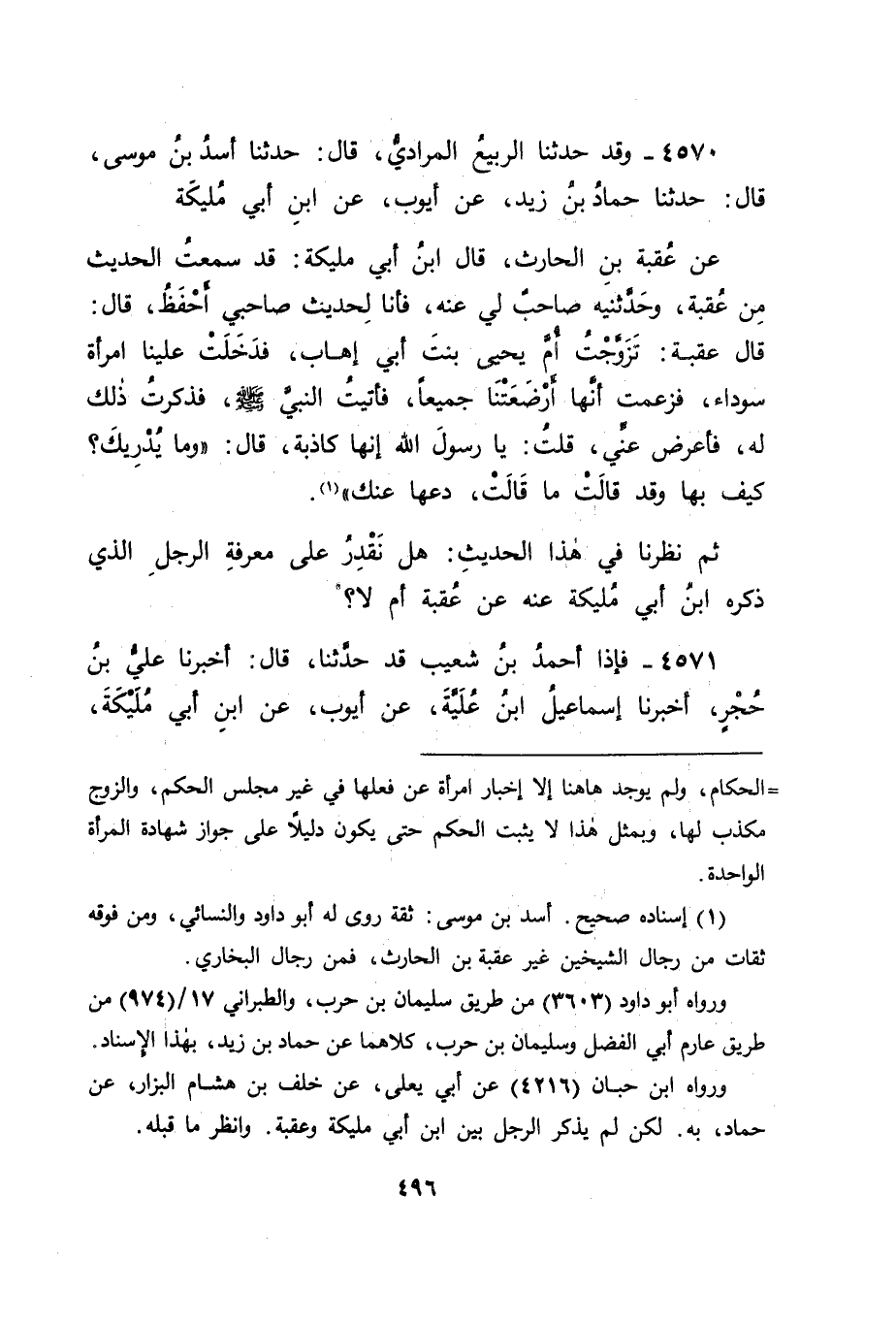 4570 - وَقَدْ حَدَّثَنَا الرَّبِيعُ الْمُرَادِيُّ، قَالَ: حَدَّثَنَا أَسَدُ بْنُ مُوسَى، قَالَ: حَدَّثَنَا حَمَّادُ بْنُ زَيْدٍ، عَنْ أَيُّوبَ، عَنِ ابْنِ أَبِي مُلَيْكَةَ، عَنْ عُقْبَةَ بْنِ الْحَارِثِ، قَالَ ابْنُ أَبِي مُلَيْكَةَ: قَدْ سَمِعْتُ الْحَدِيثَ مِنْ عُقْبَةَ، وَحَدَّثَنِيهِ صَاحِبٌ لِي عَنْهُ، فَأَنَا لِحَدِيثِ صَاحِبِي أَحْفَظُ، قَالَ: قَالَ عُقْبَةُ: تَزَوَّجْتُ أُمَّ يَحْيَى بِنْتَ أَبِي إِهَابٍ، فَدَخَلَتْ عَلَيْنَا امْرَأَةٌ سَوْدَاءُ، فَزَعَمَتْ أَنَّهَا أَرْضَعَتْنَا جَمِيعًا، فَأَتَيْتُ النَّبِيَّ صَلَّى اللَّهُ عَلَيْهِ وَسَلَّمَ، فَذَكَرْتُ ذَلِكَ لَهُ، فَأَعْرَضَ عَنِّي، قُلْتُ: يَا رَسُولَ اللهِ، إِنَّهَا كَاذِبَةٌ، قَالَ: " وَمَا يُدْرِيكَ؟ كَيْفَ بِهَا وَقَدْ قَالَتْ مَا قَالَتْ؟ دَعْهَا عَنْكَ " ثُمَّ نَظَرْنَا فِي هَذَا الْحَدِيثِ: هَلْ نَقْدِرُ عَلَى مَعْرِفَةِ الرَّجُلِ الَّذِي ذَكَرَهُ ابْنُ أَبِي مُلَيْكَةَ عَنْهُ عَنْ عُقْبَةَ أَمْ لَا؟