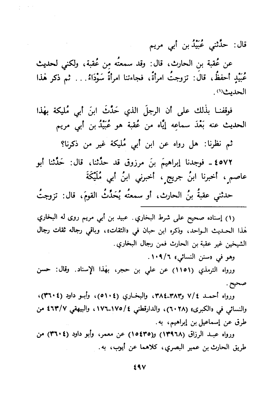 4572 - فَوَجَدْنَا إِبْرَاهِيمَ بْنَ مَرْزُوقٍ قَدْ حَدَّثَنَا، قَالَ: حَدَّثَنَا أَبُو عَاصِمٍ، أَخْبَرَنَا ابْنُ جُرَيْجٍ، أَخْبَرَنِي ابْنُ أَبِي مُلَيْكَةَ، حَدَّثَنِي عُقْبَةُ بْنُ الْحَارِثِ، أَوْ سَمِعْتُهُ يُحَدِّثُ الْقَوْمَ، قَالَ: تَزَوَّجْتُ -[498]- بِنْتَ أَبِي إِهَابٍ، فَجَاءَتْ أَمَةٌ سَوْدَاءُ، فَزَعَمَتْ أَنَّهَا أَرْضَعَتْنِي، فَأَتَيْتُ النَّبِيَّ صَلَّى اللَّهُ عَلَيْهِ وَسَلَّمَ، فَسَأَلْتُهُ، فَأَعْرَضَ عَنِّي، هَكَذَا أَمْلَاهُ عَلَيْنَا إِبْرَاهِيمُ، وَإِنَّمَا هُوَ: فَزَعَمَتْ أَنَّهَا أَرْضَعَتْنَا، أَوْ أَنَّهَا أَرْضَعَتْنِي وَإِيَّاهَا فَأَعْرَضَ عَنِّي ثُمَّ سَأَلْتُهُ، فَأَعْرَضَ عَنِّي، ثُمَّ قَالَ: " كَيْفَ بِكَ وَقَدْ قِيلَ ذَلِكَ؟ " وَنَهَانِي عَنْهَا