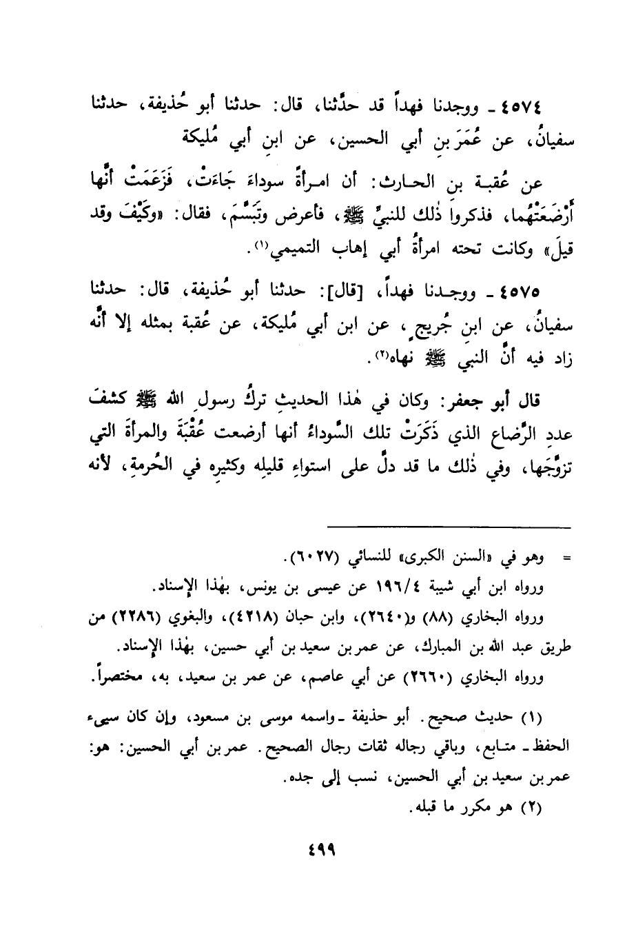 4575 - وَوَجَدْنَا فَهْدًا، قَالَ: حَدَّثَنَا أَبُو حُذَيْفَةَ، قَالَ: حَدَّثَنَا سُفْيَانُ، عَنِ ابْنِ جُرَيْجٍ، عَنِ ابْنِ أَبِي مُلَيْكَةَ، عَنْ عُقْبَةَ، بِمِثْلِهِ إِلَّا أَنَّهُ زَادَ فِيهِ أَنَّ النَّبِيَّ صَلَّى اللَّهُ عَلَيْهِ وَسَلَّمَ نَهَاهُ. قَالَ أَبُو جَعْفَرٍ: وَكَانَ فِي هَذَا الْحَدِيثِ تَرْكُ رَسُولِ اللهِ صَلَّى اللَّهُ عَلَيْهِ وَسَلَّمَ كَشْفَ عَدَدِ الرَّضَاعِ الَّذِي ذَكَرَتْ تِلْكَ السَّوْدَاءُ أَنَّهَا أَرْضَعَتْ عُقْبَةَ وَالْمَرْأَةَ الَّتِي تَزَوَّجَهَا، وَفِي ذَلِكَ مَا قَدْ دَلَّ عَلَى اسْتِوَاءِ قَلِيلِهِ وَكَثِيرِهِ فِي الْحُرْمَةِ؛ لِأَنَّهُ -[500]- لَوْ كَانَ مِنْ شَرِيعَتِهِ أَنْ لَا تُحَرِّمَ الرَّضْعَةُ وَالرَّضْعَتَانِ إِلَى الْعَدَدِ الْمَذْكُورِ فِي ذَلِكَ الْحَدِيثِ الَّذِي رُوِّينَا، لَاسْتَحَالَ أَنْ يَكُونَ رَسُولُ اللهِ صَلَّى اللَّهُ عَلَيْهِ وَسَلَّمَ يَأْمُرُ الَّذِي سَأَلَهُ بِفِرَاقِ مَنْ قَدْ أَرْضَعَتْهُ وَالْمَرْأَةَ الَّتِي قَدْ تَزَوَّجَهَا الْمَرْأَةُ الَّتِي ذَكَرَتْ لَهُ أَنَّهَا أَرْضَعَتْهُمَا رَضَاعًا لَا يَمْنَعُ مِنْ تَزْوِيجِهِ إِيَّاهَا، وَلَكِنْ يَقِفُ عُقْبَةُ، فَيَقُولُ لَهُ: سَلْهَا عَنْ عَدَدِ الرَّضَاعِ الَّذِي أَرْضَعَتْكُمَا: كَمْ هُوَ؟ ؛ لَيَقِفَ بِذَلِكَ عَلَى أَنَّهُ مِنَ الرَّضَاعِ الَّذِي يَحْرُمُ عَلَيْهِ أَنْ يَتَزَوَّجُهَا إِذَا كَانَ فِي الْحَقِيقَةِ كَذَلِكَ، وَالتَّوَرُّعُ عَنْ ذَلِكَ إِذَا كَانَ الشَّكُّ فِيهِ، أَوْ أَنَّهُ مِنَ الرَّضَاعِ الَّذِي لَا يُحَرِّمُ عَلَيْهِ تَزْوِيجَهَا، فَيُخَلِّيهِ وَذَلِكَ التَّزْوِيجَ، وَفِي تَرْكِهِ كَذَلِكَ مَا قَدْ دَلَّ عَلَى أَنَّهُ لَا فَرْقَ كَانَ عِنْدَهُ بَيْنَ قَلِيلِ الرَّضَاعِ، وَبَيْنَ كَثِيرِهِ فِي الْحُرْمَةِ، وَاللهَ نَسْأَلُهُ التَّوْفِيقَ.