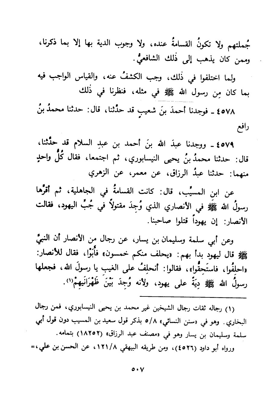 4579 - وَوَجَدْنَا عَبْدَ اللهِ بْنَ أَحْمَدَ بْنِ عَبْدِ السَّلَامِ قَدْ حَدَّثَنَا، قَالَ: حَدَّثَنَا مُحَمَّدُ بْنُ يَحْيَى النَّيْسَابُورِيُّ، ثُمَّ اجْتَمَعَا فَقَالَ كُلُّ وَاحِدٍ مِنْهُمَا: حَدَّثَنَا عَبْدُ الرَّزَّاقِ، عَنْ مَعْمَرٍ، عَنِ الزُّهْرِيِّ، عَنِ ابْنِ الْمُسَيِّبِ، قَالَ: " كَانَتِ الْقَسَامَةُ فِي الْجَاهِلِيَّةِ، ثُمَّ أَقَرَّهَا رَسُولُ اللهِ صَلَّى اللَّهُ عَلَيْهِ وَسَلَّمَ فِي الْأَنْصَارِيِّ الَّذِي وُجِدَ مَقْتُولًا فِي جُبِّ الْيَهُودِ، فَقَالَتِ الْأَنْصَارُ: إِنَّ يَهُودَ قَتَلُوا صَاحِبَنَا "