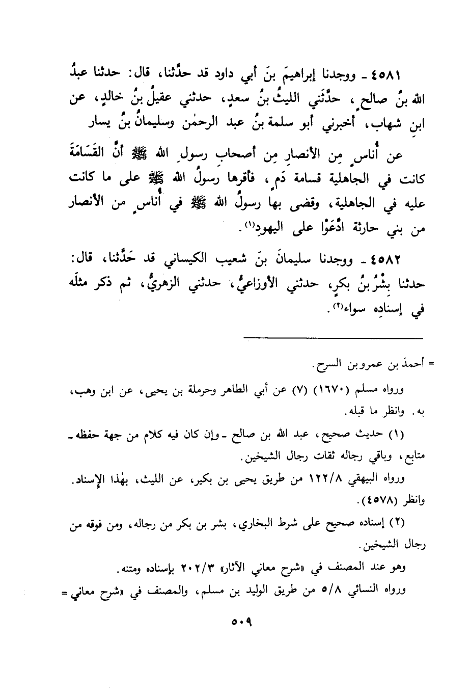 4581 - وَوَجَدْنَا إِبْرَاهِيمَ بْنَ أَبِي دَاوُدَ قَدْ حَدَّثَنَا، قَالَ: حَدَّثَنَا عَبْدُ اللهِ بْنُ صَالِحٍ، حَدَّثَنِي اللَّيْثُ بْنُ سَعْدٍ، حَدَّثَنِي عَقِيلُ بْنُ خَالِدٍ، عَنِ ابْنِ شِهَابٍ، أَخْبَرَنِي أَبُو سَلَمَةَ بْنُ عَبْدِ الرَّحْمَنِ، وَسُلَيْمَانُ بْنُ يَسَارٍ، عَنْ أُنَاسٍ مِنَ الْأَنْصَارِ مِنْ أَصْحَابِ رَسُولِ اللهِ صَلَّى اللَّهُ عَلَيْهِ وَسَلَّمَ: أَنَّ الْقَسَامَةَ كَانَتْ فِي الْجَاهِلِيَّةِ قَسَامَةَ دَمٍ، " فَأَقَرَّهَا رَسُولُ اللهِ صَلَّى اللَّهُ عَلَيْهِ وَسَلَّمَ عَلَى مَا كَانَتْ عَلَيْهِ فِي الْجَاهِلِيَّةِ، وَقَضَى بِهَا رَسُولُ اللهِ صَلَّى اللَّهُ عَلَيْهِ وَسَلَّمَ فِي أُنَاسٍ مِنَ الْأَنْصَارِ مِنْ بَنِي حَارِثَةَ ادَعَّوْا عَلَى الْيَهُودِ "