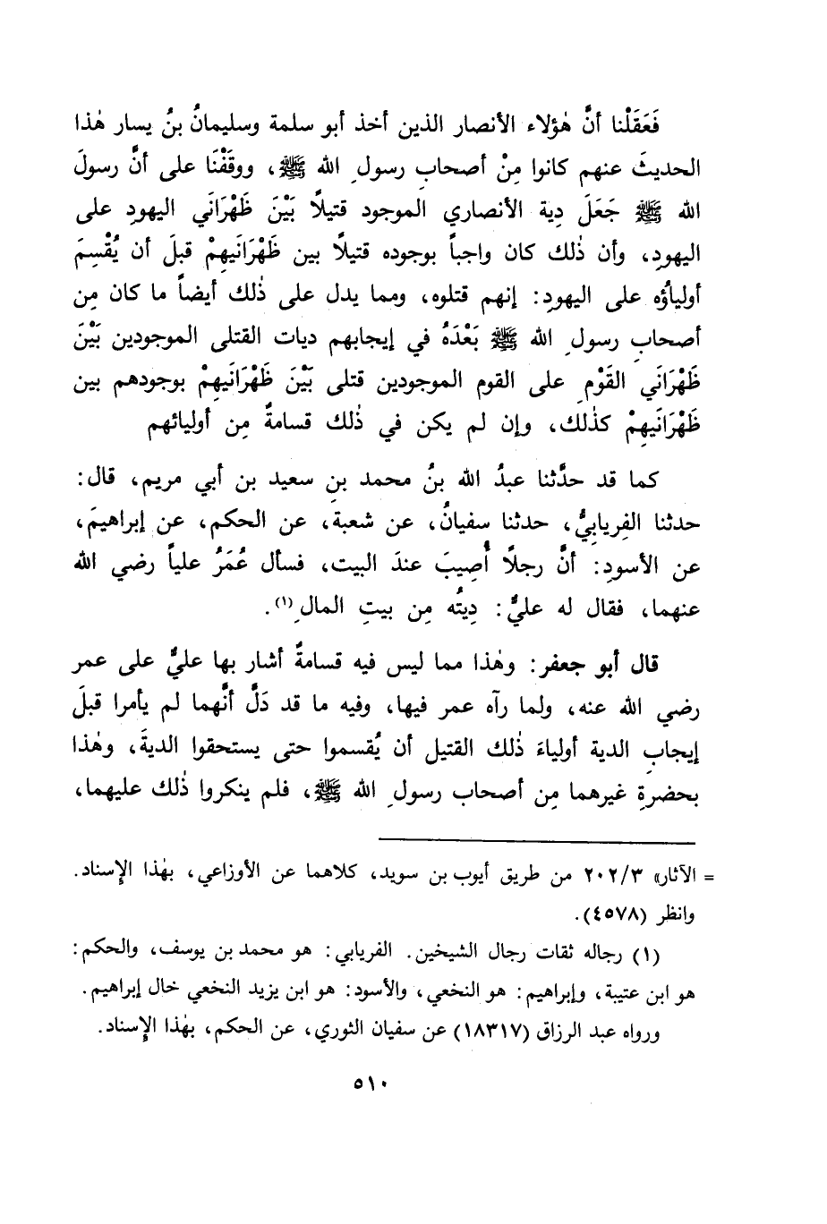 كَمَا قَدْ حَدَّثَنَا عَبْدُ اللهِ بْنُ مُحَمَّدِ بْنِ سَعِيدِ بْنِ أَبِي مَرْيَمَ، قَالَ: حَدَّثَنَا الْفِرْيَابِيُّ، حَدَّثَنَا سُفْيَانُ، عَنْ شُعْبَةَ، عَنِ الْحَكَمِ، عَنْ إِبْرَاهِيمَ، عَنِ الْأَسْوَدِ: أَنَّ رَجُلًا أُصِيبَ عِنْدَ الْبَيْتِ، فَسَأَلَ عُمَرُ عَلِيًّا رَضِيَ اللهُ عَنْهُمَا، فَقَالَ لَهُ عَلِيٌّ: " دِيَتُهُ مِنْ بَيْتِ الْمَالِ " قَالَ أَبُو جَعْفَرٍ: وَهَذَا مِمَّا لَيْسَ فِيهِ قَسَامَةٌ أَشَارَ بِهَا عَلِيٌّ عَلَى عُمَرَ رَضِيَ اللهُ عَنْهُ، وَلِمَا رَآهُ عُمَرُ فِيهَا، وَفِيهِ مَا قَدْ دَلَّ أَنَّهُمَا لَمْ يَأْمُرَا قَبْلَ إِيجَابِ الدِّيَةِ أَوْلِيَاءَ ذَلِكَ الْقَتِيلِ أَنْ يُقْسِمُوا حَتَّى يَسْتَحِقُّوا الدِّيَةَ، وَهَذَا بِحَضْرَةِ غَيْرِهِمَا مِنْ أَصْحَابِ رَسُولِ اللهِ صَلَّى اللَّهُ عَلَيْهِ وَسَلَّمَ، فَلَمْ يُنْكِرُوا ذَلِكَ عَلَيْهِمَا، -[511]- وَلَمْ يُخَالِفُوهُمَا فِيهِ، فَدَلَّ ذَلِكَ عَلَى مُتَابَعَتِهِمْ إِيَّاهُمَا عَلَيْهِ.
