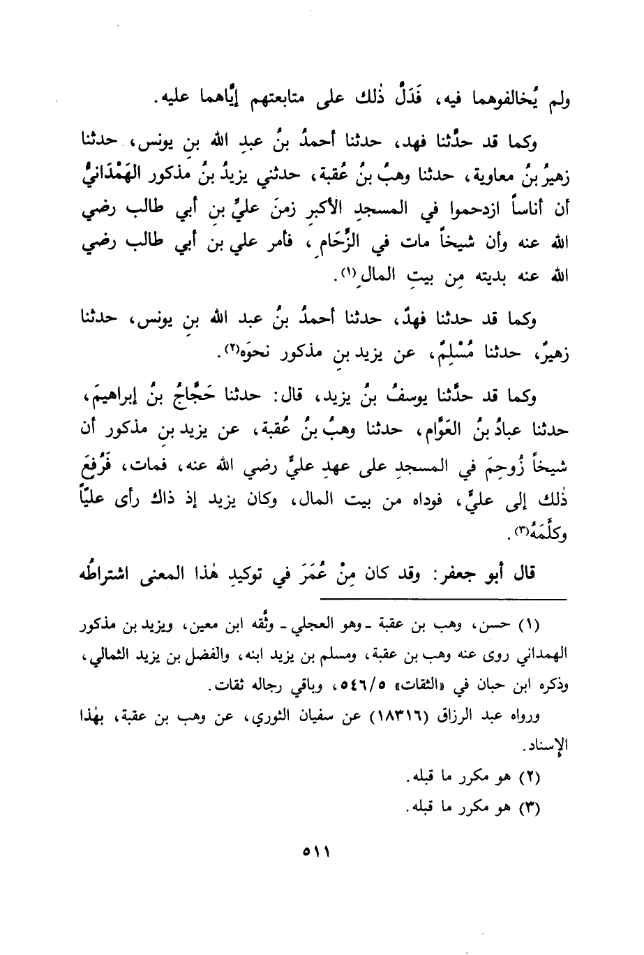وَكَمَا قَدْ حَدَّثَنَا فَهْدٌ، حَدَّثَنَا أَحْمَدُ بْنُ عَبْدِ اللهِ بْنِ يُونُسَ، حَدَّثَنَا زُهَيْرُ بْنُ مُعَاوِيَةَ، حَدَّثَنَا وَهْبُ بْنُ عُقْبَةَ، حَدَّثَنِي يَزِيدُ بْنُ مَذْكُورٍ الْهَمْدَانِيُّ: أَنَّ أُنَاسًا ازْدَحَمُوا فِي الْمَسْجِدِ الْأَكْبَرِ زَمَنَ عَلِيِّ بْنِ أَبِي طَالِبٍ رَضِيَ اللهُ عَنْهُ، وَأَنَّ شَيْخًا مَاتَ فِي الزِّحَامِ، " فَأَمَرَ عَلِيُّ بْنُ أَبِي طَالِبٍ رَضِيَ اللهُ عَنْهُ بِدِيَتِهِ مِنْ بَيْتِ الْمَالِ " وَكَمَا قَدْ حَدَّثَنَا فَهْدٌ، حَدَّثَنَا أَحْمَدُ بْنُ عَبْدِ اللهِ بْنِ يُونُسَ، حَدَّثَنَا زُهَيْرٌ، حَدَّثَنَا مُسْلِمٌ، عَنْ يَزِيدَ بْنِ مَذْكُورٍ نَحْوَهُ