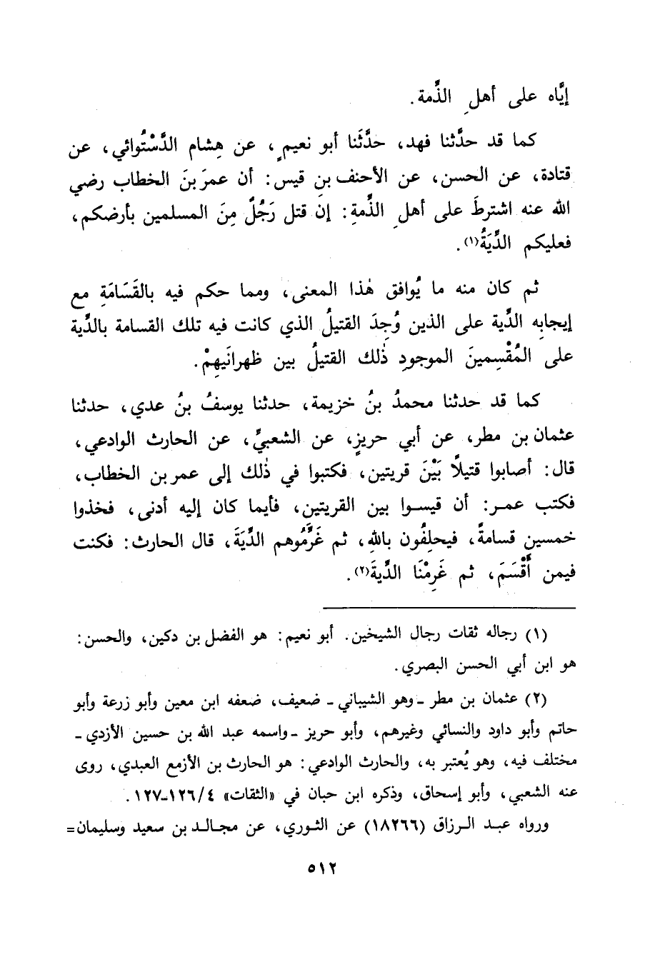 كَمَا قَدْ حَدَّثَنَا فَهْدٌ، حَدَّثَنَا أَبُو نُعَيْمٍ، عَنْ هِشَامٍ الدَّسْتُوَائِيِّ، عَنْ قَتَادَةَ، عَنِ الْحَسَنِ، عَنِ الْأَحْنَفِ بْنِ قَيْسٍ: أَنَّ عُمَرَ بْنَ الْخَطَّابِ رَضِيَ اللهُ عَنْهُ اشْتَرَطَ عَلَى أَهْلِ الذِّمَّةِ: " إِنْ قُتِلَ رَجُلٌ مِنَ الْمُسْلِمِينَ بِأَرْضِكُمْ، فَعَلَيْكُمُ الدِّيَةُ " ثُمَّ كَانَ مِنْهُ مَا يُوَافِقُ هَذَا الْمَعْنَى، وَمِمَّا حَكَمَ فِيهِ بِالْقَسَامَةِ مَعَ إِيجَابِهِ الدِّيَةَ عَلَى الَّذِينَ وُجِدَ الْقَتِيلُ الَّذِي كَانَتْ فِيهِ تِلْكَ الْقَسَامَةُ بِالدِّيَةِ عَلَى الْمُقْسِمِينَ الْمَوْجُودِ ذَلِكَ الْقَتِيلُ بَيْنَ ظَهْرَانَيْهِمْ.