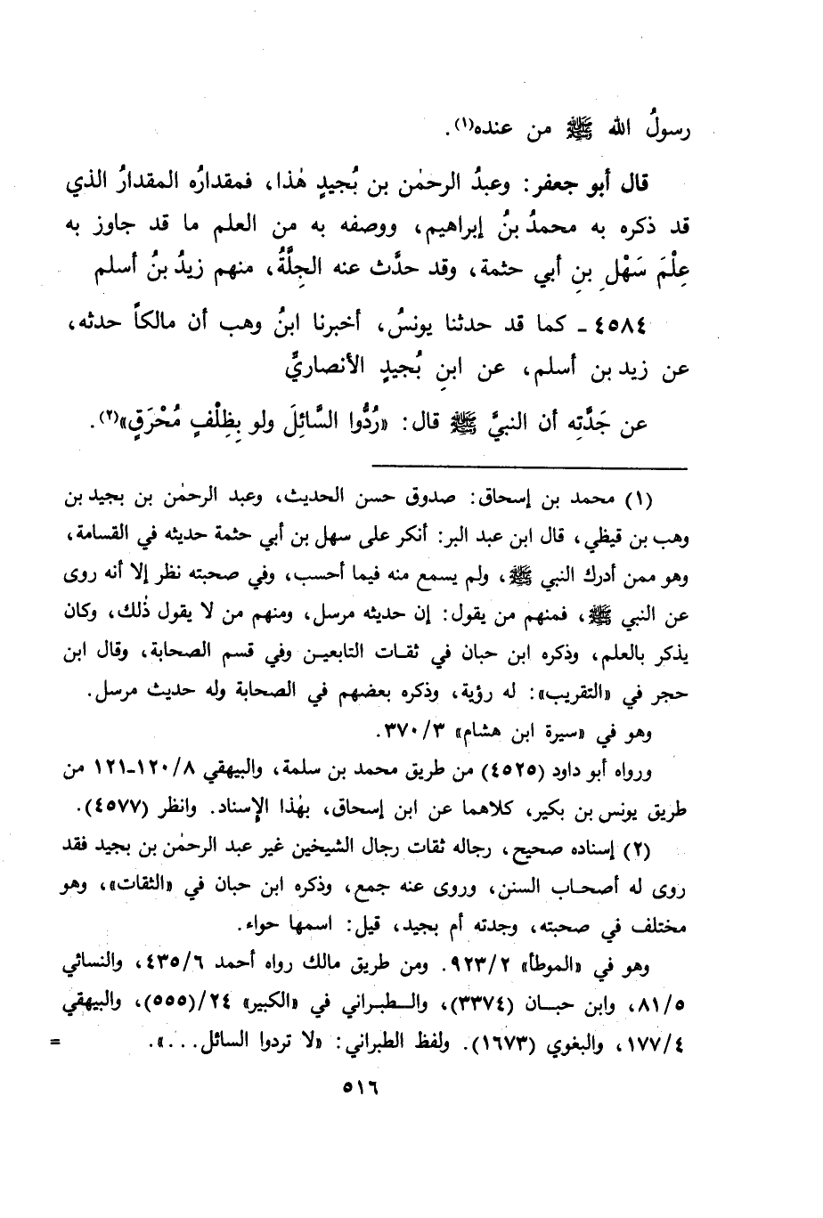 4584 - كَمَا قَدْ حَدَّثَنَا يُونُسُ، أَخْبَرَنَا ابْنُ وَهْبٍ، أَنَّ مَالِكًا، حَدَّثَهُ، عَنْ زَيْدِ بْنِ أَسْلَمَ، عَنِ ابْنِ بُجَيْدٍ الْأَنْصَارِيِّ، عَنْ جَدَّتِهِ: أَنَّ النَّبِيَّ صَلَّى اللَّهُ عَلَيْهِ وَسَلَّمَ قَالَ: " رُدُّوا السَّائِلَ وَلَوْ بِظِلْفٍ مُحْرَقٍ " -[517]- وَمِنْهُمْ: سَعِيدٌ الْمَقْبُرِيُّ.