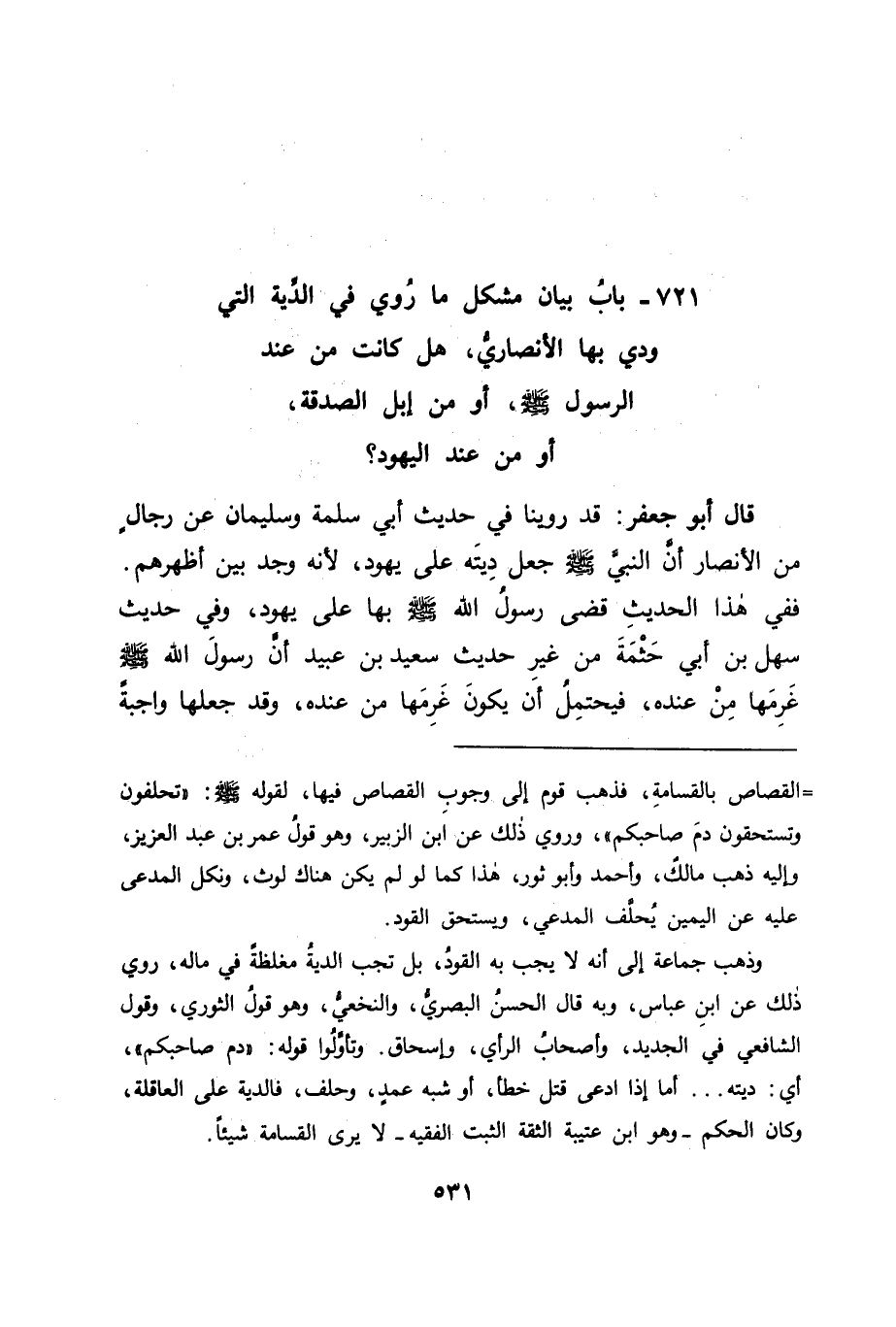 بَابُ بَيَانِ مُشْكِلِ مَا رُوِيَ فِي الدِّيَةِ الَّتِي وُدِيَ بِهَا الْأَنْصَارِيُّ، هَلْ كَانَتْ مِنْ عِنْدِ الرَّسُولِ اللهِ صَلَّى اللَّهُ عَلَيْهِ وَسَلَّمَ، أَوْ مِنْ إِبِلِ الصَّدَقَةِ، أَوْ مِنْ عِنْدِ الْيَهُودِ؟ قَالَ أَبُو جَعْفَرٍ: قَدْ رَوَيْنَا فِي حَدِيثِ أَبِي سَلَمَةَ، وَسُلَيْمَانَ، عَنْ رِجَالٍ مِنَ الْأَنْصَارِ أَنَّ النَّبِيَّ صَلَّى اللَّهُ عَلَيْهِ وَسَلَّمَ جَعَلَ دِيَتَهُ عَلَى يَهُودَ؛ لِأَنَّهُ وُجِدَ بَيْنَ أَظْهُرِهِمْ، فَفِي هَذَا الْحَدِيثِ قَضَى رَسُولُ اللهِ صَلَّى اللَّهُ عَلَيْهِ وَسَلَّمَ بِهَا عَلَى يَهُودَ، وَفِي حَدِيثِ سَهْلِ بْنِ أَبِي حَثْمَةَ مِنْ غَيْرِ حَدِيثِ سَعِيدِ بْنِ عُبَيْدٍ أَنَّ رَسُولَ اللهِ صَلَّى اللَّهُ عَلَيْهِ وَسَلَّمَ غَرِمَهَا مِنْ عِنْدِهِ، فَيُحْتَمَلَ أَنْ يَكُونَ غَرِمَهَا مِنْ عِنْدِهِ، وَقَدْ جَعَلَهَا وَاجِبَةً
