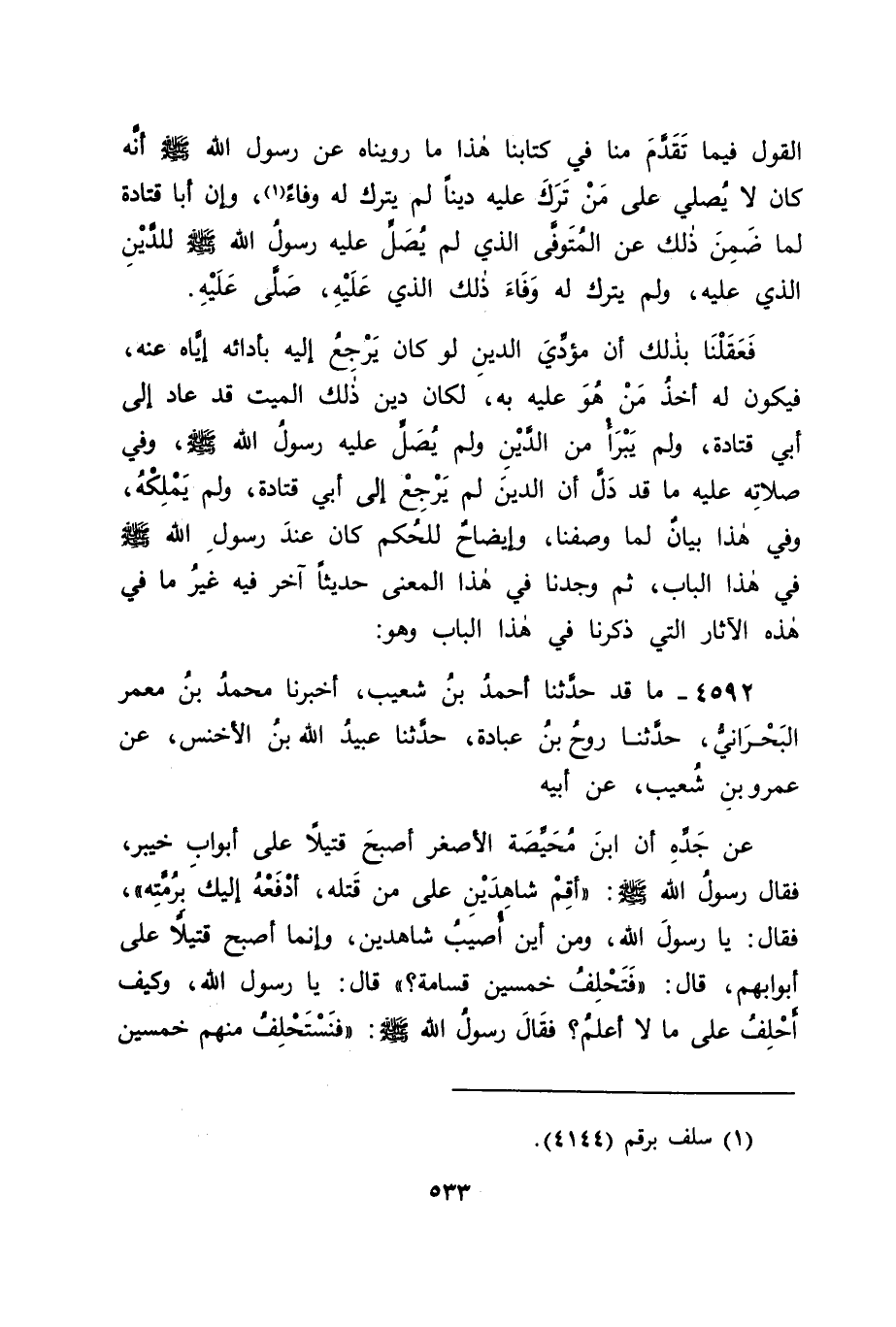 4592 - مَا قَدْ حَدَّثَنَا أَحْمَدُ بْنُ شُعَيْبٍ، أَخْبَرَنَا مُحَمَّدُ بْنُ مَعْمَرٍ الْبَحْرَانِيُّ، حَدَّثَنَا رَوْحُ بْنُ عُبَادَةَ، حَدَّثَنَا عُبَيْدُ اللهِ بْنُ الْأَخْنَسِ، عَنْ عَمْرِو بْنِ شُعَيْبٍ، عَنْ أَبِيهِ، عَنْ جَدِّهِ: أَنَّ ابْنَ مُحَيِّصَةَ الْأَصْغَرَ أَصْبَحَ قَتِيلًا عَلَى أَبْوَابِ خَيْبَرَ، فَقَالَ رَسُولُ اللهِ صَلَّى اللَّهُ عَلَيْهِ وَسَلَّمَ: " أَقِمْ شَاهِدَيْنِ عَلَى مَنْ قَتَلَهُ، أَدْفَعْهُ إِلَيْكَ بِرُمَّتِهِ " فَقَالَ: يَا رَسُولَ اللهِ، وَمِنْ أَيْنَ أُصِيبُ شَاهِدَيْنِ، وَإِنَّمَا أَصْبَحَ قَتِيلًا عَلَى أَبْوَابِهِمْ؟ قَالَ: " فَتَحْلِفُ خَمْسِينَ قَسَامَةً؟ " قَالَ: يَا رَسُولَ اللهِ، وَكَيْفَ أَحْلِفُ عَلَى مَا لَا أَعْلَمُ؟ فَقَالَ رَسُولُ اللهِ صَلَّى اللَّهُ عَلَيْهِ وَسَلَّمَ: " فَنَسْتَحْلِفُ مِنْهُمْ خَمْسِينَ -[534]- قَسَامَةً؟ " فَقَالَ: يَا رَسُولَ اللهِ، كَيْفَ نَسْتَحْلِفُهُمْ وَهُمْ كُفَّارٌ، أَوْ وَهُمْ مُشْرِكُونَ؟ فَقَسَّمَ النَّبِيُّ صَلَّى اللَّهُ عَلَيْهِ وَسَلَّمَ دِيَتَهُ عَلَيْهِمْ، وَأَعَانَهُمْ بِبَعْضِهَا فَفِي هَذَا الْحَدِيثِ أَنَّ رَسُولَ اللهِ صَلَّى اللَّهُ عَلَيْهِ وَسَلَّمَ قَسَّمَ دِيَتَهُ عَلَى الْيَهُودِ بِغَيْرِ حَلِفٍ كَانَ فِي تِلْكَ الدَّعْوَى عَلَيْهِمْ، وَفِي ذَلِكَ مَا قَدْ دَلَّ عَلَى أَنَّ الدِّيَةَ لَزِمَتْهُمْ بِوُجُودِ الْقَتِيلِ بَيْنَ ظَهْرَانَيْهِمْ، وَفِيهِ عَنْ رَسُولِ اللهِ صَلَّى اللَّهُ عَلَيْهِ وَسَلَّمَ عَوْنُهُ إِيَّاهُمْ بِنِصْفِ دِيَةِ الْقَتِيلِ، فَذَلِكَ عِنْدَنَا، وَاللهُ أَعْلَمُ، عَلَى أَنَّ ذَلِكَ كَانَ مِنْهُ صَلَّى اللَّهُ عَلَيْهِ وَسَلَّمَ غُرْمًا، عَنِ الْأَنْصَارِ لَا عَنِ الْيَهُودِ؛ وَلَأَنَّ الَّذِي غَرِمَهُ فِي ذَلِكَ إِنَّمَا كَانَ مِنَ الْأَمْوَالِ الَّتِي لَا تَحِلُّ لِلْيَهُودِ، وَبِاللهِ التَّوْفِيقُ.