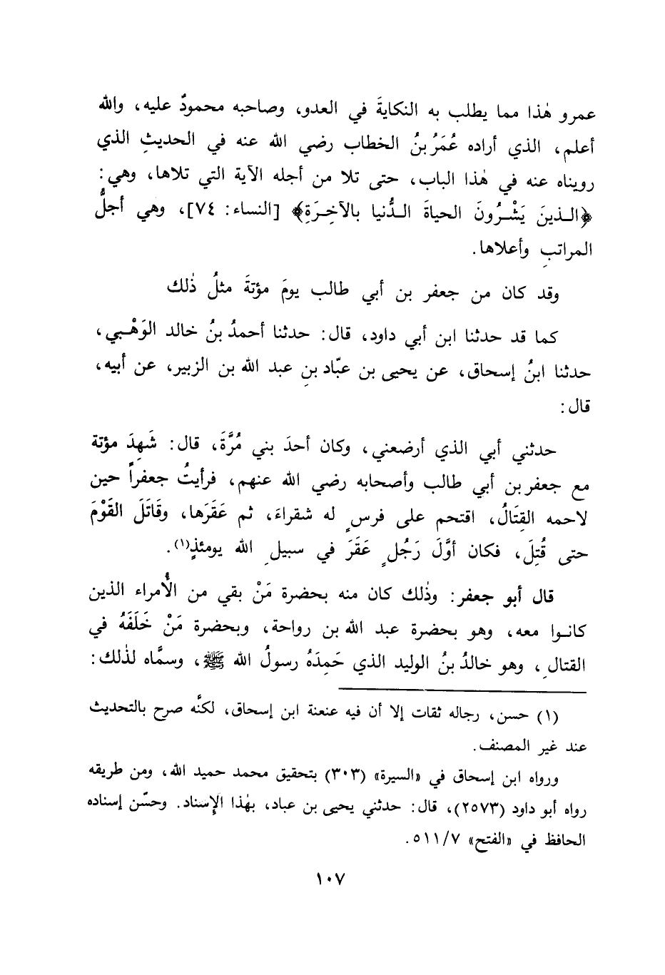 كَمَا قَدْ حَدَّثَنَا ابْنُ أَبِي دَاوُدَ قَالَ: حَدَّثَنَا أَحْمَدُ بْنُ خَالِدٍ الْوَهْبِيُّ , حَدَّثَنَا ابْنُ إِسْحَاقَ , عَنْ يَحْيَى بْنِ عَبَّادِ بْنِ عَبْدِ اللهِ بْنِ الزُّبَيْرِ , عَنْ أَبِيهِ قَالَ: حَدَّثَنِي أَبِي الَّذِي أَرْضَعَنِي، وَكَانَ أَحَدَ بَنِي مُرَّةَ قَالَ: شَهِدَ مُؤْتَةَ مَعَ جَعْفَرِ بْنِ أَبِي طَالِبٍ وَأَصْحَابِهِ رَضِيَ اللهُ عَنْهُمْ، فَرَأَيْتُ جَعْفَرًا حِينَ لَاحَمَهُ الْقِتَالُ، اقْتَحَمَ عَلَى فَرَسٍ لَهُ شَقْرَاءَ، ثُمَّ عَقَرَهَا، وَقَاتَلَ الْقَوْمَ حَتَّى قُتِلَ، فَكَانَ أَوَّلَ رَجُلٍ عَقَرَ فِي سَبِيلِ اللهِ يَوْمَئِذٍ " قَالَ أَبُو جَعْفَرٍ: وَذَلِكَ كَانَ مِنْهُ بِحَضْرَةِ مَنْ بَقِيَ مِنَ الْأُمَرَاءِ الَّذِينَ كَانُوا مَعَهُ، وَهُوَ بِحَضْرَةِ عَبْدِ اللهِ بْنِ رَوَاحَةَ، وَبِحَضْرَةِ مَنْ خَلْفَهُ فِي الْقِتَالِ، وَهُوَ خَالِدُ بْنُ الْوَلِيدِ الَّذِي حَمِدَهُ رَسُولُ اللهِ صَلَّى اللَّهُ عَلَيْهِ وَسَلَّمَ، وَسَمَّاهُ لِذَلِكَ: -[108]- سَيْفَ اللهِ، وَبِحَضْرَةِ مَنْ كَانَ سِوَاهُمَا مِنَ الْمُسْلِمِينَ ذَلِكَ مِنْهُ، وَلَمْ يُنْكِرُوهُ عَلَيْهِ وَمِمَّا نُحِيطُ عِلْمًا بِهِ: أَنَّهُ قَدْ تَنَاهَى إِلَى رَسُولِ اللهِ صَلَّى اللَّهُ عَلَيْهِ وَسَلَّمَ مِنْ فِعْلِهِ فَلَمْ يُنْكِرْهُ عَلَيْهِ، وَلَمْ يَنْهَ الْمُسْلِمِينَ عَنْ مِثْلِهِ، فَدَلَّ ذَلِكَ أَنَّ هَذَا الْفِعْلَ مِنْ أَجْلِ الْأَفْعَالِ، وَأَنَّ الثَّوَابَ عَلَيْهِ مِنْ أَعْظَمِ الثَّوَابِ مِنَ اللهِ عَزَّ وَجَلَّ، وَأَنَّ تَأْوِيلَ الْآيَةِ الَّتِي تَلَوْنَاهَا كَمَا رُوِّينَاهُ، عَنْ أَبِي أَيُّوبَ فِي تَأْوِيلِهَا لَا كَمَا سِوَاهُ مِمَّا يُخَالِفُ ذَلِكَ وَاللهَ نَسْأَلُهُ التَّوْفِيقَ