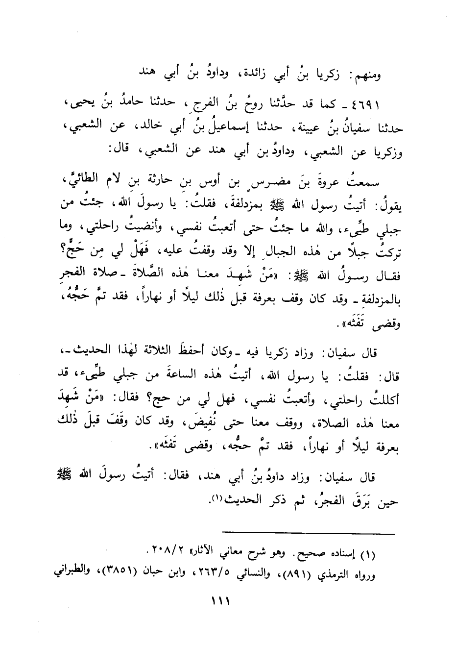 4691 - كَمَا قَدْ حَدَّثَنَا رَوْحُ بْنُ الْفَرَجِ , حَدَّثَنَا حَامِدُ بْنُ يَحْيَى , حَدَّثَنَا سُفْيَانُ بْنُ عُيَيْنَةَ , حَدَّثَنَا إِسْمَاعِيلُ بْنُ أَبِي خَالِدٍ , عَنِ الشَّعْبِيِّ، وَزَكَرِيَّا , عَنِ الشَّعْبِيِّ، وَدَاوُدَ بْنِ أَبِي هِنْدَ , عَنِ الشَّعْبِيِّ قَالَ: سَمِعْتُ عُرْوَةَ بْنَ مُضَرِّسِ بْنِ أَوْسِ بْنِ حَارِثَةَ بْنِ لَامٍ الطَّائِيَّ يَقُولُ: أَتَيْتُ رَسُولَ اللهِ صَلَّى اللَّهُ عَلَيْهِ وَسَلَّمَ بِمُزْدَلِفَةَ، فَقُلْتُ: يَا رَسُولَ اللهِ , جِئْتُ مِنْ جَبَلَيْ طَيِّئٍ، وَاللهِ مَا جِئْتُ حَتَّى أَتْعَبْتُ نَفْسِي، وَأَنْضَيْتُ رَاحِلَتِي، وَمَا تَرَكْتُ جَبَلًا مِنْ هَذِهِ الْجِبَالِ إِلَّا وَقَدْ وَقَفْتُ عَلَيْهِ، فَهَلْ لِي مِنْ حَجٍّ؟ فَقَالَ رَسُولُ اللهِ صَلَّى اللَّهُ عَلَيْهِ وَسَلَّمَ: " مَنْ شَهِدَ مَعَنَا هَذِهِ الصَّلَاةَ صَلَاةَ الْفَجْرِ بِالْمُزْدَلِفَةِ وَقَدْ كَانَ وَقَفَ بِعَرَفَةَ قَبْلَ ذَلِكَ لَيْلًا أَوْ نَهَارًا، فَقَدْ تَمَّ حَجُّهُ، وَقَضَى تَفَثَهُ " قَالَ سُفْيَانُ: وَزَادَ زَكَرِيَّا فِيهِ وَكَانَ أَحْفَظَ الثَّلَاثَةِ لِهَذَا الْحَدِيثِ قَالَ: فَقُلْتُ: يَا رَسُولَ اللهِ , أَتَيْتُ هَذِهِ السَّاعَةَ مِنْ جَبَلَيْ طَيِّئٍ، قَدْ أَكْلَلْتُ رَاحِلَتِي، وَأَتْعَبْتُ نَفْسِي، فَهَلْ لِي مِنْ حَجٍّ؟ فَقَالَ: " مَنْ شَهِدَ مَعَنَا هَذِهِ الصَّلَاةَ، وَوَقَفَ مَعَنَا حَتَّى نُفِيضَ، وَقَدْ كَانَ وَقَفَ قَبْلَ ذَلِكَ بِعَرَفَةَ لَيْلًا أَوْ نَهَارًا، فَقَدْ تَمَّ حَجُّهُ، وَقَضَى تَفَثَهُ " قَالَ سُفْيَانُ وَزَادَ دَاوُدُ بْنُ أَبِي هِنْدَ، فَقَالَ: أَتَيْتُ رَسُولَ اللهِ صَلَّى اللَّهُ عَلَيْهِ وَسَلَّمَ حِينَ بَرَقَ الْفَجْرُ، ثُمَّ ذَكَرَ الْحَدِيثَ