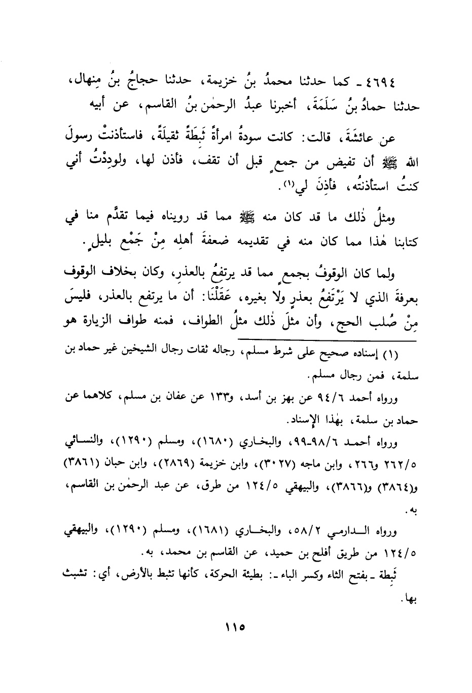 4694 - كَمَا حَدَّثَنَا مُحَمَّدُ بْنُ خُزَيْمَةَ , حَدَّثَنَا حَجَّاجُ بْنُ مِنْهَالِ , حَدَّثَنَا حَمَّادُ بْنُ سَلَمَةَ , أَخْبَرَنَا عَبْدُ الرَّحْمَنِ بْنُ الْقَاسِمِ , عَنْ أَبِيهِ عَنْ عَائِشَةَ، قَالَتْ: " كَانَتْ سَوْدَةُ امْرَأَةً ثَبِطَةً ثَقِيلَةً، فَاسْتَأْذَنَتْ رَسُولَ اللهِ صَلَّى اللَّهُ عَلَيْهِ وَسَلَّمَ أَنْ تُفِيضَ مِنْ جَمْعٍ قَبْلَ أَنْ تَقِفَ، فَأَذِنَ لَهَا، وَلَوَدِدْتُ أَنِّي كُنْتُ اسْتَأْذَنْتُهُ، فَأَذِنَ لِي " وَمِثْلُ ذَلِكَ مَا قَدْ كَانَ مِنْهُ صَلَّى اللَّهُ عَلَيْهِ وَسَلَّمَ مِمَّا قَدْ رُوِّينَاهُ فِيمَا تَقَدَّمَ مِنَّا فِي كِتَابِنَا هَذَا مِمَّا كَانَ مِنْهُ فِي تَقْدِيمِهِ ضَعَفَةَ أَهْلِهِ مِنْ جَمْعٍ بِلَيْلٍ، وَلَمَّا كَانَ الْوُقُوفُ بِجَمْعٍ مِمَّا قَدْ يَرْتَفِعُ بِالْعُذْرِ، وَكَانَ بِخِلَافِ الْوُقُوفِ بِعَرَفَةَ الَّذِي لَا يَرْتَفِعُ بِعُذْرٍ وَلَا بِغَيْرِهِ، عَقَلْنَا: أَنَّ مَا يَرْتَفِعُ بِالْعُذْرِ، فَلَيْسَ مِنْ صُلْبِ الْحَجِّ، وَأَنَّ مِثْلَ ذَلِكَ مِثْلُ الطَّوَافِ، فَمِنْهُ طَوَافُ الزِّيَارَةِ هُوَ -[116]- الَّذِي فُرِضَ لَا بُدَّ لِلْحَاجِّ مِنْهُ، وَلَا يَرْتَفِعُ فَرْضُهُ عَنْهُ بِعُذْرٍ وَلَا بِغَيْرِهِ، وَكَانَ بِخِلَافِ طَوَافِ الصَّدْرِ الَّذِي قَدْ رُفِعَ عَنِ الْحَائِضِ، وَعُذِرَتْ بِالْحَيْضِ فِي تَرْكِهِ، وَفِيمَا ذَكَرْنَا دَلِيلٌ صَحِيحٌ أَنَّ الْوُقُوفَ بِجَمْعٍ لَمَّا كَانَ يَسْقُطُ بِالْعُذْرِ فِي حَالٍ مَا عَنِ الْحَاجِّ، دَلَّ ذَلِكَ أَنَّهُ لَيْسَ مِنْ صُلْبِ الْحَجِّ، وَأَنَّهُ مِمَّا قَدْ يُجْزِئُ مِنْهُ الدَّمُ كَمَا يُجْزِئُ فِي تَرْكِ الطَّوَافِ بَيْنَ الصَّفَا وَالْمَرْوَةِ، وَبِاللهِ التَّوْفِيقُ