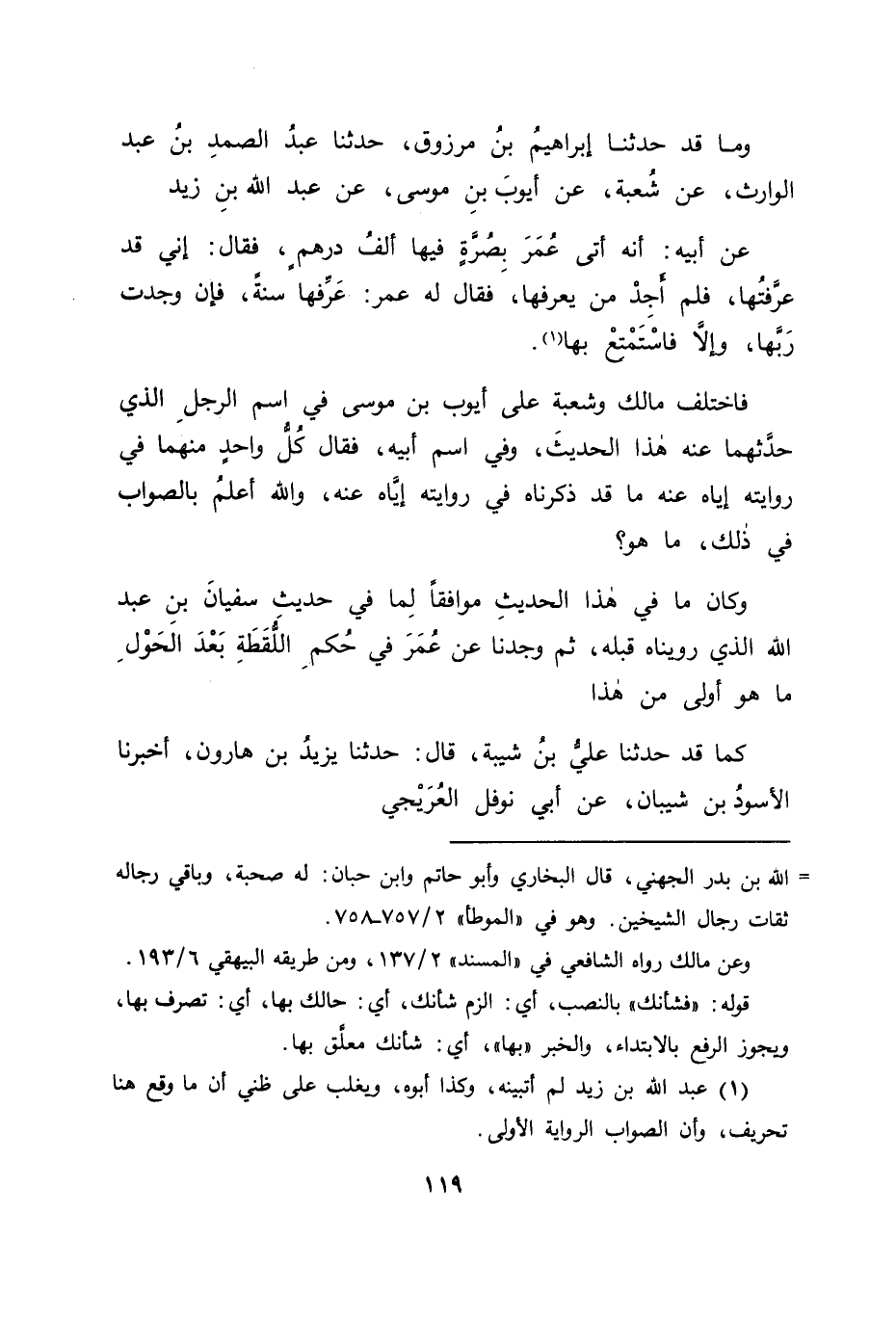 وَمَا قَدْ حَدَّثَنَا إِبْرَاهِيمُ بْنُ مَرْزُوقٍ , حَدَّثَنَا عَبْدُ الصَّمَدِ بْنُ عَبْدِ الْوَارِثِ , عَنْ شُعْبَةَ , عَنْ أَيُّوبَ بْنِ مُوسَى , عَنْ عَبْدِ اللهِ بْنِ زَيْدٍ , عَنْ أَبِيهِ: أَنَّهُ أَتَى عُمَرَ بِصُرَّةٍ فِيهَا أَلْفُ دِرْهَمٍ، فَقَالَ: إِنِّي قَدْ عَرَّفْتُهَا، فَلَمْ أَجِدْ مَنْ يَعْرِفُهَا، فَقَالَ لَهُ عُمَرُ: " عَرِّفْهَا سَنَةً، فَإِنْ وَجَدْتَ رَبَّهَا، وَإِلَّا فَاسْتَمْتِعْ بِهَا " فَاخْتَلَفَ مَالِكٌ وَشُعْبَةُ عَلَى أَيُّوبَ بْنِ مُوسَى فِي اسْمِ الرَّجُلِ الَّذِي حَدَّثَهُمَا عَنْهُ هَذَا الْحَدِيثِ، وَفِي اسْمِ أَبِيهِ، فَقَالَ كُلُّ وَاحِدٍ مِنْهُمَا فِي رِوَايَتِهِ إِيَّاهُ عَنْهُ مَا قَدْ ذَكَرْنَاهُ فِي رِوَايَتِهِ إِيَّاهُ عَنْهُ، وَاللهُ أَعْلَمُ بِالصَّوَابِ فِي ذَلِكَ، مَا هُوَ؟ وَكَانَ مَا فِي هَذَا الْحَدِيثَ مُوَافِقًا لِمَا فِي حَدِيثِ سُفْيَانَ بْنِ عَبْدِ اللهِ الَّذِي رُوِّينَاهُ قَبْلَهُ، ثُمَّ وَجَدْنَا عَنْ عُمَرَ فِي حُكْمِ اللُّقَطَةِ بَعْدَ الْحَوْلِ مَا هُوَ أَوْلَى مِنْ هَذَا