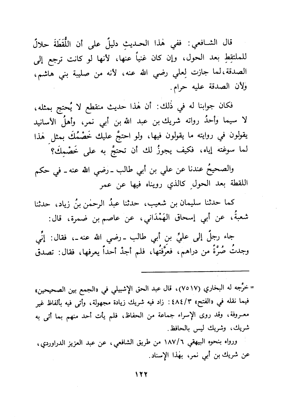 كَمَا حَدَّثَنَا سُلَيْمَانُ بْنُ شُعَيْبٍ , حَدَّثَنَا عَبْدُ الرَّحْمَنِ بْنُ زِيَادٍ , حَدَّثَنَا شُعْبَةُ , عَنْ أَبِي إِسْحَاقَ الْهَمْدَانِيِّ عَنْ عَاصِمِ بْنِ ضَمْرَةَ قَالَ: جَاءَ رَجُلٌ إِلَى عَلِيِّ بْنِ أَبِي طَالِبٍ رَضِيَ اللهُ عَنْهُ , فَقَالَ: إِنِّي وَجَدْتُ صُرَّةً مِنْ دَرَاهِمَ، فَعَرَّفْتُهَا، فَلَمْ أَجِدْ أَحَدًا يَعْرِفُهَا، فَقَالَ: " تَصَدَّقْ -[123]- بِهَا، فَإِنْ جَاءَ صَاحِبُهَا وَرَضِيَ كَانَ لَهُ الْأَجْرُ، وَإِلَّا غَرِمْتَهَا، وَكَانَ لَكَ الْأَجْرُ " وَقَدْ رُوِيَ عَنْ أُبَيِّ بْنِ كَعْبٍ، عَنْ رَسُولِ اللهِ صَلَّى اللَّهُ عَلَيْهِ وَسَلَّمَ فِي حُكْمِ اللُّقَطَةِ بَعْدَ الْحَوْلِ