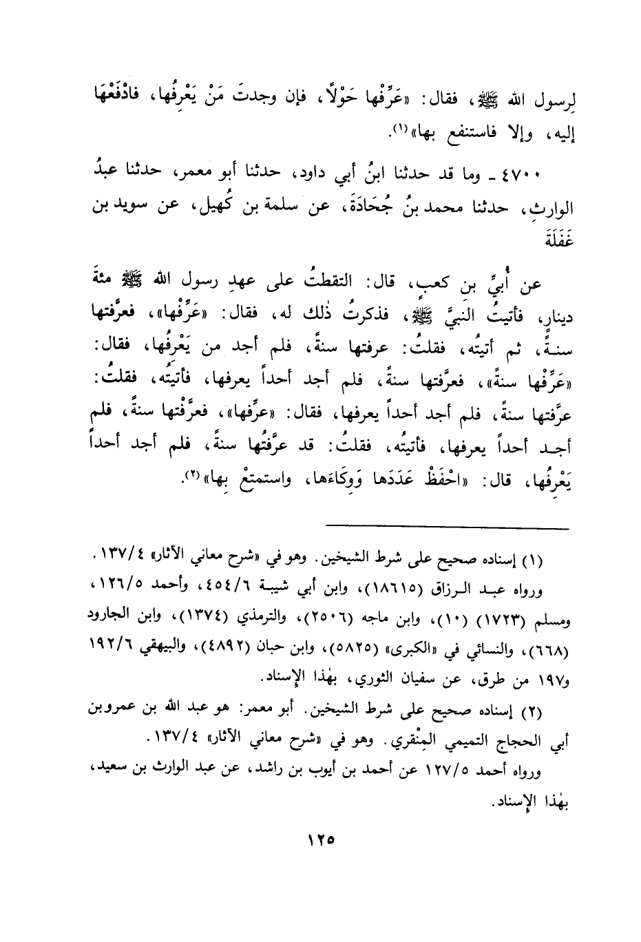 4700 - وَمَا قَدْ حَدَّثَنَا ابْنُ أَبِي دَاوُدَ , حَدَّثَنَا أَبُو مَعْمَرٍ , حَدَّثَنَا عَبْدُ الْوَارِثِ , حَدَّثَنَا مُحَمَّدُ بْنُ جُحَادَةَ , عَنْ سَلَمَةَ بْنِ كُهَيْلٍ , عَنْ سُوَيْدِ بْنِ غَفَلَةَ عَنْ أُبَيِّ بْنِ كَعْبٍ قَالَ: الْتَقَطْتُ عَلَى عَهْدِ رَسُولِ اللهِ صَلَّى اللَّهُ عَلَيْهِ وَسَلَّمَ مِائَةَ دِينَارٍ، فَأَتَيْتُ النَّبِيَّ صَلَّى اللَّهُ عَلَيْهِ وَسَلَّمَ، فَذَكَرْتُ ذَلِكَ لَهُ، فَقَالَ: " عَرِّفْهَا "، فَعَرَّفْتُهَا سَنَةً، ثُمَّ أَتَيْتُهُ، فَقُلْتُ: عَرَّفْتُهَا سَنَةً، فَلَمْ أَجِدْ مَنْ يَعْرِفُهَا، فَقَالَ: " عَرِّفْهَا سَنَةً " فَعَرَّفْتُهَا سَنَةً، فَلَمْ أَجِدْ أَحَدًا يَعْرِفُهَا، فَأَتَيْتُهُ، فَقُلْتُ: عَرَّفْتُهَا سَنَةً، فَلَمْ أَجِدْ أَحَدًا يَعْرِفُهَا، فَقَالَ: " عَرِّفْهَا " فَعَرَّفْتُهَا سَنَةً، فَلَمْ أَجِدْ أَحَدًا يَعْرِفُهَا، فَأَتَيْتُهُ، فَقُلْتُ: قَدْ عَرَّفْتُهَا سَنَةً، فَلَمْ أَجِدْ أَحَدًا يَعْرِفُهَا قَالَ: " احْفَظْ عَدَدَهَا وَوِكَاءَهَا، وَاسْتَمْتِعْ بِهَا " -[126]- قَالَ الشَّافِعِيُّ رَحِمَهُ اللهُ: وَأُبَيُّ بْنُ كَعْبٍ قَدْ كَانَ مِنْ أَيْسَرِ أَهْلِ الْمَدِينَةِ وَكَانَ جَوَابُنَا لَهُ فِي ذَلِكَ: أَنَّ يَسَارَ أُبَيِّ بْنِ كَعْبٍ الَّذِي ذَكَرَ إِنَّمَا كَانَ بَعْدَ النَّبِيِّ صَلَّى اللَّهُ عَلَيْهِ وَسَلَّمَ، فَأَمَّا قَبْلَ ذَلِكَ، فَقَدْ كَانَ فَقِيرًا، وَالدَّلِيلُ عَلَى ذَلِكَ