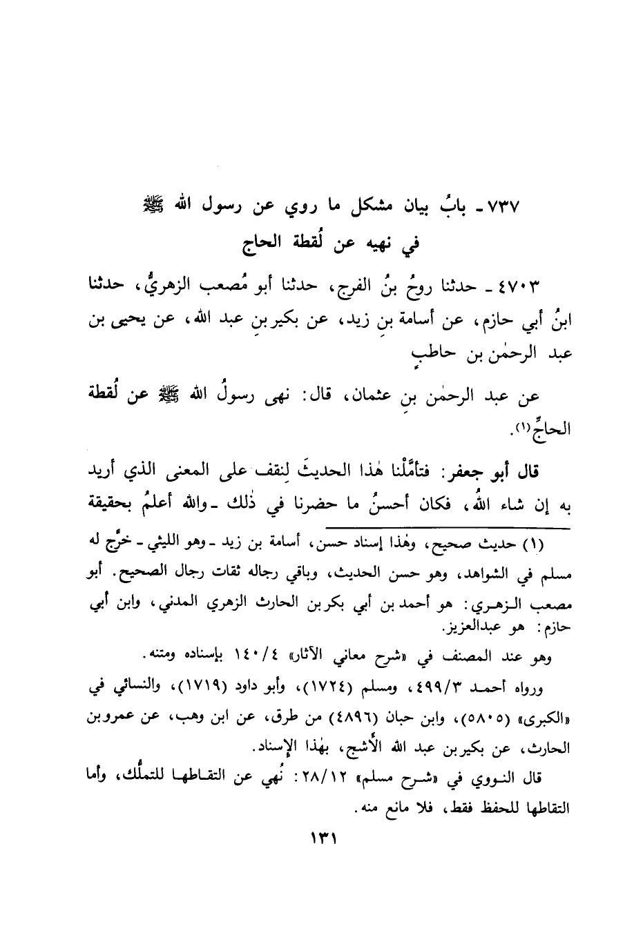 4703 - حَدَّثَنَا رَوْحُ بْنُ الْفَرَجِ , حَدَّثَنَا أَبُو مُصْعَبٍ الزُّهْرِيُّ , حَدَّثَنَا ابْنُ أَبِي حَازِمٍ , عَنْ أُسَامَةَ بْنِ زَيْدٍ , عَنْ بُكَيْرِ بْنِ عَبْدِ اللهِ , عَنْ يَحْيَى بْنِ عَبْدِ الرَّحْمَنِ بْنِ حَاطِبٍ عَنْ عَبْدِ الرَّحْمَنِ بْنِ عُثْمَانَ قَالَ: " نَهَى رَسُولُ اللهِ صَلَّى اللَّهُ عَلَيْهِ وَسَلَّمَ عَنْ لُقَطَةِ الْحَاجِّ " قَالَ أَبُو جَعْفَرٍ: فَتَأَمَّلْنَا هَذَا الْحَدِيثَ لِنَقِفَ عَلَى الْمَعْنَى الَّذِي أُرِيدَ بِهِ إِنْ شَاءَ اللهُ، فَكَانَ أَحْسَنُ مَا حَضَرَنَا فِي ذَلِكَ وَاللهُ أَعْلَمُ بِحَقِيقَةِ -[132]- الْأَمْرِ فِيهِ: أَنَّ الْحَجَّ يَجْمَعُ أَهْلَ الْبُلْدَانِ الْمُخْتَلِفَةِ الَّذِينَ يَتَفَرَّقُونَ مِنْ حَجَّتِهِمْ إِلَى مَوَاطِنِهِمْ، ثُمَّ عَسَى أَنْ لَا يَلْتَقُوا بَعْدَ ذَلِكَ، فَأَمَرَ مَنْ وَجَدَ مَا سَقَطَ مِنْهُمْ إِنْ كَانَ الَّذِي يَغْلِبُ عَلَى قَلْبِهِ أَنَّهُ لَا يَقْدِرُ عَلَى صَاحِبِهِ أَنْ لَا يَتَعَرَّضَ لِلُقَطَتِهِ خَوْفَ بَقَائِهَا فِي ضَمَانِهِ، حَتَّى يَلْقَى بِهَا رَبَّهَا، وَأَنَّهَا بِخِلَافِ اللُّقَطَةِ الَّتِي يَرْجُو لِقَاءَ رَبِّهَا لِيَدْفَعَهَا إِلَيْهِ، وَيَكُونُ أَخْذُهُ إِيَّاهَا لِحِفْظِهَا عَلَيْهِ، لَا لِمَا سِوَى ذَلِكَ، وَاللهُ الْمُوَفِّقُ