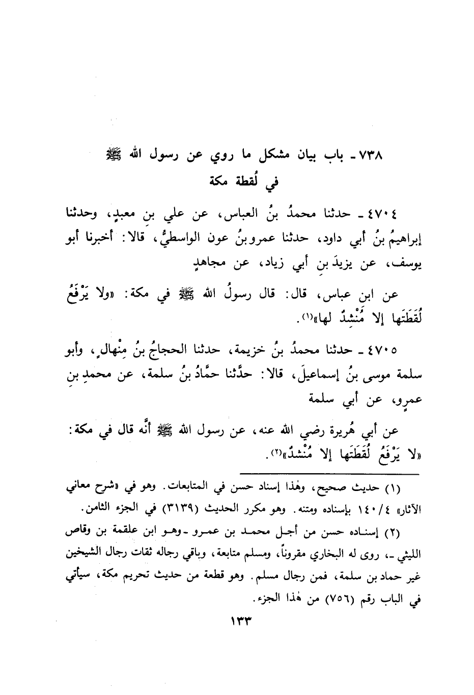 4705 - حَدَّثَنَا مُحَمَّدُ بْنُ خُزَيْمَةَ , حَدَّثَنَا الْحَجَّاجُ بْنُ مِنْهَالٍ، وَأَبُو سَلَمَةَ مُوسَى بْنُ إِسْمَاعِيلَ قَالَا: حَدَّثَنَا حَمَّادُ بْنُ سَلَمَةَ , عَنْ مُحَمَّدِ بْنِ عَمْرٍو , عَنْ أَبِي سَلَمَةَ، عَنْ أَبِي هُرَيْرَةَ رَضِيَ اللهُ عَنْهُ، عَنْ رَسُولِ اللهِ صَلَّى اللَّهُ عَلَيْهِ وَسَلَّمَ أَنَّهُ قَالَ فِي مَكَّةَ: " لَا يَرْفَعُ لُقَطَتَهَا إِلَّا مُنْشِدٌ " -[134]- وَقَدْ رُوِيَ هَذَا الْحَدِيثُ بِخِلَافِ هَذَا اللَّفْظِ