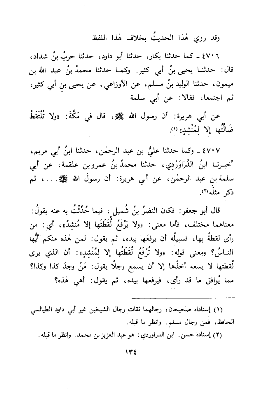 4707 - وَكَمَا حَدَّثَنَا عَلِيُّ بْنُ عَبْدِ الرَّحْمَنِ , حَدَّثَنَا ابْنُ أَبِي مَرْيَمَ , أَخْبَرَنَا ابْنُ الدَّرَاوَرْدِيِّ , حَدَّثَنَا مُحَمَّدُ بْنُ عَمْرِو بْنِ عَلْقَمَةَ , عَنْ أَبِي سَلَمَةَ بْنِ عَبْدِ الرَّحْمَنِ , عَنْ أَبِي هُرَيْرَةَ: أَنَّ رَسُولَ اللهِ صَلَّى اللَّهُ عَلَيْهِ وَسَلَّمَ، ثُمَّ ذَكَرَ مِثْلَهُ قَالَ أَبُو جَعْفَرٍ: فَكَانَ النَّضْرُ بْنُ شُمَيْلٍ فِيمَا حَدَّثْتُ بِهِ عَنْهُ يَقُولُ: مَعْنَاهُمَا مُخْتَلِفٌ، فَأَمَّا مَعْنَى: " وَلَا يَرْفَعُ لُقَطَتَهَا إِلَّا مُنْشِدٌ " أَيْ: مَنْ رَأَى لُقَطَةً بِهَا، فَسَبِيلُهُ أَنْ يَرْفَعَهَا بِيَدِهِ، ثُمَّ يَقُولُ: لِمَنْ هَذِهِ مِنْكُمْ أَيُّهَا النَّاسُ؟ وَمَعْنَى قَوْلِهِ: " وَلَا تُرْفَعُ لُقَطَتَهَا إِلَّا لِمُنْشِدٍ ": أَنَّ الَّذِي يَرَى لُقَطَتَهَا لَا يَسَعُهُ أَخْذُهَا إِلَّا أَنْ يَسْمَعَ رَجُلًا يَقُولُ: مَنْ وَجَدَ كَذَا وَكَذَا؟ مِمَّا يُوَافِقُ مَا قَدْ رَأَى، فَيَرْفَعُهَا بِيَدِهِ، ثُمَّ يَقُولُ: أَهِيَ هَذِهِ؟ -[135]- فَتَأَمَّلْنَا مَا قَدْ رُوِّينَاهُ فِي هَذَا الْبَابِ، وَمَا قَدْ قَالَهُ النَّضْرُ بْنُ شُمَيْلٍ فِيهِ، فَوَجَدْنَا الَّذِي قَالَهُ صَحِيحًا، وَكَانَ فِي ذَلِكَ مَا قَدْ دَلَّ عَلَى مَا فِي حَدِيثِ عَبْدِ الرَّحْمَنِ بْنِ عُثْمَانَ الَّذِي رُوِّينَاهُ فِي الْبَابِ الَّذِي قَبْلَهُ مِنَ اجْتِنَابِ لُقَطَةِ الْحَاجِّ، وَأَنَّهَا بِخِلَافِ اللُّقَطَةِ الَّتِي يَرْجُو مَنْ يُحَاوِلُ الْتِقَاطَهَا لِقَاءَ مَنْ هِيَ لَهُ لِيَخْرُجَ إِلَيْهِ مِنْهَا، وَأَنَّهَا بِخِلَافِ مَا سِوَاهَا مِنَ اللُّقَطَةِ الَّتِي لَا يَرْجُو فِيهَا ذَلِكَ، وَاللهُ الْمُوَفِّقُ