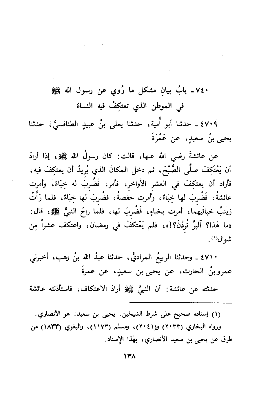 4709 - حَدَّثَنَا أَبُو أُمَيَّةَ , حَدَّثَنَا يَعْلَى بْنُ عُبَيْدٍ الطَّنَافِسِيُّ , حَدَّثَنَا يَحْيَى بْنُ سَعِيدٍ , عَنْ عَمْرَةَ عَنْ عَائِشَةَ رَضِيَ اللهُ عَنْهَا قَالَتْ: " كَانَ رَسُولُ اللهِ صَلَّى اللَّهُ عَلَيْهِ وَسَلَّمَ، إِذَا أَرَادَ أَنْ يَعْتَكِفَ صَلَّى الصُّبْحَ، ثُمَّ دَخَلَ الْمَكَانَ الَّذِي يُرِيدُ أَنْ يَعْتَكِفَ فِيهِ، فَأَرَادَ أَنْ يَعْتَكِفَ فِي الْعَشْرِ الْأَوَاخِرِ، فَأَمَرَ، فَضُرِبَ لَهُ خِبَاءٌ، وَأَمَرَتْ عَائِشَةُ، فَضُرِبَ لَهَا خِبَاءً، وَأَمَرَتْ حَفْصَةُ، فَضُرِبَ لَهَا خِبَاءً، فَلَمَّا رَأَتْ زَيْنَبُ خِبَائَيْهِمَا أَمَرَتْ بِخِبَاءٍ , فَضُرِبَ لَهَا , فَلَمَّا رَاحَ النَّبِيُّ صَلَّى اللَّهُ عَلَيْهِ وَسَلَّمَ قَالَ: " مَا هَذَا؟ آلْبِرَّ تُرِدْنَ؟ " فَلَمْ يَعْتَكِفْ فِي رَمَضَانَ، وَاعْتَكَفَ عَشْرًا مِنْ شَوَّالٍ "