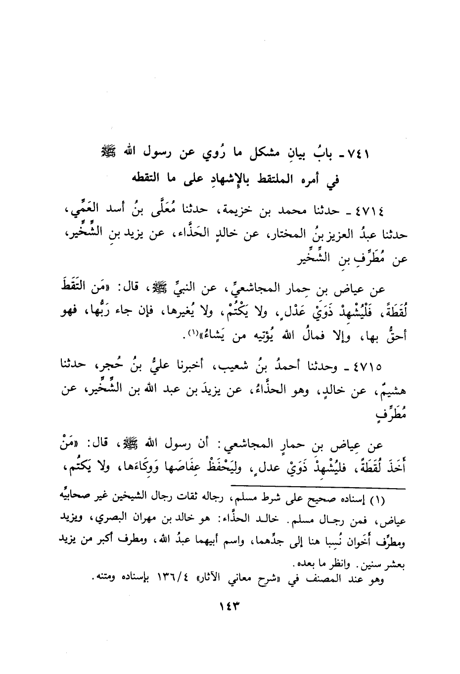 4715 - وَحَدَّثَنَا أَحْمَدُ بْنُ شُعَيْبٍ , أَخْبَرَنَا عَلِيُّ بْنُ حُجْرٍ , حَدَّثَنَا هُشَيْمٌ , عَنْ خَالِدٍ وَهُوَ الْحَذَّاءُ , عَنْ يَزِيدَ بْنِ عَبْدِ اللهِ بْنِ الشِّخِّيرِ , عَنْ مُطَرِّفٍ عَنْ عِيَاضِ بْنِ حِمَارٍ الْمُجَاشِعِيِّ: أَنَّ رَسُولَ اللهِ صَلَّى اللَّهُ عَلَيْهِ وَسَلَّمَ قَالَ: " مَنْ أَخَذَ لُقَطَةً، فَلْيُشْهِدْ ذَوِي عَدْلٍ، وَلْيَحْفَظْ عِفَاصَهَا وَوِكَاءَهَا، وَلَا يَكْتُمْ -[144]- وَلَا يُغَيِّرْهَا، فَإِنْ جَاءَ صَاحِبُهَا فَهُوَ أَحَقُّ بِهَا، وَإِلَّا فَهُوَ مَالُ اللهِ يُؤْتِيهِ مَنْ يَشَاءُ " قَالَ أَبُو جَعْفَرٍ: هَكَذَا وَجَدْنَا هَذَا الْحَدِيثَ مِنْ رِوَايَتَيْ عَبْدِ الْعَزِيزِ بْنِ الْمُخْتَارِ وَهُشَيْمِ بْنِ بُشَيْرٍ، عَنْ خَالِدٍ الْحَذَّاءِ، وَقَدْ وَجَدْنَاهُ مِنْ رِوَايَةِ شُعْبَةَ، عَنْ خَالِدٍ الْحَذَّاءِ بِزِيَادَةٍ عَلَى ذَلِكَ