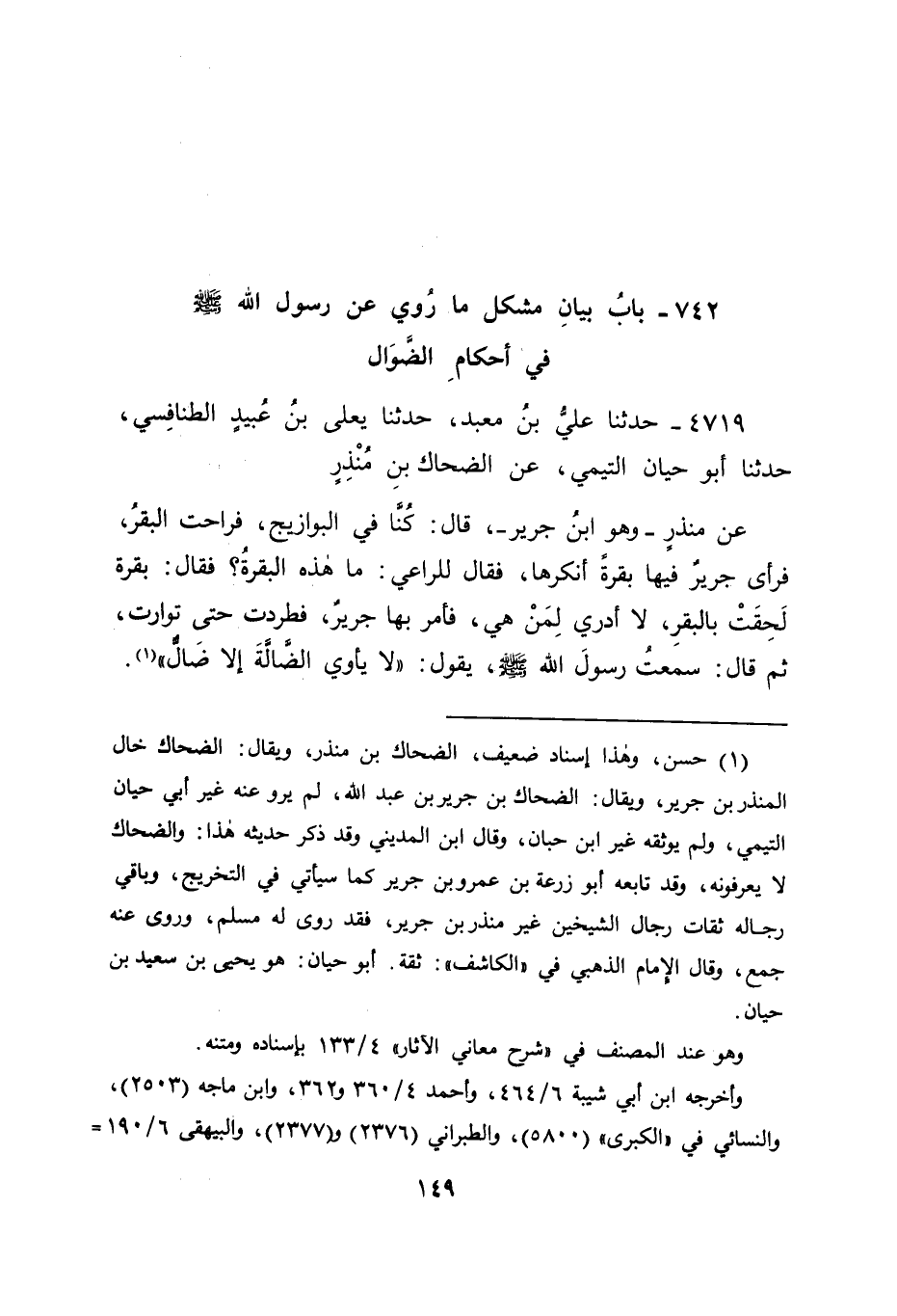 4719 - حَدَّثَنَا عَلِيُّ بْنُ مَعْبَدٍ , حَدَّثَنَا يَعْلَى بْنُ عُبَيْدٍ الطَّنَافِسِيُّ , حَدَّثَنَا أَبُو حَيَّانَ التَّيْمِيُّ , عَنِ الضَّحَّاكِ بْنِ مُنْذِرٍ , عَنْ مُنْذِرٍ وَهُوَ ابْنُ جَرِيرٍ، قَالَ: كُنَّا فِي الْبَوَازِيجِ، فَرَاحَتِ الْبَقَرُ فَرَأَى جَرِيرٌ فِيهَا بَقَرَةً أَنْكَرَهَا، فَقَالَ لِلرَّاعِي: مَا هَذِهِ الْبَقَرَةُ؟ فَقَالَ: بَقَرَةٌ لَحِقَتْ بِالْبَقَرِ، لَا أَدْرِي لِمَنْ هِيَ، فَأَمَرَ بِهَا جَرِيرٌ، فَطُرِدَتْ حَتَّى تَوارَتْ ثُمَّ قَالَ: سَمِعْتُ رَسُولَ اللهِ صَلَّى اللَّهُ عَلَيْهِ وَسَلَّمَ يَقُولُ: " لَا يَأْوِي الضَّالَّةَ إِلَّا ضَالٌّ " -[150]- قَالَ أَبُو جَعْفَرٍ: فَكَانَ فِي هَذَا الْحَدِيثِ إِعْلَامُ رَسُولِ اللهِ صَلَّى اللَّهُ عَلَيْهِ وَسَلَّمَ النَّاسَ: أَنَّهُ لَا يَأْوِي الضَّالَّ إِلَّا ضَالٌّ، وَاسْتَعْمَلَ مَا قَالَهُ عَلَيْهِ السَّلَامُ جَرِيرٌ بَعْدَهُ فِي الْبَقَرَةِ الَّتِي لَحِقَتْ بِبَقَرِهِ، وَوَجَدْنَا عَنْ رَسُولِ اللهِ صَلَّى اللَّهُ عَلَيْهِ وَسَلَّمَ مِنَ الْوَعِيدِ فِي الضَّوَالِّ وَإِخْبَارِهِ النَّاسَ: أَنَّهَا " حَرَقُ النَّارِ "