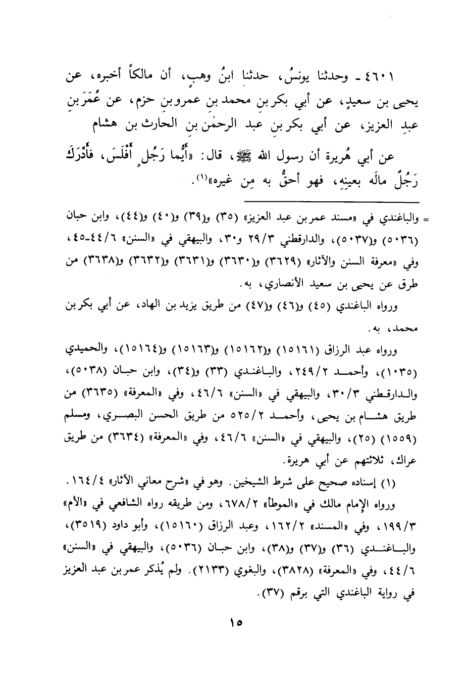 4601 - وَحَدَّثَنَا يُونُسُ، حَدَّثَنَا ابْنُ وَهْبٍ أَنَّ مَالِكًا، أَخْبَرَهُ عَنْ يَحْيَى بْنِ سَعِيدٍ، عَنْ أَبِي بَكْرِ بْنِ مُحَمَّدِ بْنِ عَمْرِو بْنِ حَزْمٍ، عَنْ عُمَرَ بْنِ عَبْدِ الْعَزِيزِ، عَنْ أَبِي بَكْرِ بْنِ عَبْدِ الرَّحْمَنِ بْنِ الْحَارِثِ بْنِ هِشَامٍ، عَنْ أَبِي هُرَيْرَةَ أَنَّ رَسُولَ اللهِ صَلَّى اللَّهُ عَلَيْهِ وَسَلَّمَ قَالَ: " أَيُّمَا رَجُلٍ أَفْلَسَ، فَأَدْرَكَ رَجُلٌ مَالَهُ بِعَيْنِهِ، فَهُوَ أَحَقُّ بِهِ مِنْ غَيْرِهِ "