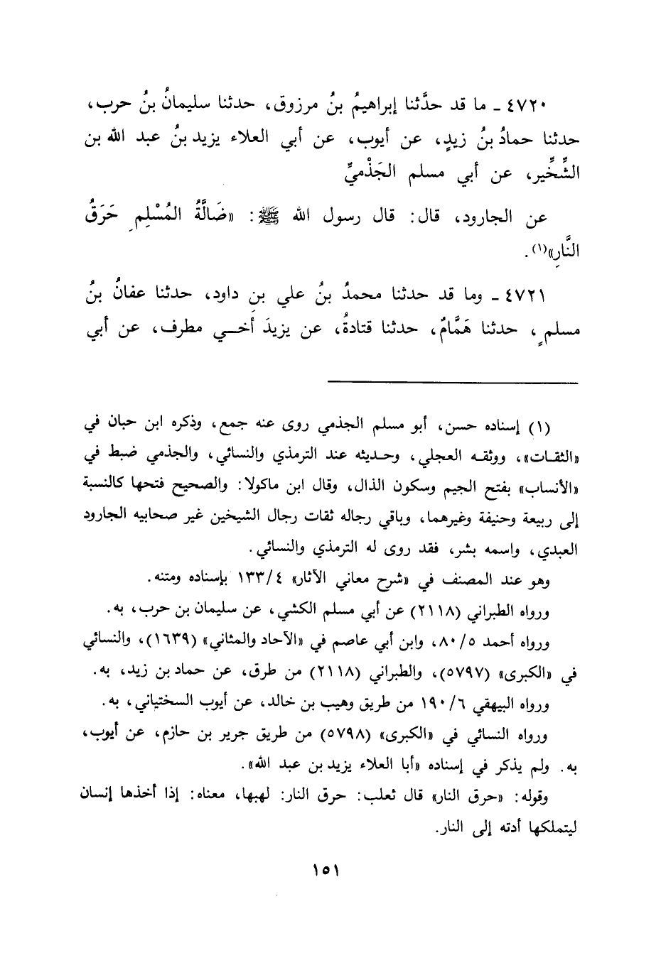 4720 - مَا قَدْ حَدَّثَنَا إِبْرَاهِيمُ , حَدَّثَنَا سُلَيْمَانُ بْنُ حَرْبٍ , حَدَّثَنَا حَمَّادُ بْنُ زَيْدٍ , عَنْ أَيُّوبَ , عَنْ أَبِي الْعَلَاءِ يَزِيدَ بْنِ عَبْدِ اللهِ بْنِ الشِّخِّيرِ , عَنْ أَبِي مُسْلِمٍ الْجَذَمِيِّ، عَنِ الْجَارُودِ قَالَ: قَالَ رَسُولُ اللهِ صَلَّى اللَّهُ عَلَيْهِ وَسَلَّمَ: " ضَالَّةُ الْمُسْلِمِ حَرَقُ النَّارِ "