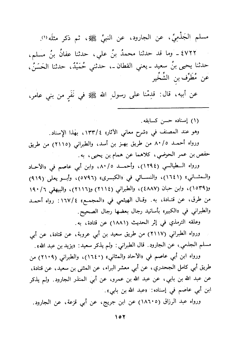 4722 - وَمَا قَدْ حَدَّثَنَا مُحَمَّدُ بْنُ عَلِيٍّ , حَدَّثَنَا عَفَّانُ بْنُ مُسْلِمٍ , حَدَّثَنَا يَحْيَى بْنُ سَعِيدٍ يَعْنِي الْقَطَّانَ , حَدَّثَنِي حُمَيْدٌ , حَدَّثَنَا الْحَسَنُ , عَنْ مُطَرِّفِ بْنِ الشِّخِّيرِ , عَنْ أَبِيهِ قَالَ: قَدِمْنَا عَلَى رَسُولِ اللهِ صَلَّى اللَّهُ عَلَيْهِ وَسَلَّمَ فِي نَفَرٍ مِنْ بَنِي عَامِرٍ , -[153]- فَقَالَ: " أَلَا أَحْمِلُكُمْ "، قُلْنَا: نَجِدُ فِي الطَّرِيقِ هَوَامِيَ الْإِبِلِ، فَقَالَ رَسُولُ اللهِ صَلَّى اللَّهُ عَلَيْهِ وَسَلَّمَ: " ضَالَّةُ الْمُسْلِمِ حَرَقُ النَّارِ "