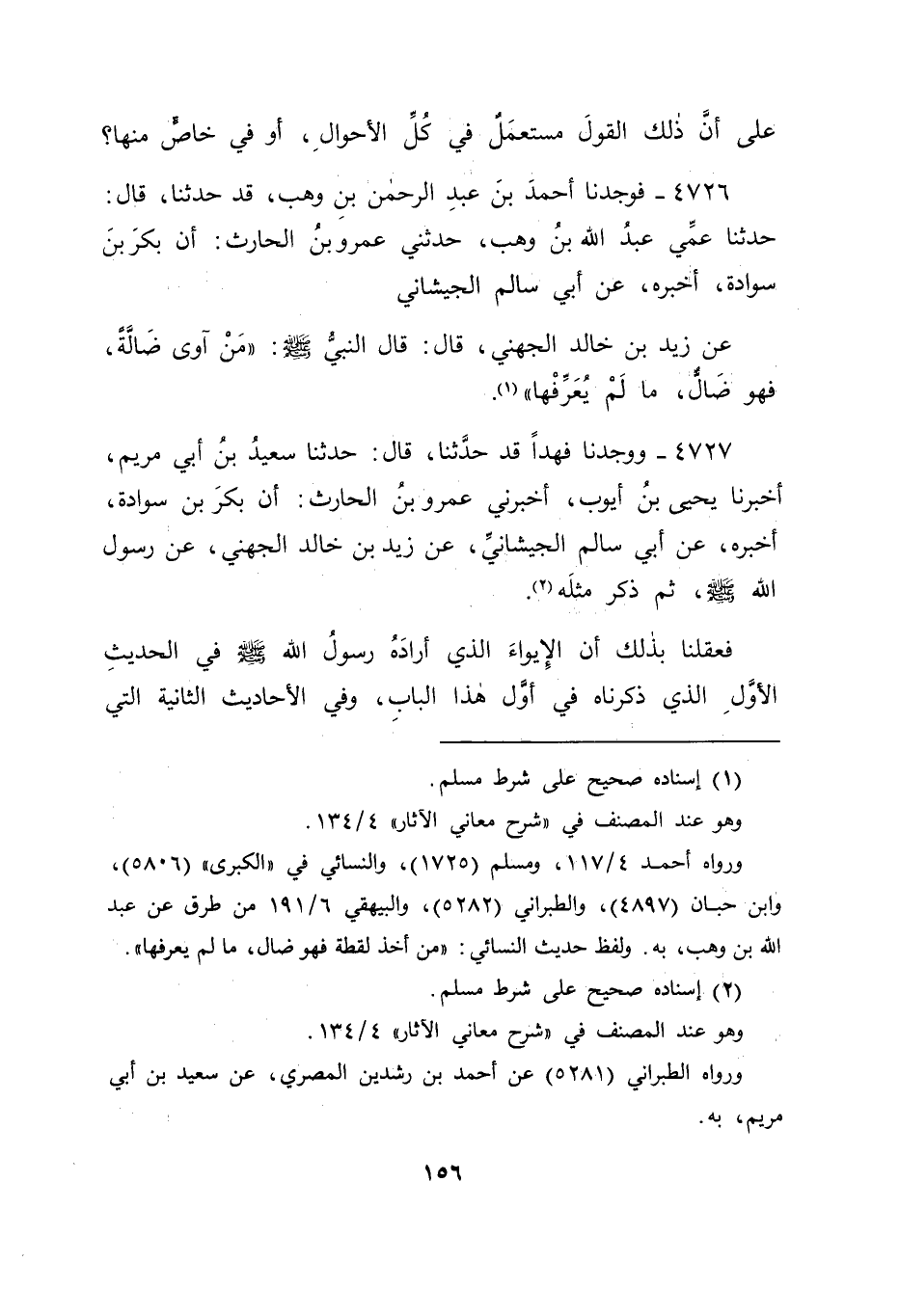 4727 - وَوَجَدْنَا فَهْدًا قَدْ حَدَّثَنَا قَالَ: حَدَّثَنَا سَعِيدُ بْنُ أَبِي مَرْيَمَ , أَخْبَرَنَا يَحْيَى بْنُ أَيُّوبَ , أَخْبَرَنِي عَمْرُو بْنُ الْحَارِثِ: أَنَّ بَكْرَ بْنَ سَوَادَةَ، أَخْبَرَهُ، عَنْ أَبِي سَالِمٍ الْجَيْشَانِيِّ , عَنْ زَيْدِ بْنِ خَالِدٍ الْجُهَنِيِّ , عَنْ رَسُولِ اللهِ صَلَّى اللَّهُ عَلَيْهِ وَسَلَّمَ، ثُمَّ ذَكَرَ مِثْلَهُ فَعَقَلْنَا بِذَلِكَ أَنَّ الْإِيوَاءَ الَّذِي أَرَادَهُ رَسُولُ اللهِ صَلَّى اللَّهُ عَلَيْهِ وَسَلَّمَ فِي الْحَدِيثِ الْأَوَّلِ الَّذِي ذَكَرْنَاهُ فِي أَوَّلِ هَذَا الْبَابِ، وَفِي الْأَحَادِيثِ الثَّانِيَةِ الَّتِي -[157]- ذَكَرْنَاهَا بَعْدَهُ: إِنَّمَا هُوَ الْإِيوَاءُ الَّذِي لَيْسَ مَعَهُ التَّعْرِيفُ، وَعَقَلْنَا بِهَذَا الْحَدِيثِ: أَنَّ الْإِيوَاءَ الَّذِي مَعَهُ التَّعْرِيفُ مَحْمُودٌ مِنْ صَاحِبِهِ، وَأَنَّهُ فِي ذَلِكَ بِخِلَافِ الضَّالِّ الَّذِي جَعَلَهُ رَسُولُ اللهِ صَلَّى اللَّهُ عَلَيْهِ وَسَلَّمَ بِإِيوَاءِ الضَّالَّةِ ضَالًّا، فَنَظَرْنَا: هَلْ نَجِدُهُ رُوِيَ عَنْ رَسُولِ اللهِ صَلَّى اللَّهُ عَلَيْهِ وَسَلَّمَ فِي غَيْرِ هَذِهِ الْآثَارِ؟