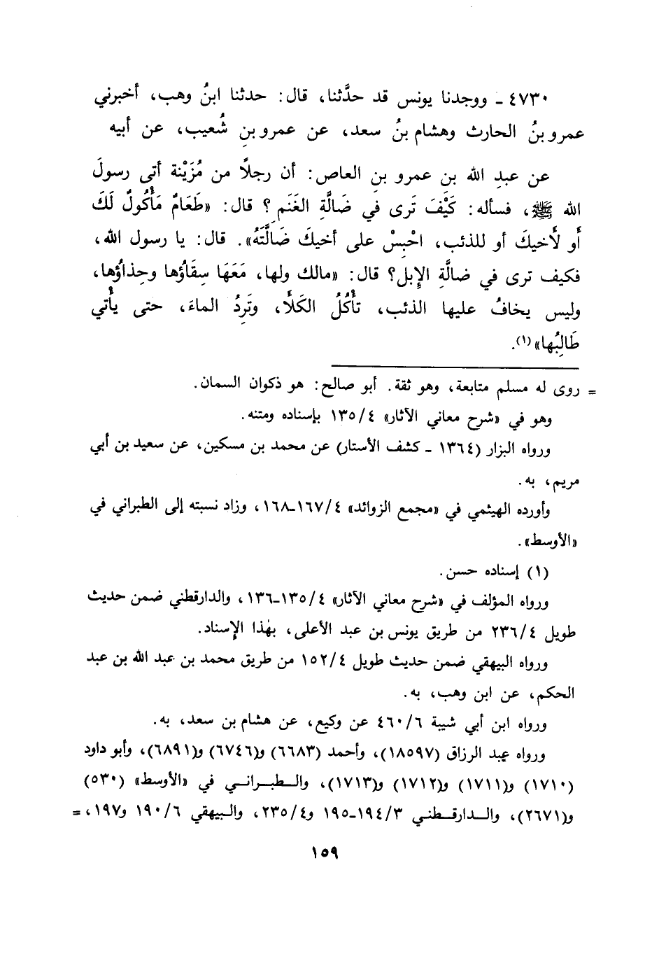 4730 - وَوَجَدْنَا يُونُسَ قَدْ حَدَّثَنَا قَالَ: حَدَّثَنَا ابْنُ وَهْبٍ , أَخْبَرَنِي عَمْرُو بْنُ الْحَارِثِ، وَهِشَامُ بْنُ سَعْدٍ , عَنْ عَمْرِو بْنِ شُعَيْبٍ , عَنْ أَبِيهِ عَنْ عَبْدِ اللهِ بْنِ عَمْرِو بْنِ الْعَاصِ: أَنَّ رَجُلًا مِنْ مُزَيْنَةَ أَتَى رَسُولَ اللهِ صَلَّى اللَّهُ عَلَيْهِ وَسَلَّمَ، فَسَأَلَهُ: كَيْفَ تَرَى فِي ضَالَّةِ الْغَنَمِ؟ قَالَ: " طَعَامٌ مَأْكُولٌ لَكَ أَوْ لِأَخِيكَ أَوْ لِلذِّئْبِ، احْبِسْ عَلَى أَخِيكَ ضَالَّتَهُ " قَالَ: يَا رَسُولَ اللهِ , فَكَيْفَ تَرَى فِي ضَالَّةِ الْإِبِلِ؟ قَالَ: " مَا لَكَ وَلَهَا، مَعَهَا سِقَاؤُهَا وَحِذَاؤُهَا، وَلَيْسَ يَخَافُ عَلَيْهَا الذِّئْبَ، تَأْكُلُ الْكَلَأَ، وَتَرِدُ الْمَاءَ، حَتَّى يَأْتِيَ طَالِبُهَا " -[160]- قَالَ أَبُو جَعْفَرٍ: فَكَانَ فِيمَا رُوِّينَا مِنْ حَدِيثَيْ عَبْدِ اللهِ بْنِ عَمْرٍو، وَزَيْدِ بْنِ خَالِدٍ الْجُهَنِيِّ مَا قَدْ دَلَّ عَلَى إِبَاحَةِ رَسُولِ اللهِ صَلَّى اللَّهُ عَلَيْهِ وَسَلَّمَ أَخْذَ مَا أَبَاحَ أَخْذَهُ مِنَ الضَّوَالِّ الْمَوْجُودَةِ، وَكَانَ ذَلِكَ الْأَخْذُ عَلَى تَصْحِيحِ حَدِيثِ أَبِي سَالِمٍ، عَنْ زَيْدِ بْنِ خَالِدٍ هُوَ الْأَخْذُ الَّذِي مَعَهُ التَّعْرِيفُ لَا مَا سِوَاهُ، وَكَانَ فِيهِ فِي ضَالَّةِ الْإِبِلِ مَا ظَاهِرُهُ خِلَافُ ذَلِكَ؛ لِأَنَّ فِيهِ " مَا لَكَ وَلَهَا، مَعَهَا سِقَاؤُهَا وَحِذَاؤُهَا، تَرِدُ الْمَاءَ، وَتَأْكُلُ الشَّجَرَ حَتَّى يَلْقَاهَا رَبُّهَا "، فَاحْتُمِلَ أَنْ يَكُونَ ذَلِكَ إِنَّمَا أَمَرَ بِهِ فِي ضَالَّةِ الْإِبِلِ لِمَا أَنَّهُ لَا يَخَافُ عَلَيْهَا، فَاتَّسَعَ بِذَلِكَ لِمَنْ وَجَدَهَا تَرْكُهَا، إِذْ لَا خَوْفَ عَلَيْهَا، فَيَتَّسِعُ لَهُ أَخْذُهَا مِنْ أَجْلِهِ، ثُمَّ وَجَدْنَا مَا قَدْ يَكُونُ مَخُوفًا عَلَيْهَا مِنْ غَيْرِ الذِّئْبِ مِمَّا يَخَافُ عَلَيْهَا مِنَ الْأَيْدِي الْمَذْمُومَةِ الَّتِي لَا يُؤْمَنُ عَلَيْهَا، وَلَا يُعْرَفُ بِهَا إِنْ وَقَعَتْ فِيهَا، وَتَكُونُ الْأَيْدِي الَّتِي لَا يَخَافُهَا الْمَأْمُونَةُ عَلَيْهَا، وَالْمَعْرُوفَةُ بِهَا بَعْدَ أَخْذِهَا بِخِلَافِ ذَلِكَ، وَيَكُونُ مَا فِي حَدِيثِ أَبِي سَالِمٍ، عَنْ زَيْدِ بْنِ خَالِدٍ مُبِيحًا أَخْذَهَا لِتَعْرِيفِهَا وَلِرَدِّهَا عَلَى صَاحِبِهَا مَتَى قَدَرَ عَلَيْهِ؛ لِأَنَّ حَدِيثَ زَيْدِ بْنِ خَالِدٍ هَذَا لَا يُفَرِّقُ بَيْنَ ضَوَالِّ الْإِبِلِ وَضَوَالِّ مَا سِوَاهَا، وَقَدْ رُوِيَ عَنْ أَصْحَابِ رَسُولِ اللهِ صَلَّى اللَّهُ عَلَيْهِ وَسَلَّمَ مَا قَدْ دَلَّ عَلَى هَذَا الْمَعْنَى