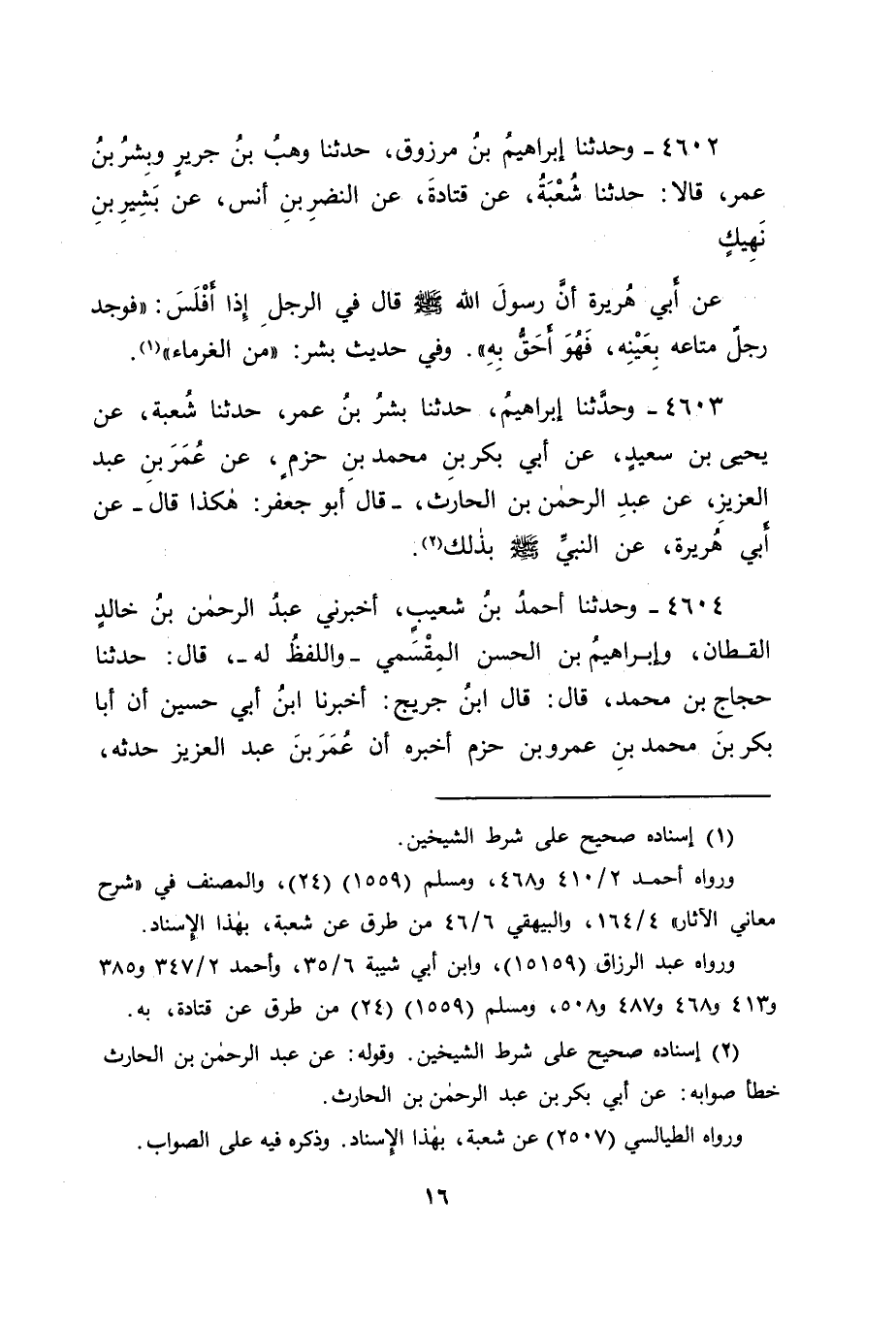 4604 - وَحَدَّثَنَا أَحْمَدُ بْنُ شُعَيْبٍ , أَخْبَرَنِي عَبْدُ الرَّحْمَنِ بْنُ خَالِدٍ الْقَطَّانُ، وَإِبْرَاهِيمُ بْنُ الْحَسَنِ الْمِقْسَمِيُّ، وَاللَّفْظُ لَهُ قَالَ: حَدَّثَنَا حَجَّاجُ بْنُ مُحَمَّدٍ قَالَ: قَالَ ابْنُ جَرِيحٍ: أَخْبَرَنَا ابْنُ أَبِي حُسَيْنٍ أَنَّ أَبَا بَكْرِ بْنَ مُحَمَّدِ بْنِ عَمْرِو بْنِ حَزْمٍ، أَخْبَرَهُ أَنَّ عُمَرَ بْنَ عَبْدِ الْعَزِيزِ، حَدَّثَهُ، -[17]- عَنْ أَبِي بَكْرِ بْنِ عَبْدِ الرَّحْمَنِ، عَنْ أَبِي هُرَيْرَةَ عَنِ النَّبِيِّ صَلَّى اللَّهُ عَلَيْهِ وَسَلَّمَ فِي الرَّجُلِ يَعْدَمُ إِذَا وُجِدَ عِنْدَهُ الْمَتَاعُ بِعَيْنِهِ، وَعَرَفَهُ أَنَّهُ لِصَاحِبِهِ الَّذِي بَاعَهُ " قَالَ أَبُو جَعْفَرٍ: وَقَدْ كُنَّا نَقُولُ فِي هَذَا الْحَدِيثِ: إِنَّ قَوْلَ رَسُولِ اللهِ صَلَّى اللَّهُ عَلَيْهِ وَسَلَّمَ فِيهِ: " فَوَجَدَ رَجُلٌ مَالَهُ بِعَيْنِهِ " أَنَّ ذَلِكَ قَدْ يَحْتَمِلُ أَنْ يَكُونَ أُرِيدَ بِهِ الْوَدَائِعُ وَالْعَوَارِي، وَأَشْبَاهُهُمَا، الَّتِي مَلْكُ وَاجِدِهَا قَائِمٌ فِيهَا، لَيْسَتِ الْأَشْيَاءُ الْمَبِيعَاتُ الَّتِي لَيْسَتْ لِوَاجِدِهَا حِينَئِذٍ، وَإِنَّمَا هِيَ أَشْيَاءُ قَدْ كَانَتْ لَهُ، فَزَالَ مُلْكُهُ عَنْهَا، كَمَا يَقُولُ أَبُو حَنِيفَةَ وَأَصْحَابُهُ فِي ذَلِكَ، وَقَدْ كَانَ بَعْضُ النَّاسِ مِمَّنْ يَذْهَبُ فِي ذَلِكَ مَذْهَبَ مَالِكٍ، وَمَنْ تَابَعَهُ عَلَى قَوْلِهِ فِي ذَلِكَ يَحْتَجُّ عَلَيْنَا فِي ذَلِكَ