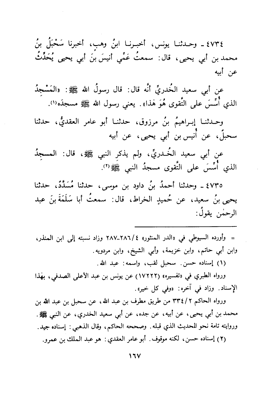 4734 - وَحَدَّثَنَا يُونُسُ , أَخْبَرَنَا ابْنُ وَهْبٍ , أَخْبَرَنَا سَحْبَلُ بْنُ مُحَمَّدِ بْنِ أَبِي يَحْيَى قَالَ: سَمِعْتُ عَمِّي أُنَيْسَ بْنَ أَبِي يَحْيَى يُحَدِّثُ، عَنْ أَبِيهِ عَنْ أَبِي سَعِيدٍ الْخُدْرِيِّ أَنَّهُ قَالَ: قَالَ رَسُولُ اللهِ صَلَّى اللَّهُ عَلَيْهِ وَسَلَّمَ: " الْمَسْجِدُ الَّذِي أُسِّسَ عَلَى التَّقْوَى هُوَ هَذَا " يَعْنِي رَسُولُ اللهِ صَلَّى اللَّهُ عَلَيْهِ وَسَلَّمَ مَسْجِدَهُ