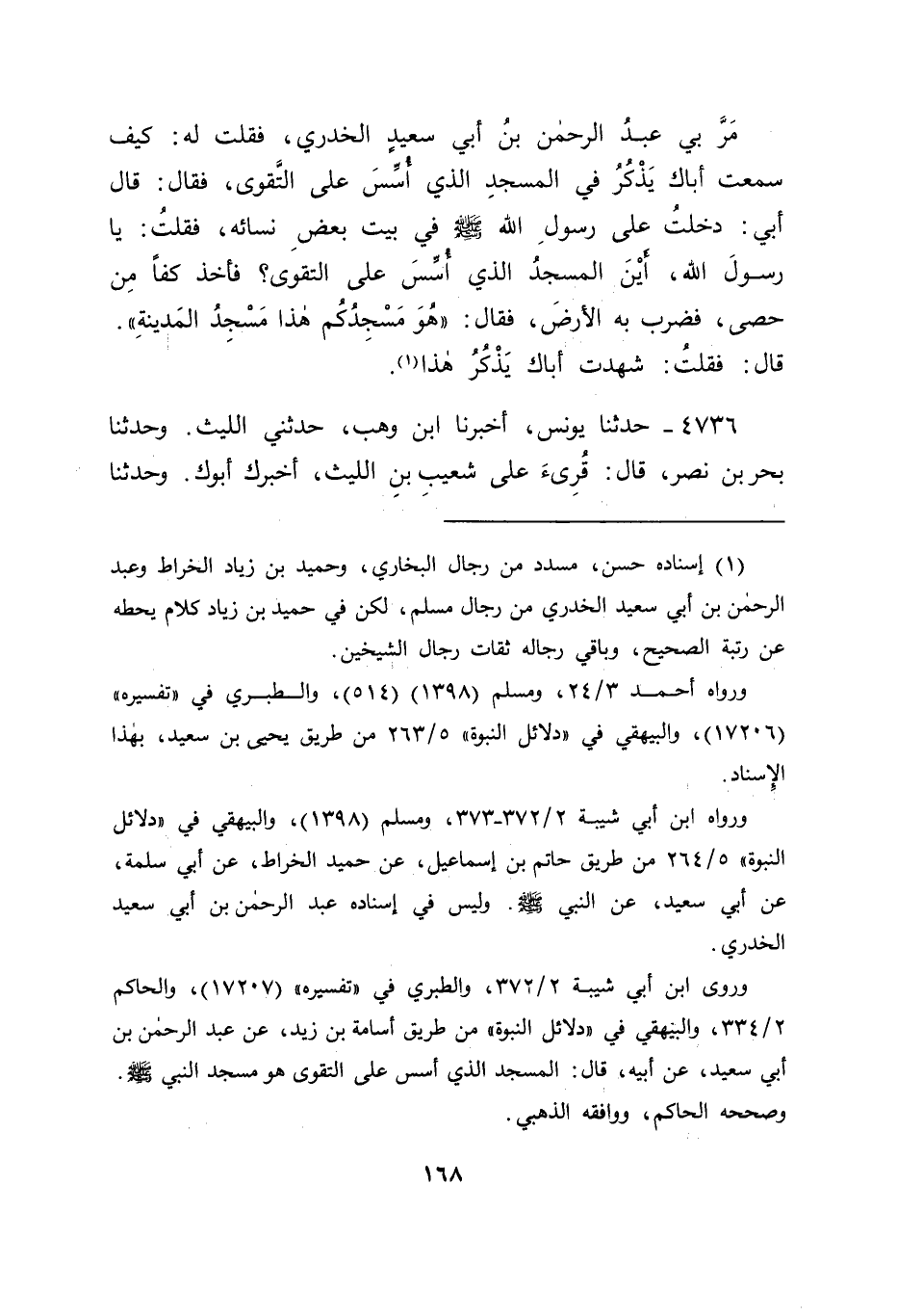 4736 - حَدَّثَنَا يُونُسُ , أَخْبَرَنَا ابْنُ وَهْبٍ , حَدَّثَنِي اللَّيْثُ، وَحَدَّثَنَا بَحْرُ بْنُ نَصْرٍ قَالَ: قُرِئَ عَلَى شُعَيْبِ بْنِ اللَّيْثِ، أَخْبَرَكَ أَبُوكَ، وَحَدَّثَنَا -[169]- مُحَمَّدُ بْنُ عَبْدِ اللهِ بْنِ عَبْدِ الْحَكَمِ قَالَ: أَخْبَرَنَا أَبِي، وَشُعَيْبُ بْنُ اللَّيْثِ , عَنِ اللَّيْثِ، ثُمَّ اجْتَمَعُوا، فَقَالُوا جَمِيعًا، عَنْ عِمْرَانَ بْنِ أَبِي أَنَسٍ عَنْ سَعِيدٍ بْنِ أَبِي سَعِيدٍ الْخُدْرِيِّ، عَنْ أَبِي سَعِيدٍ الْخُدْرِيِّ أَنَّهُ قَالَ: تَمَارَى رَجُلَانِ فِي الْمَسْجِدِ الَّذِي أُسِّسَ عَلَى التَّقْوَى، فَقَالَ رَجُلٌ: هُوَ مَسْجِدُ قُبَاءَ، وَقَالَ الْآخَرُ: وَهُوَ مَسْجِدُ رَسُولِ اللهِ صَلَّى اللَّهُ عَلَيْهِ وَسَلَّمَ، فَقَالَ رَسُولُ اللهِ صَلَّى اللَّهُ عَلَيْهِ وَسَلَّمَ: " هُوَ مَسْجِدِي هَذَا "