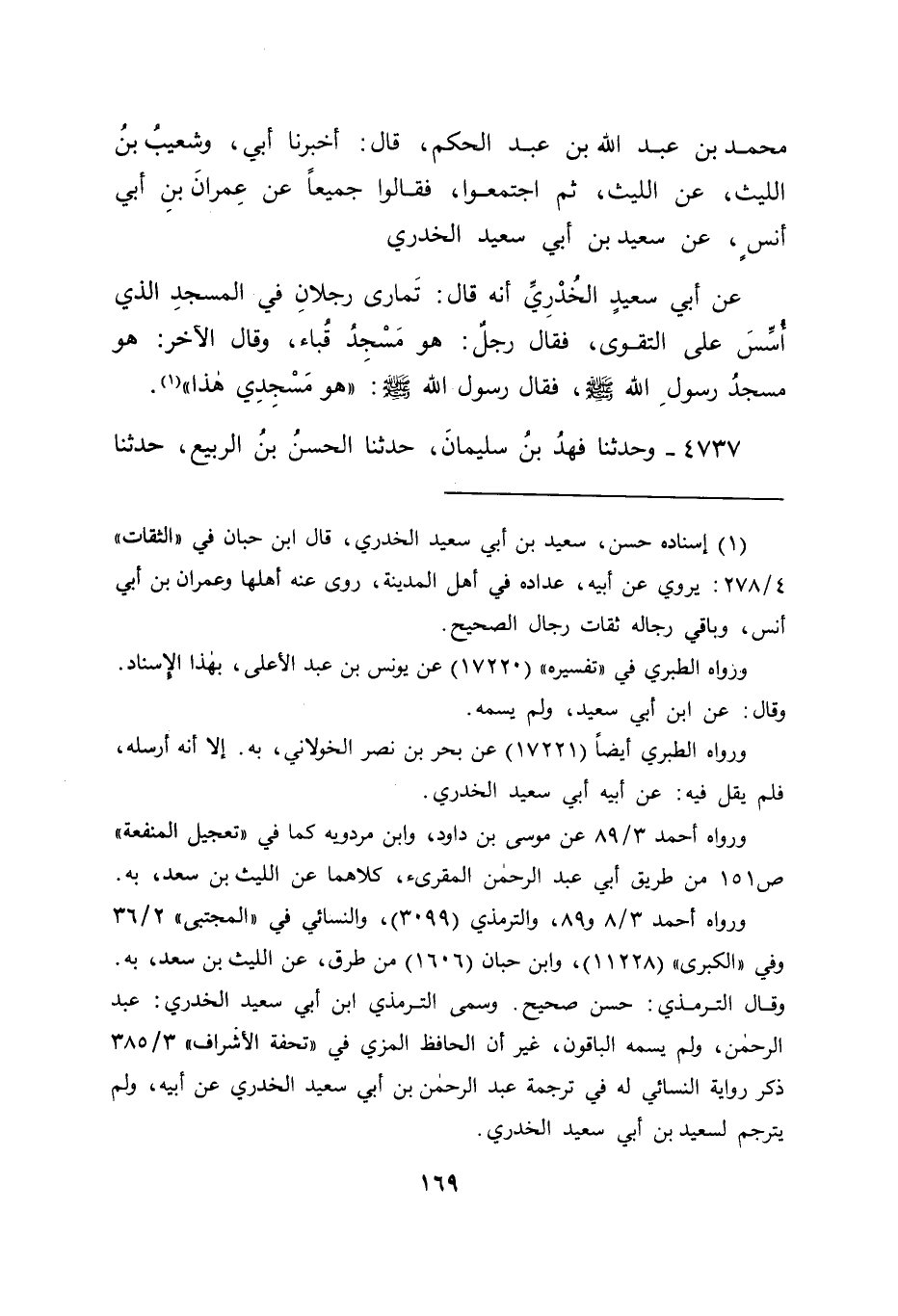 4737 - وَحَدَّثَنَا فَهْدُ بْنُ سُلَيْمَانَ , حَدَّثَنَا الْحَسَنُ بْنُ الرَّبِيعِ , حَدَّثَنَا -[170]- عَبْدُ اللهِ بْنُ إِدْرِيسَ , عَنْ رَبِيعَةَ بْنِ عُثْمَانَ , عَنْ عِمْرَانَ بْنِ أَبِي أَنَسٍ عَنْ سَهْلِ بْنِ سَعْدٍ قَالَ: تَمَارَى رَجُلَانِ فِي عَهْدِ رَسُولِ اللهِ صَلَّى اللَّهُ عَلَيْهِ وَسَلَّمَ فِي الْمَسْجِدِ الَّذِي أُسِّسَ عَلَى التَّقْوَى، أَحَدُهُمَا مِنْ أَهْلِ الْعَالِيَةِ، وَالْآخَرُ مِنْ أَهْلِ الْمَدِينَةِ، فَقَالَ أَحَدُهُمَا: هُوَ مَسْجِدُ رَسُولِ اللهِ صَلَّى اللَّهُ عَلَيْهِ وَسَلَّمَ، وَقَالَ الْآخَرُ: هُوَ مَسْجِدُ قُبَاءَ، فَذُكِرَ ذَلِكَ لِرَسُولِ اللهِ صَلَّى اللَّهُ عَلَيْهِ وَسَلَّمَ، فَقَالَ: " هُوَ مَسْجِدِي هَذَا " -[171]- قَالَ أَبُو جَعْفَرٍ: فَكَانَتْ هَذِهِ الْآثَارُ صَحِيحَةَ الْأَسَانِيدِ، مَقْبُولَةَ الرُّوَاةِ، كُلُّهَا تُخْبِرُ عَنْ رَسُولِ اللهِ صَلَّى اللَّهُ عَلَيْهِ وَسَلَّمَ غَيْرَ حَدِيثِ ابْنِ مَرْزُوقٍ الَّذِي لَمْ يَذْكُرْ فِيهِ النَّبِيُّ صَلَّى اللَّهُ عَلَيْهِ وَسَلَّمَ أَنَّهُ مَسْجِدُ رَسُولِ اللهِ صَلَّى اللَّهُ عَلَيْهِ وَسَلَّمَ وَقَدْ زَعَمَ قَوْمٌ أَنَّهُ مَسْجِدُ سَعْدِ بْنِ خَيْثَمَةَ يَعْنِي مَسْجِدَ قُبَاءَ وَذَكَرُوهُ عَنْ عُرْوَةَ بْنِ الزُّبَيْرِ
