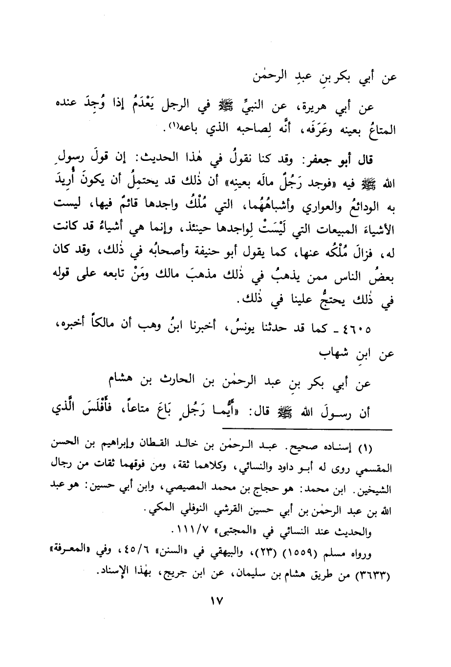 4605 - كَمَا قَدْ حَدَّثَنَا يُونُسُ، أَخْبَرَنَا ابْنُ وَهْبٍ أَنَّ مَالِكًا، أَخْبَرَهُ، عَنِ ابْنِ شِهَابٍ، عَنْ أَبِي بَكْرِ بْنِ عَبْدِ الرَّحْمَنِ بْنِ الْحَارِثِ بْنِ هِشَامٍ أَنَّ رَسُولَ اللهِ صَلَّى اللَّهُ عَلَيْهِ وَسَلَّمَ قَالَ: " أَيُّمَا رَجُلٍ بَاعَ مَتَاعًا، فَأَفْلَسَ الَّذِي -[18]- ابْتَاعَهُ، وَلَمْ يَقْبِضِ الَّذِي بَاعَهُ مِنْ ثَمَنِهِ شَيْئًا، فَوَجَدَهُ بِعَيْنِهِ، فَهُوَ أَحَقُّ بِهِ، وَإِنْ مَاتَ الْمُشْتَرِي، فَصَاحِبُ الْمَتَاعِ أُسْوَةُ الْغُرَمَاءِ " وَكُنَّا لَا نَرَى ذَلِكَ حُجَّةً لَهُ عَلَيْنَا فِي خِلَافِنَا إِيَّاهُ الَّذِي ذَكَرْنَا لِانْقِطَاعِ هَذَا الْحَدِيثِ حَتَّى